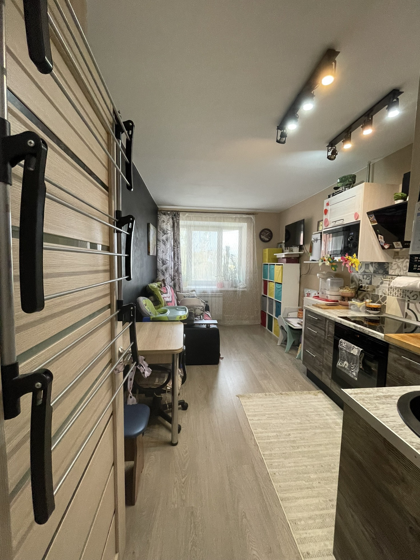 Просторная комната составляет 15,5 квадратных метров, кухня площадью 12,3 кв.м не оставит Вас равнодушными. Коридор имеет приятный бонус-вместительную гардеробную , что позволяет комфортно разместить Ваши все вещи.