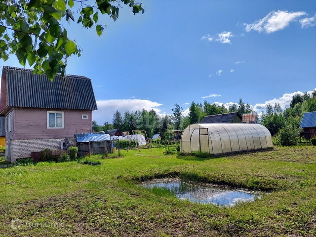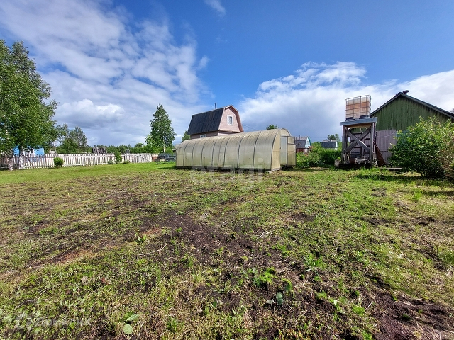 Половина участка задействована под посадки: есть грядки и теплица. Вторая часть - лужайка для отдыха.
