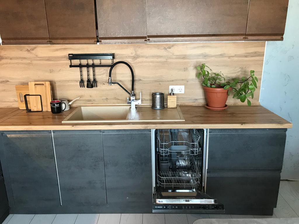 На кухне посудомойка, измельчитель бытовых отходов, встроенный в каменную мойку, 5ти ступенчатый фильтр с обратным осмосом для питьевой воды. Водоснабжение –своя скважина 70 метров, уходит в подземную реку, дебет бесконечный(вода всегда и её много). Набираем бассейн на 15 кубов за день.