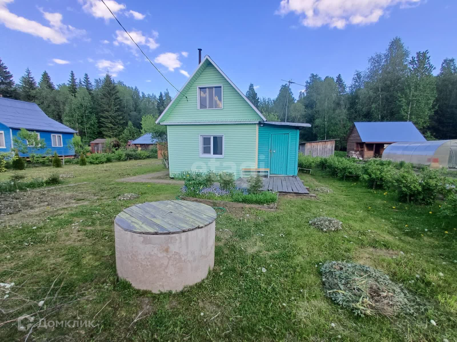На участке расположен дачный дом: каркасный наружная отделка сайдинг, крыша металлическая. Колодец 6 колец, вода подается в дом с помощью насоса, подогревается за счет проточного водонагревателя. Газ баллонный, электричество подведено, отопление печное.
