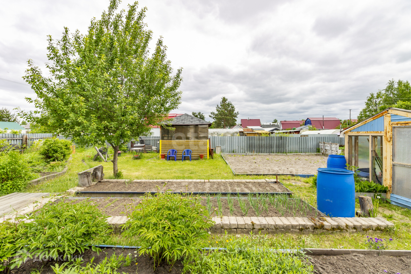 Насаждения: клубника, черная и белая смородина, жимолость, белая сирень, большое дерево ирги , калина, рябина, черемуха, малина
