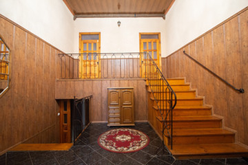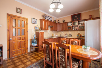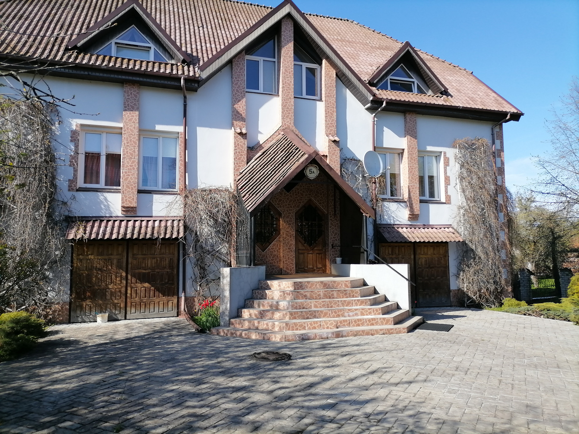 Дом расположен в черте города. Всё в шаговой доступности. 10 комнат, 4 санузла, сауна, два гаража, прачечная, подвал. Дом разделён на две половины. Две кухни, две гардеробные.