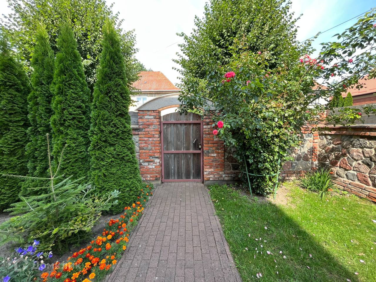 Территория дома огорожена забором, выполненным из натурального булыжника и кирпича. Сам участок ухоженный, зеленый, с очень красивым ландшафтным дизайном. На участке есть теплица, грядки, растут плодовые деревья. Есть зона отдыха с качелями.