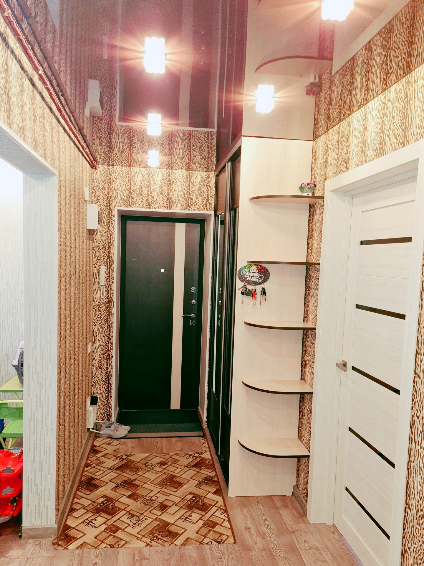Новым жильцам в подарок остаются встроенная прихожая, встроенная кухня ( с варочной поверхностью, духовым шкафом и вытяжкой), в спальне большой шкаф – купе, водонагреватель. Перепланировка узаконена.