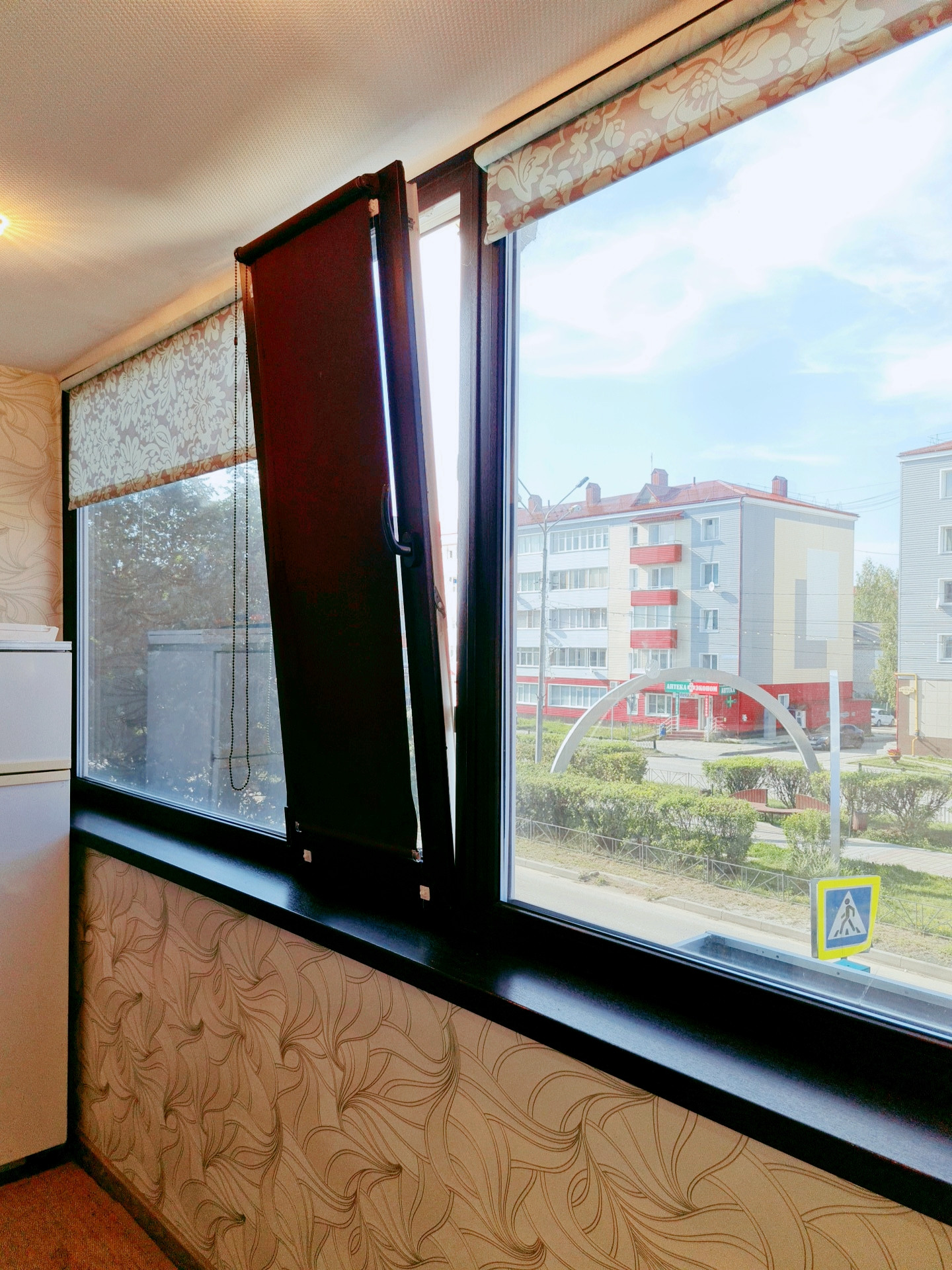 Придомовая территория облагорожена: высажены деревья, клумбы с цветами , установлены лавочки, где можно отдохнуть после прогулки или похода по магазинам. Во дворе установлен детский спортивно-игровой комплекс.