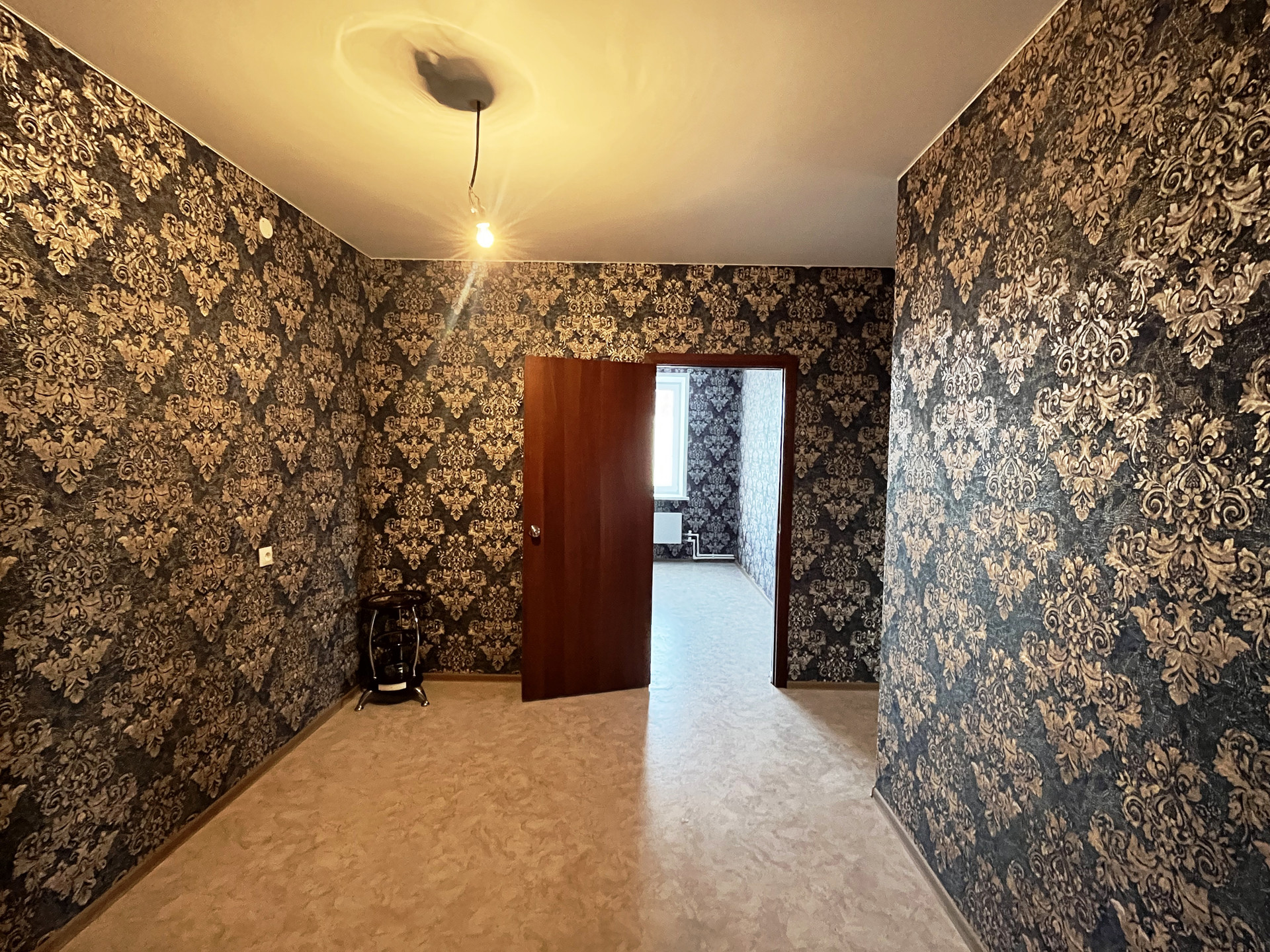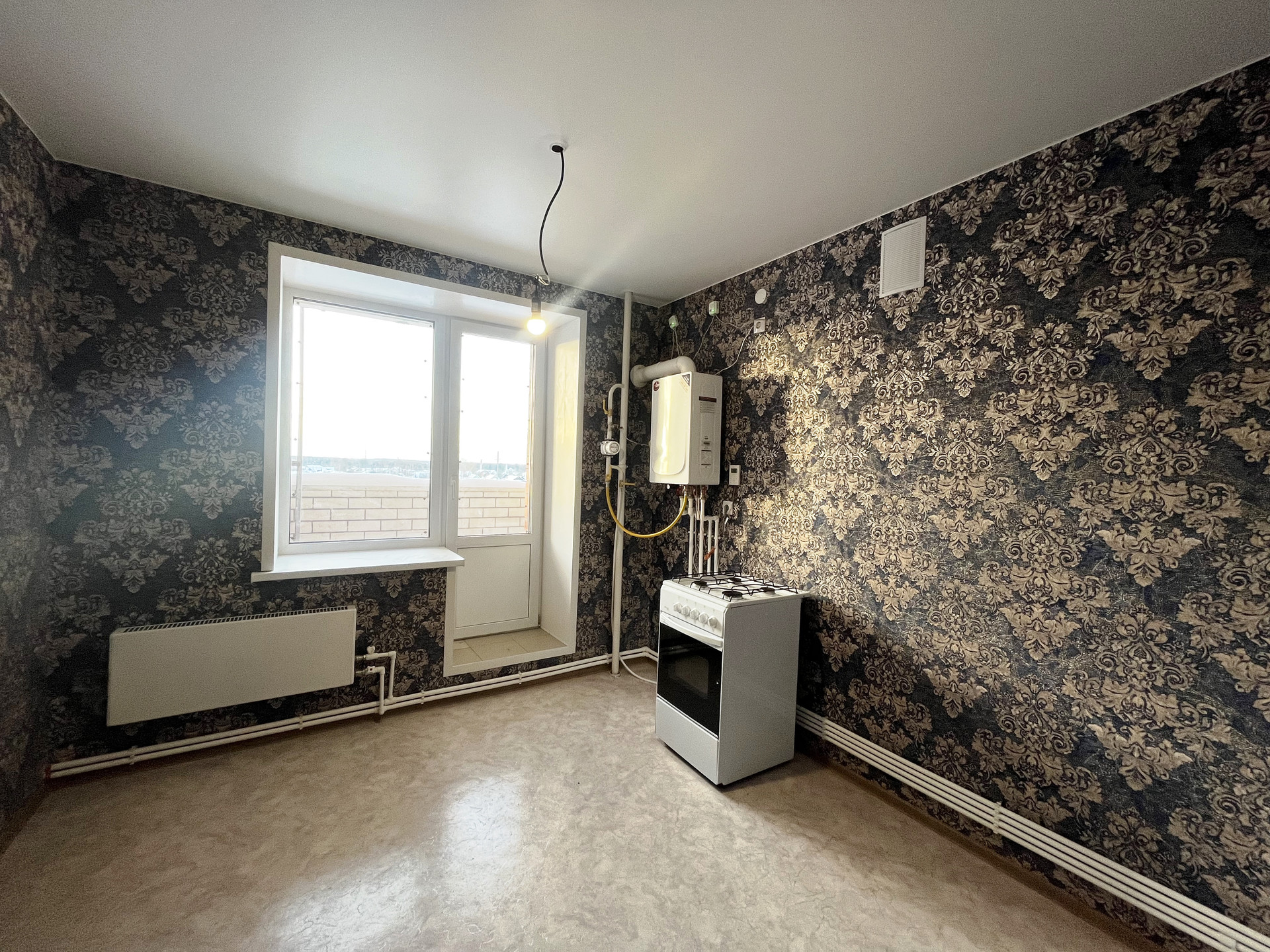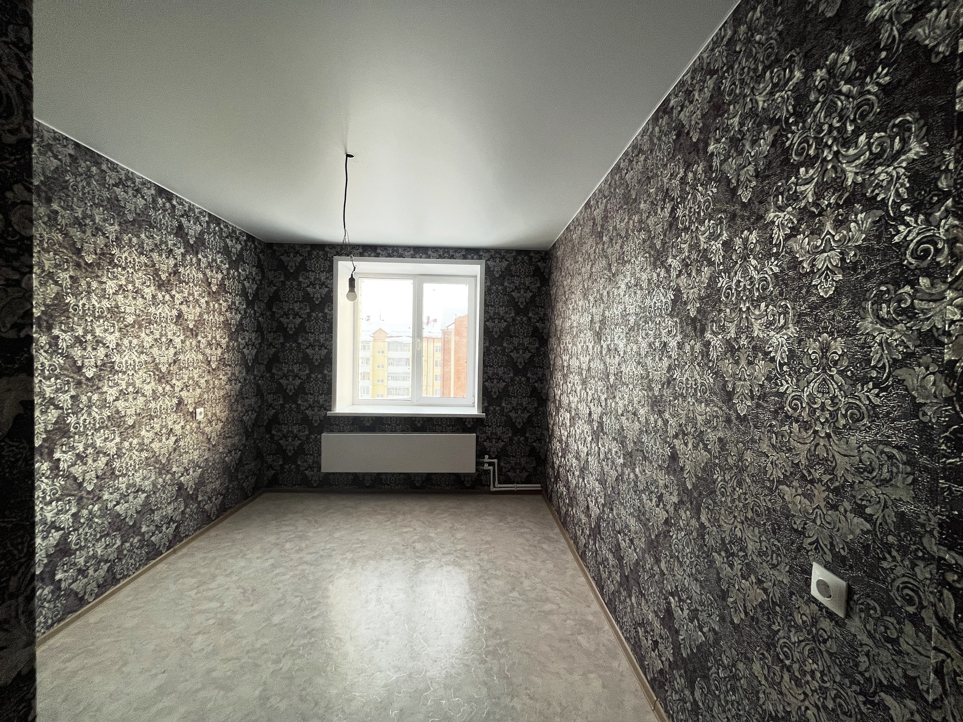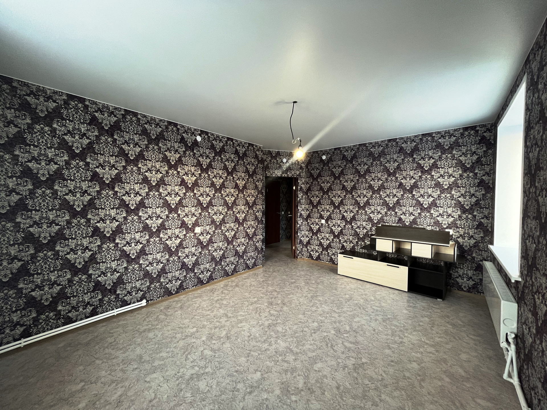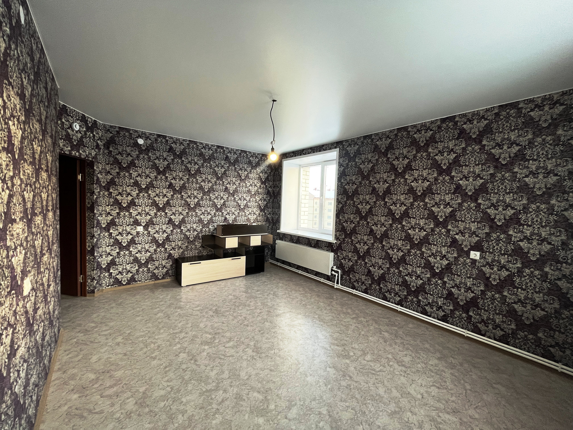 Ремонт от застройщика: на стенах обои, на полу линолеум, натяжной потолок, пластиковые стеклопакеты и балконная группа, балкон не застеклен, раздельный санузел на 1800мм от пола в кафельной плитке, металлическая дверь