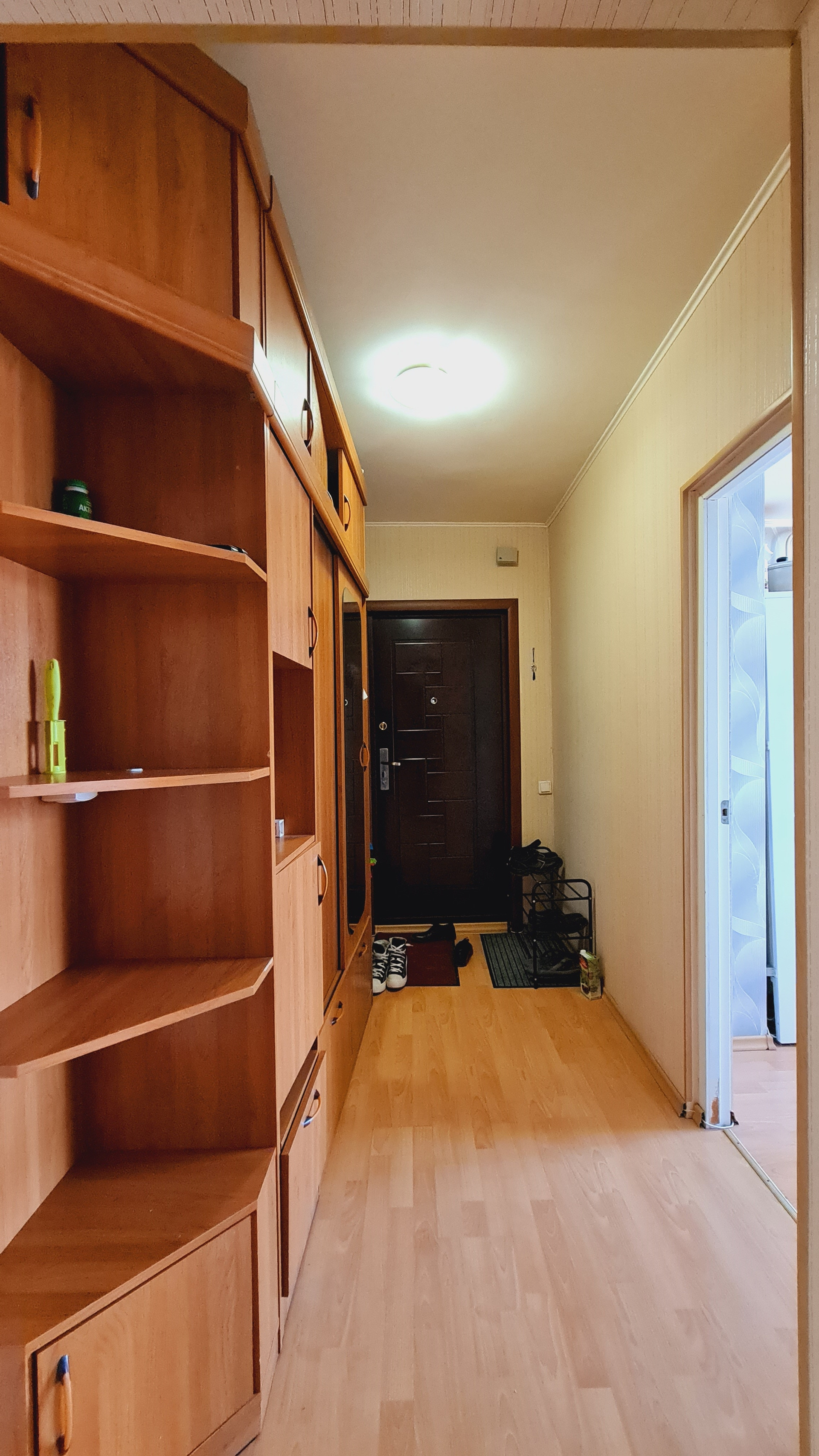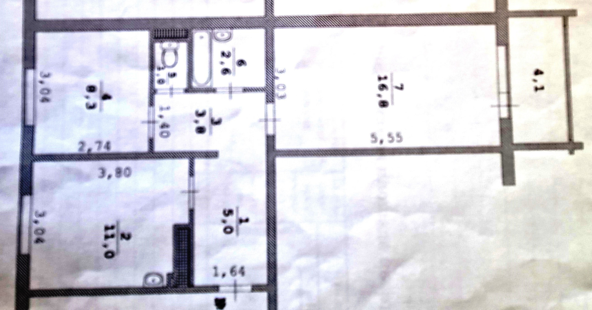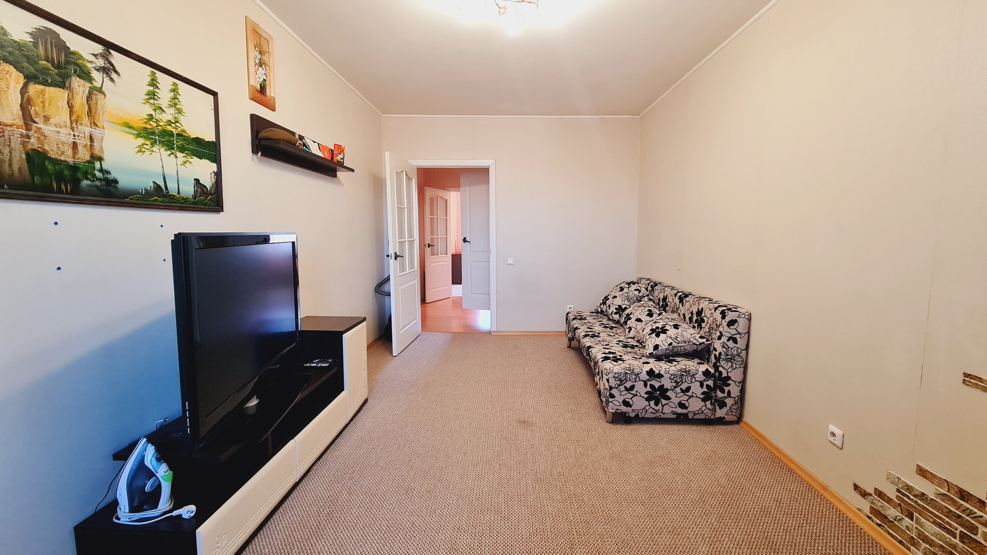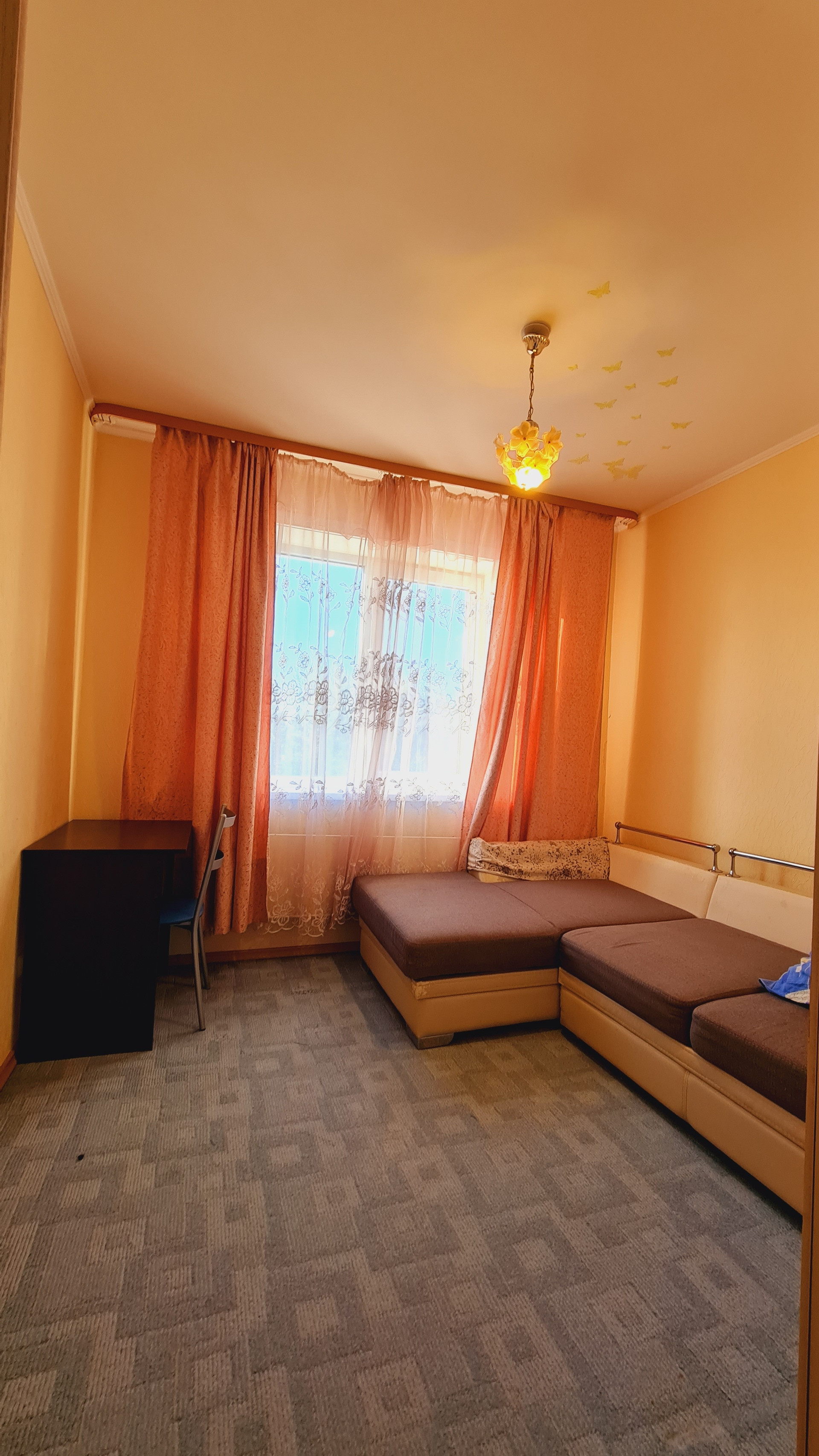 - на полу разные виды покрытий: кухня-ламинат, комнаты-ковролин, коридор- линолеум