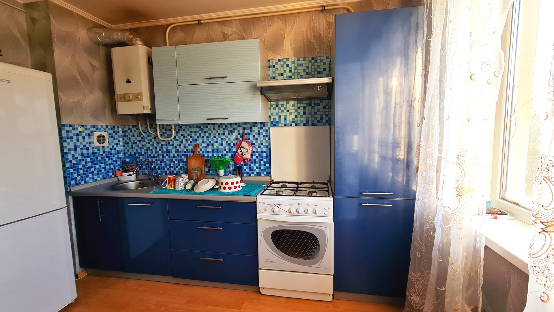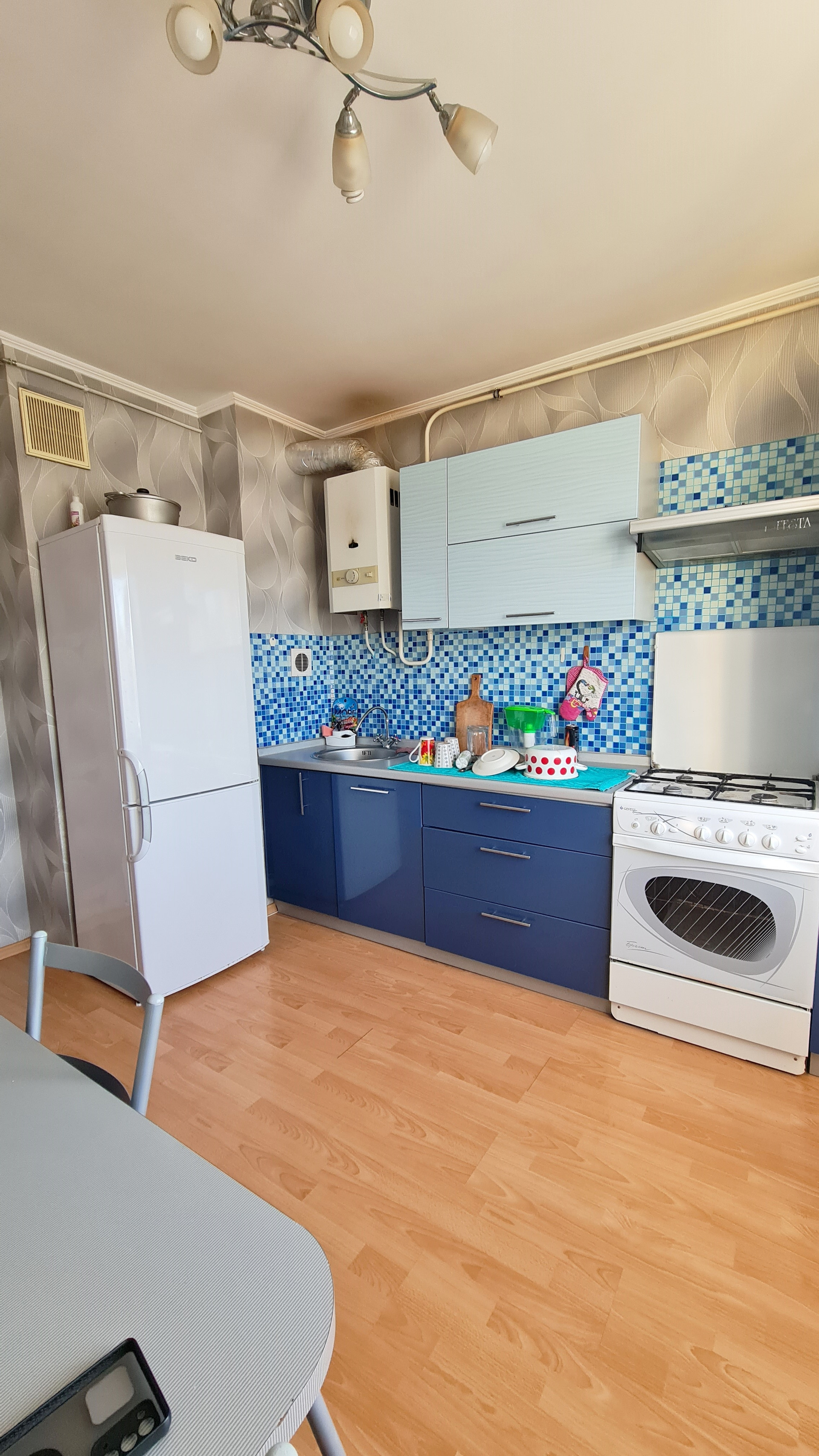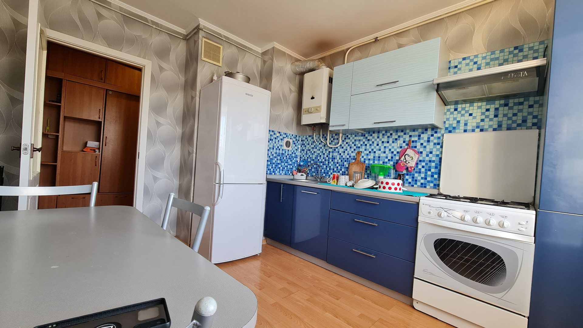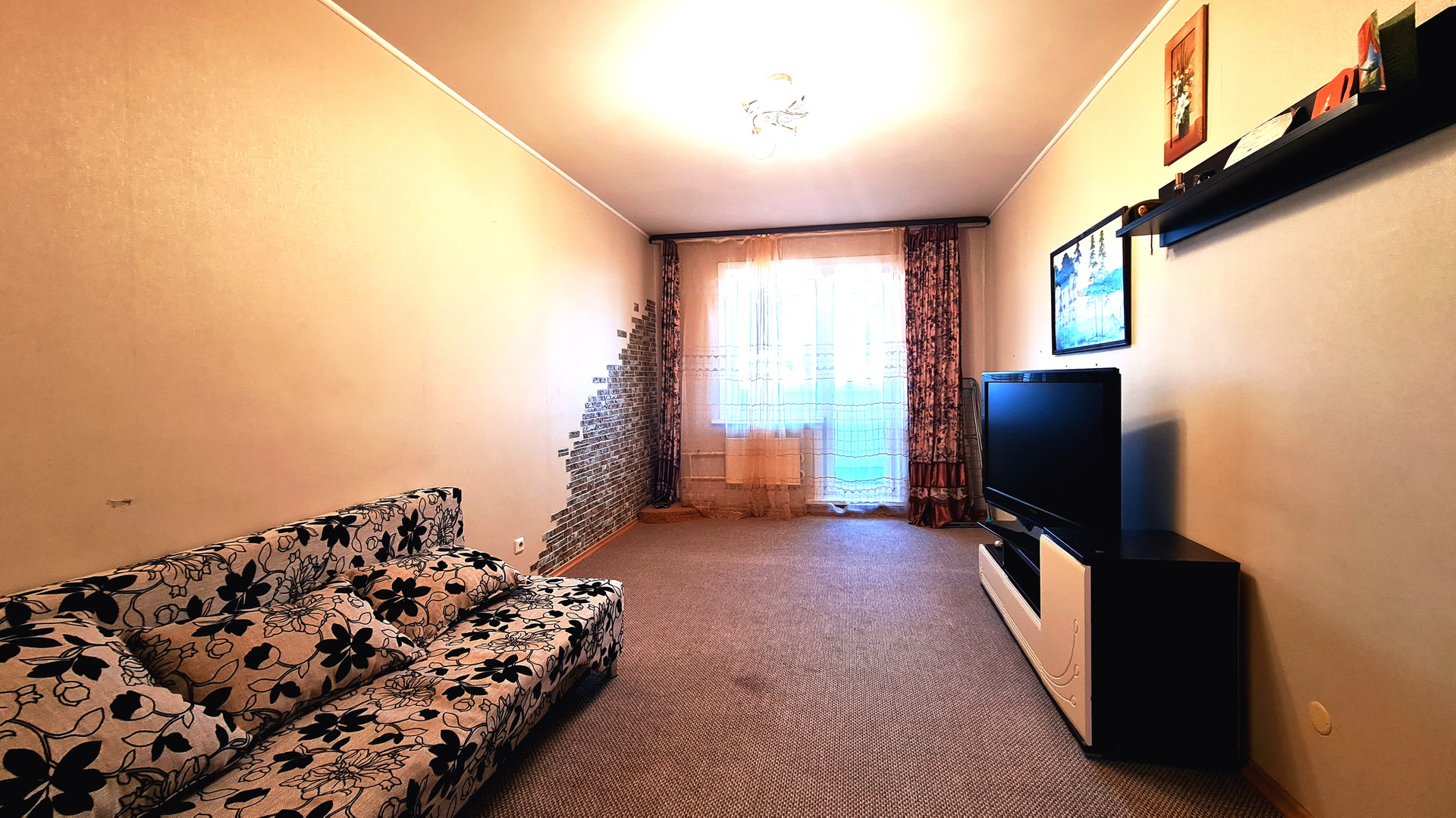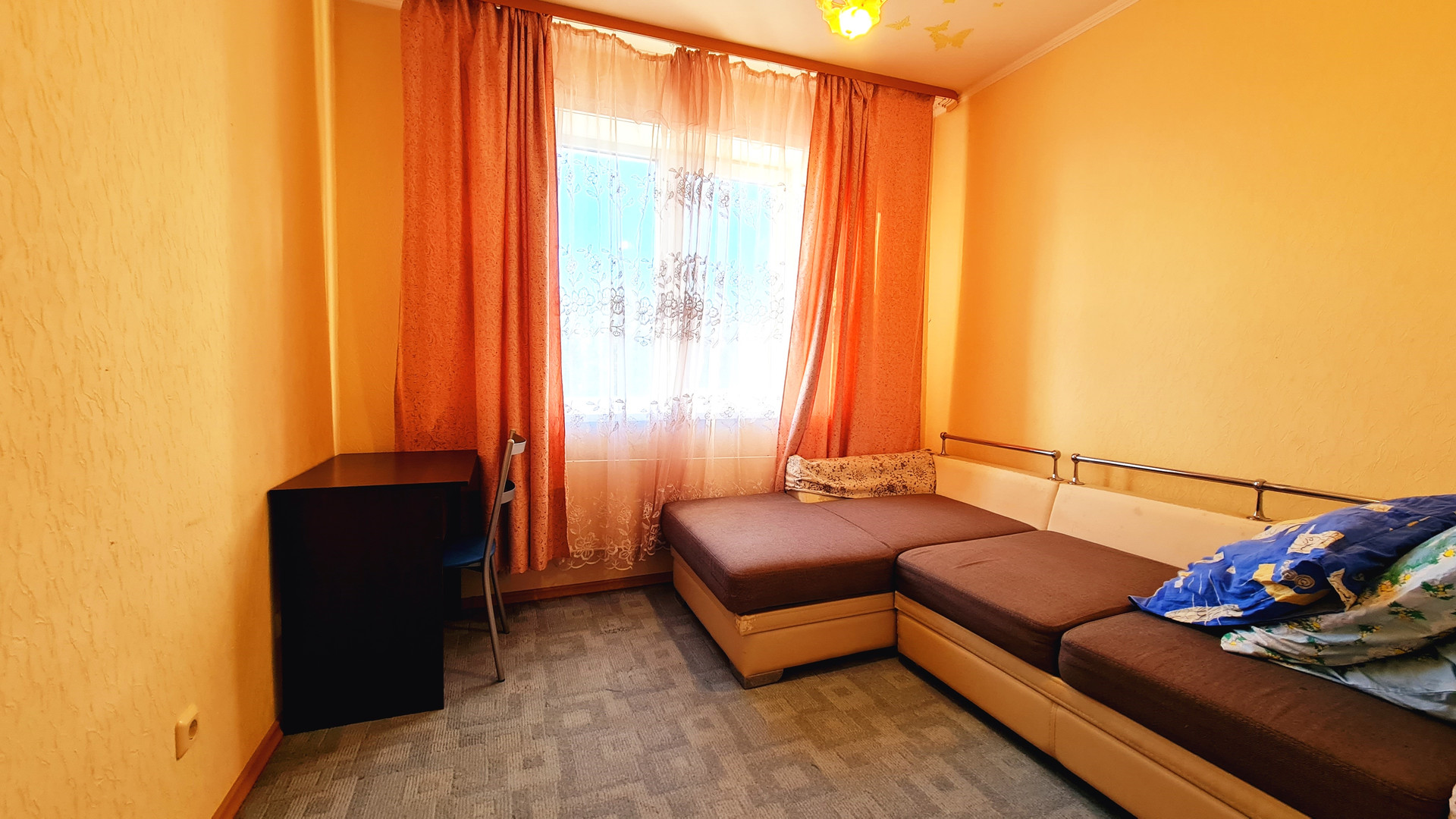- на полу разные виды покрытий: кухня-ламинат, комнаты-ковролин, коридор- линолеум