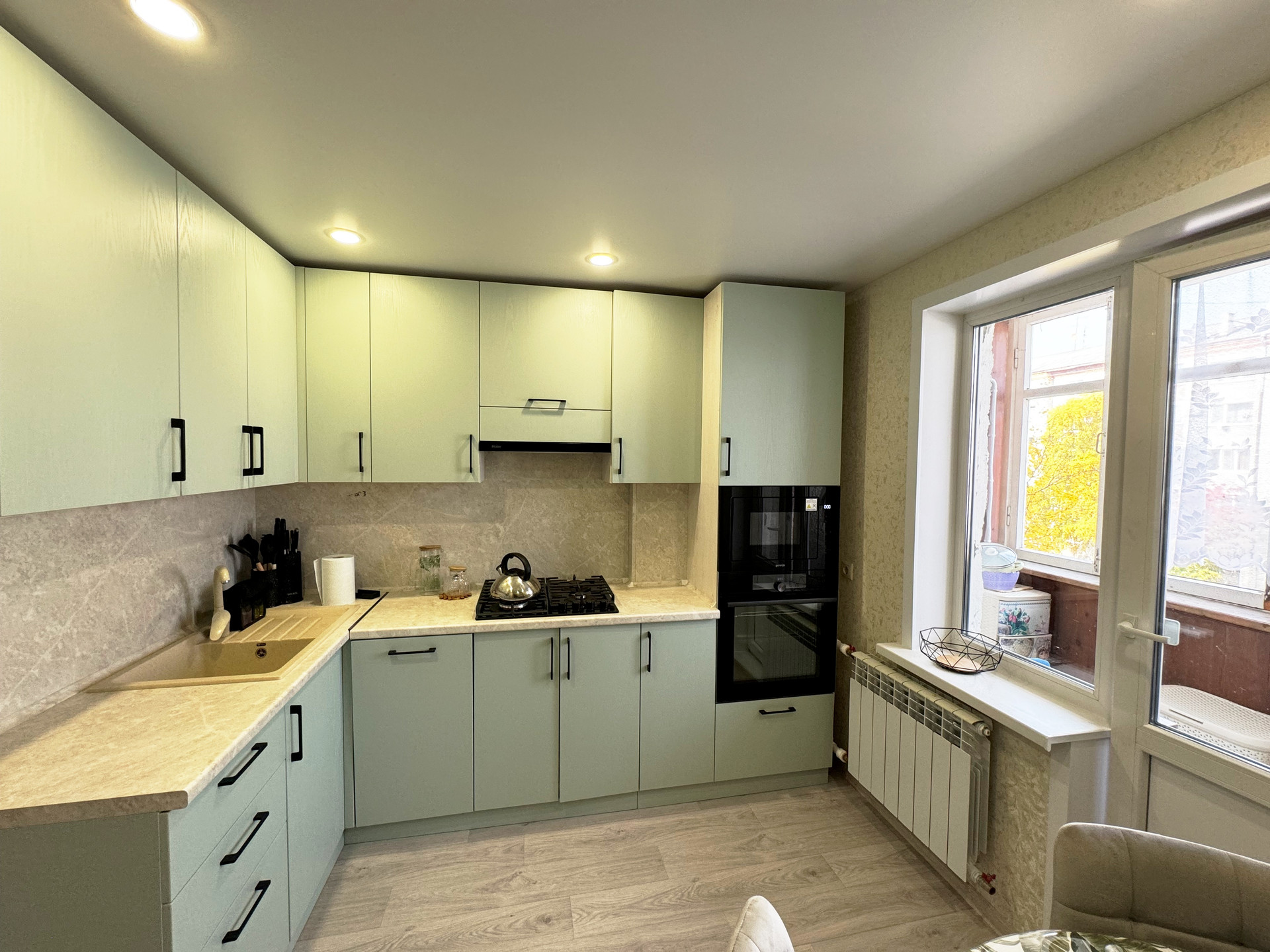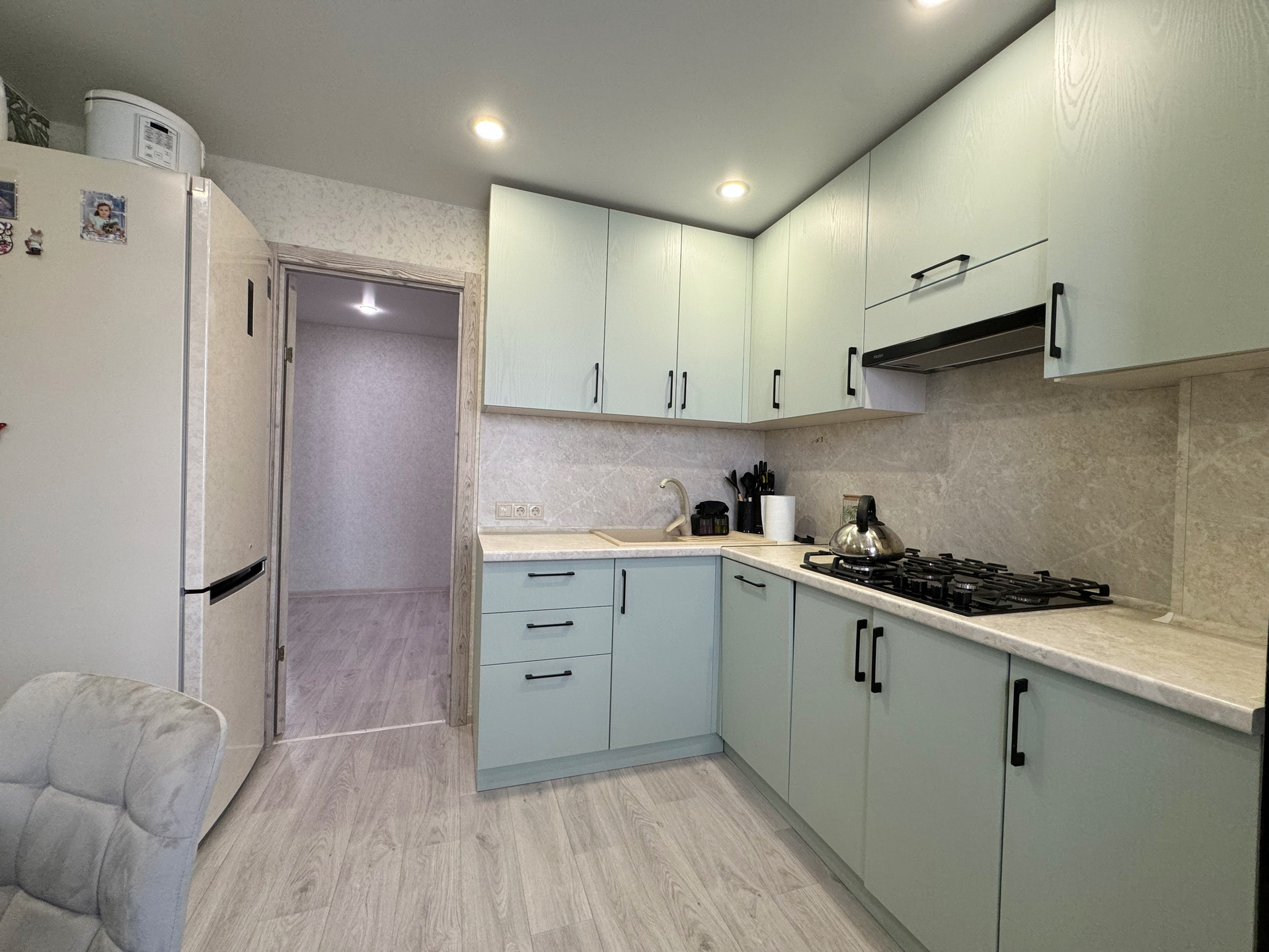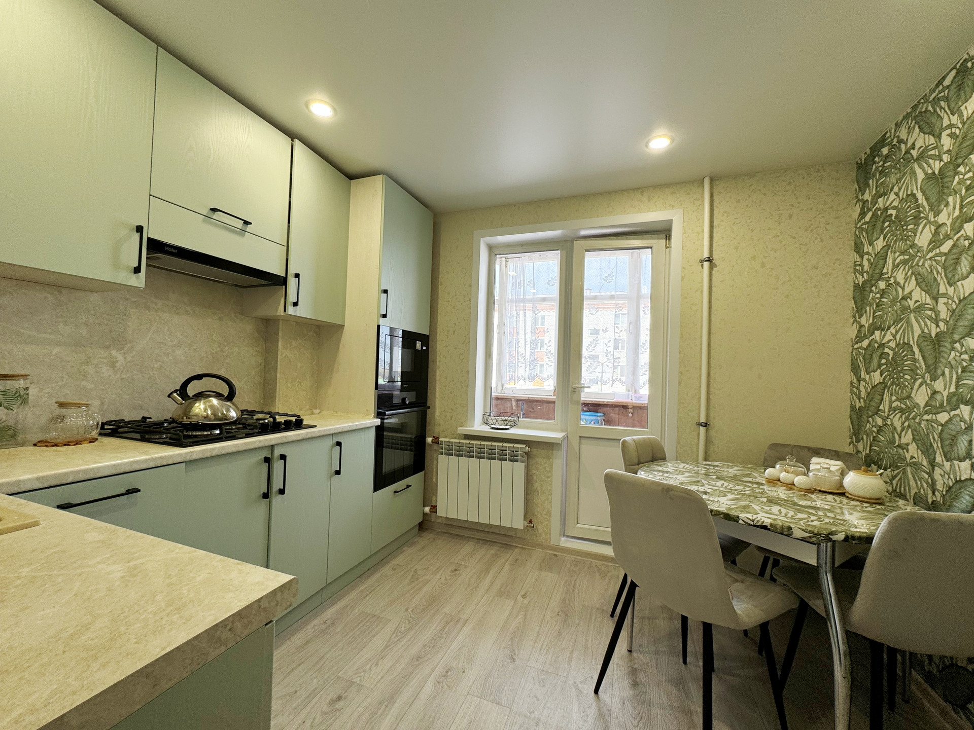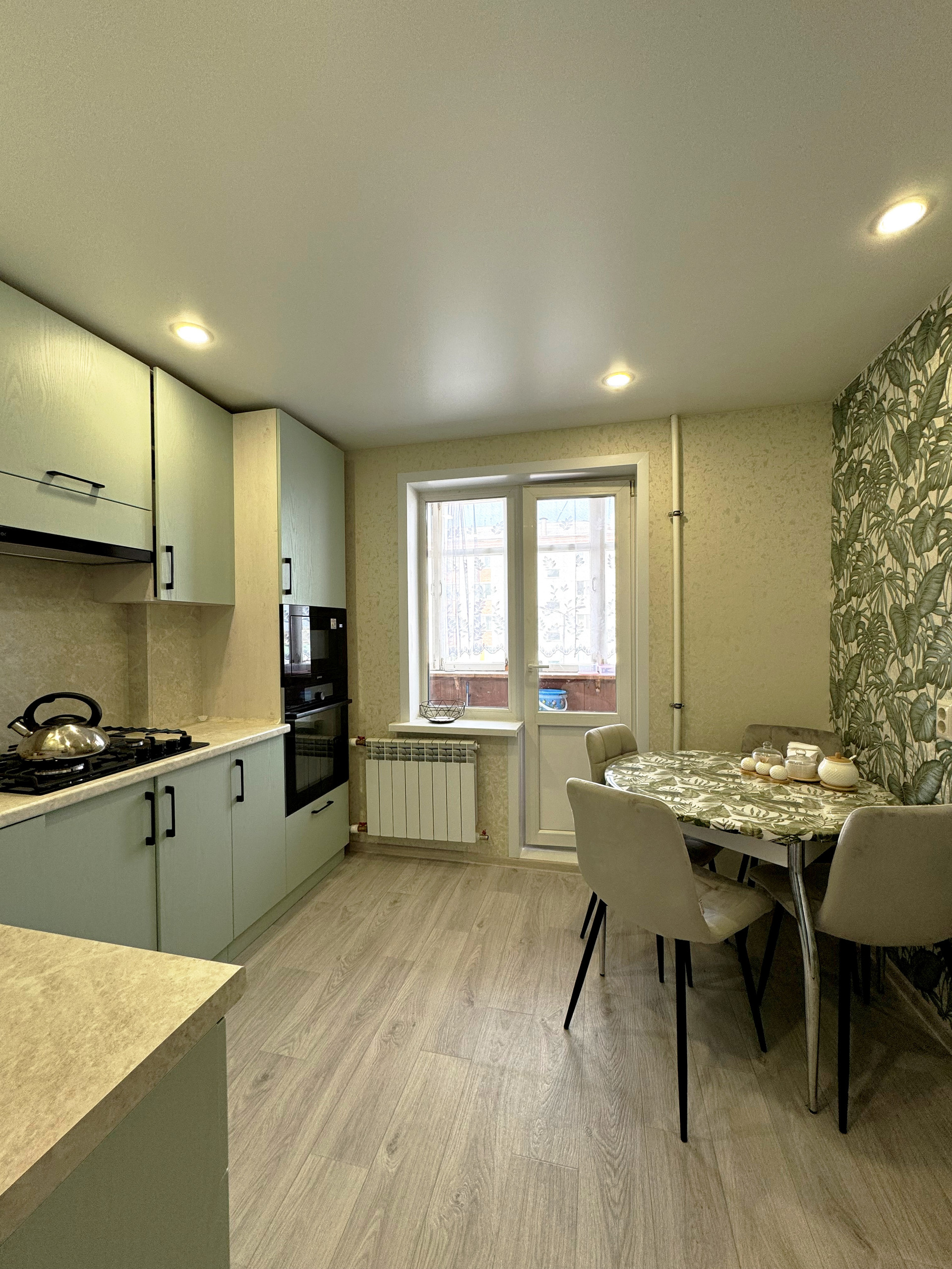 Кухня оборудована модным фисташковым гарнитуром с встроенной бытовой техникой, включая посудомоечную машину, что значительно упрощает бытовые процессы. Раздельный санузел облагорожен пластиковыми панелями, визуально не отличающимися от плитки, что обеспечивает легкость в уходе. Также заменены ванна, раковины и унитаз.