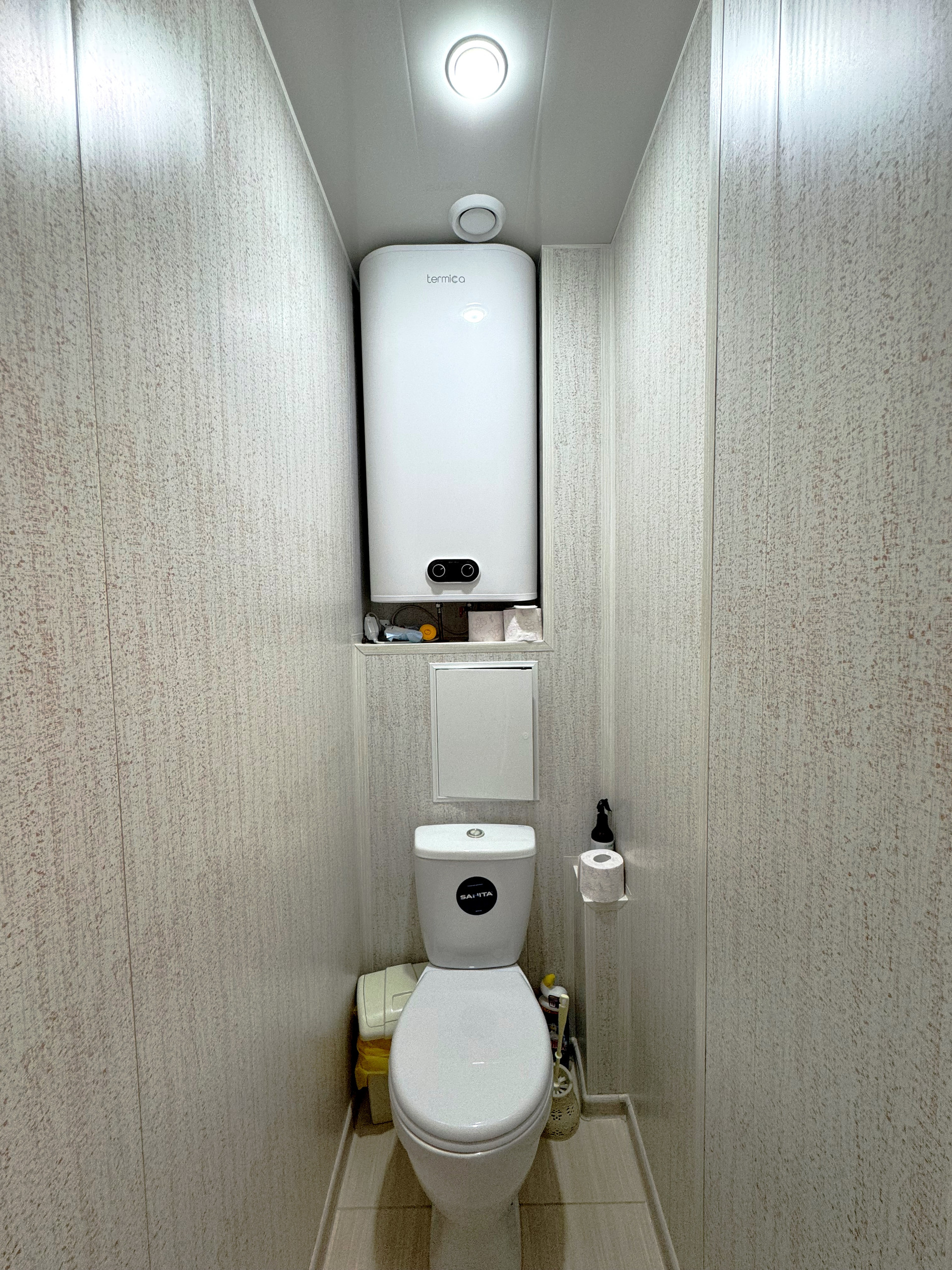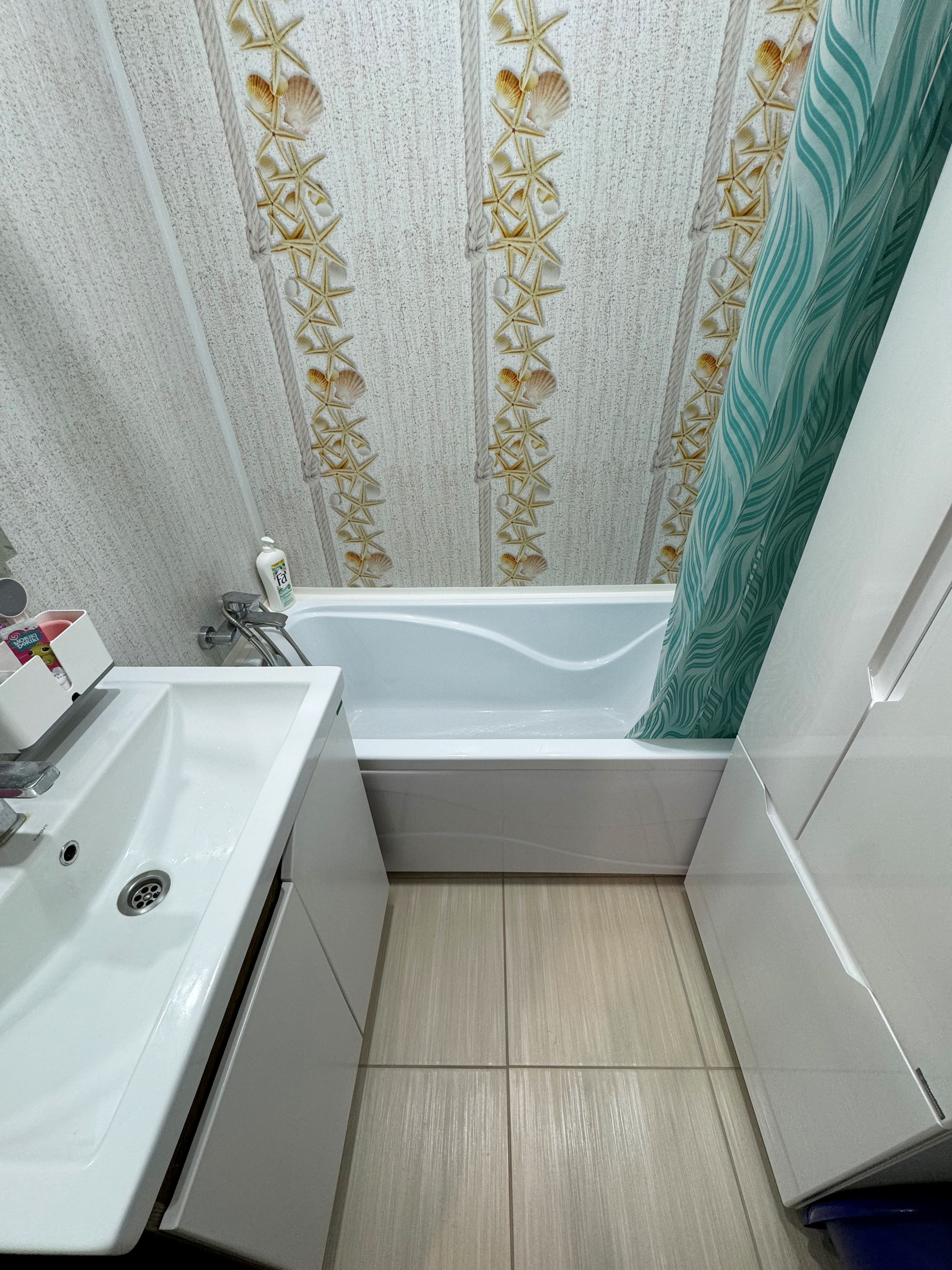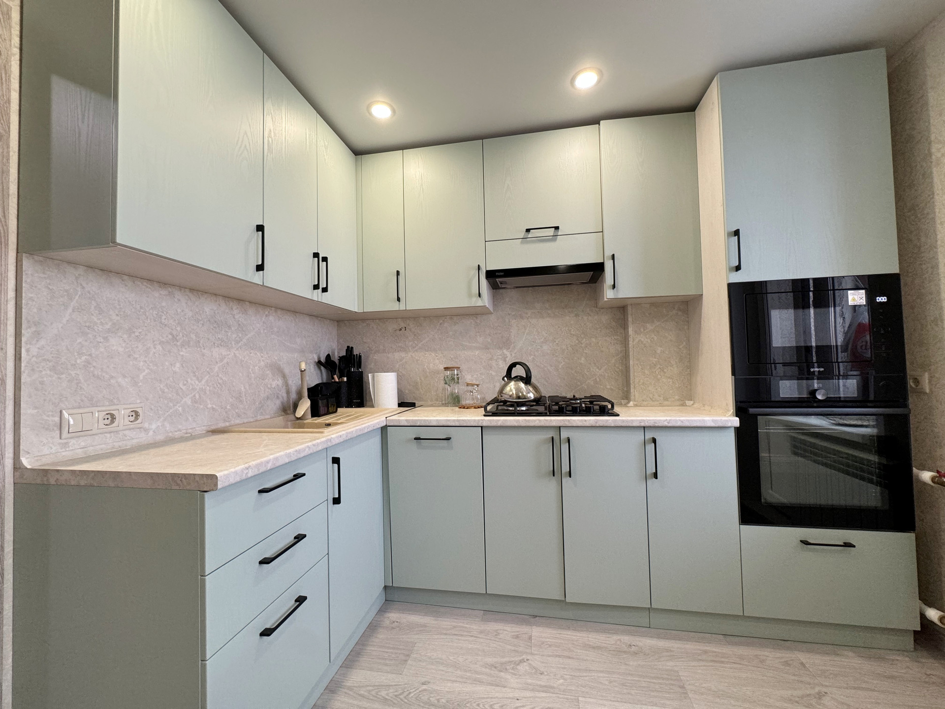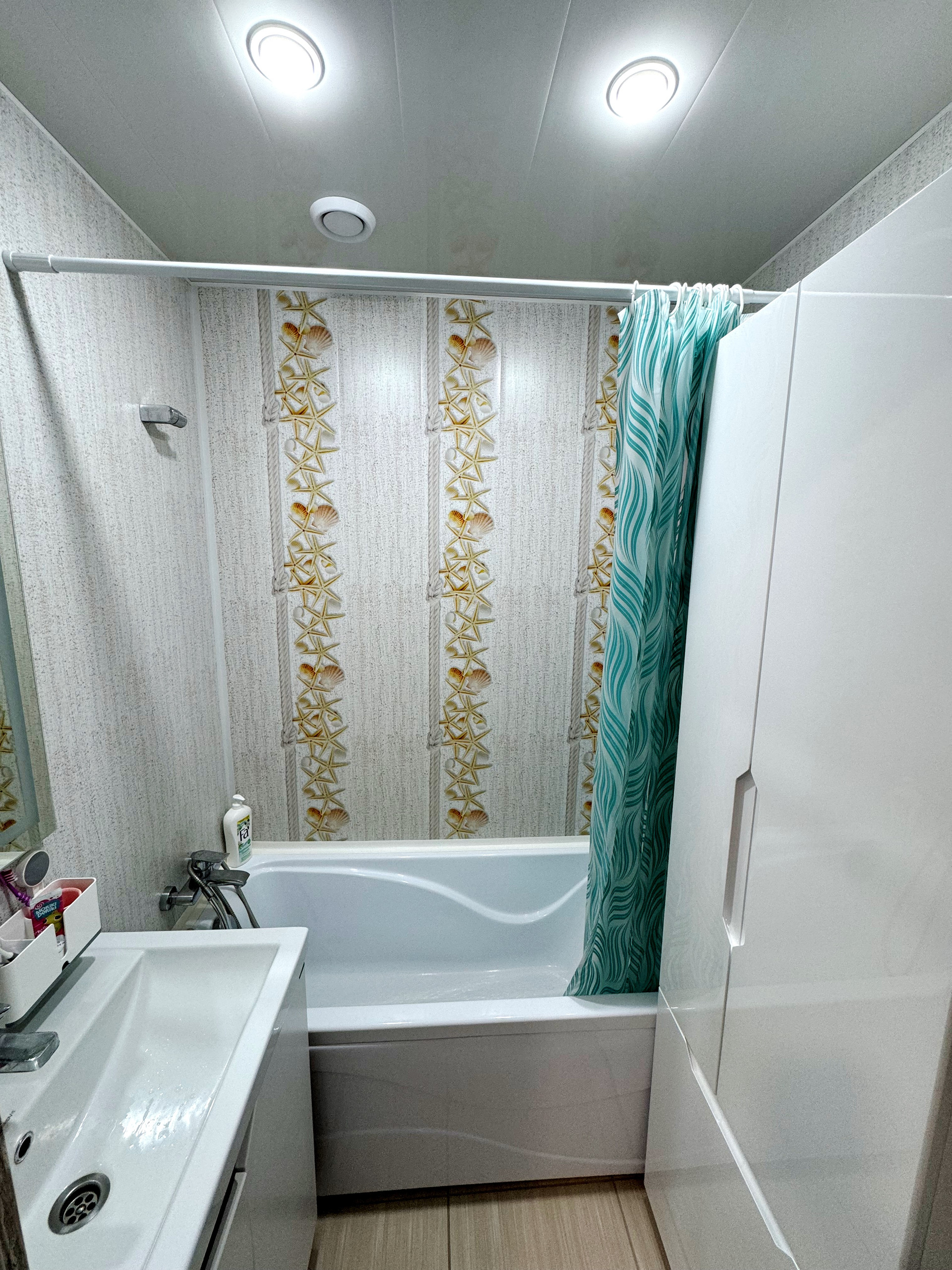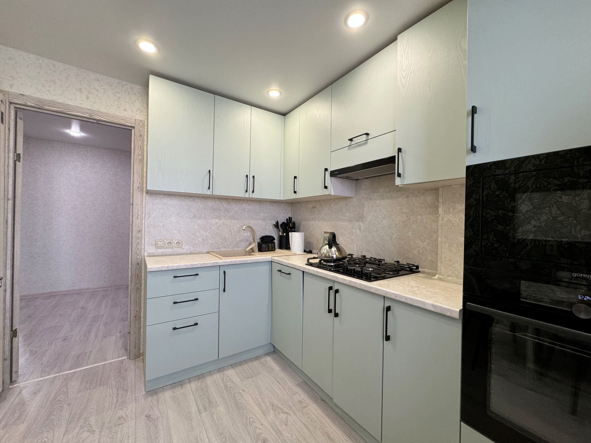 Кухня оборудована модным фисташковым гарнитуром с встроенной бытовой техникой, включая посудомоечную машину, что значительно упрощает бытовые процессы. Раздельный санузел облагорожен пластиковыми панелями, визуально не отличающимися от плитки, что обеспечивает легкость в уходе. Также заменены ванна, раковины и унитаз.