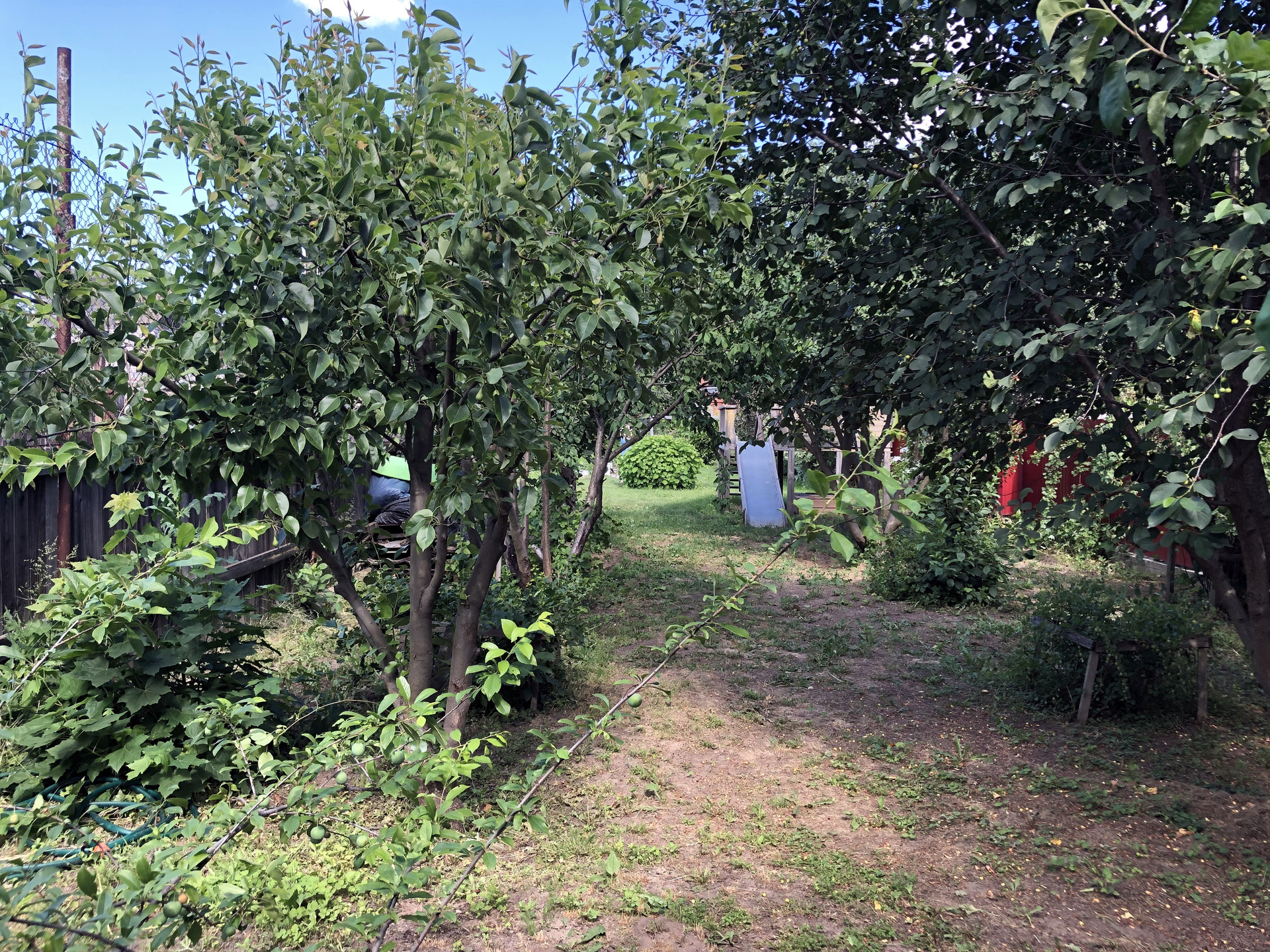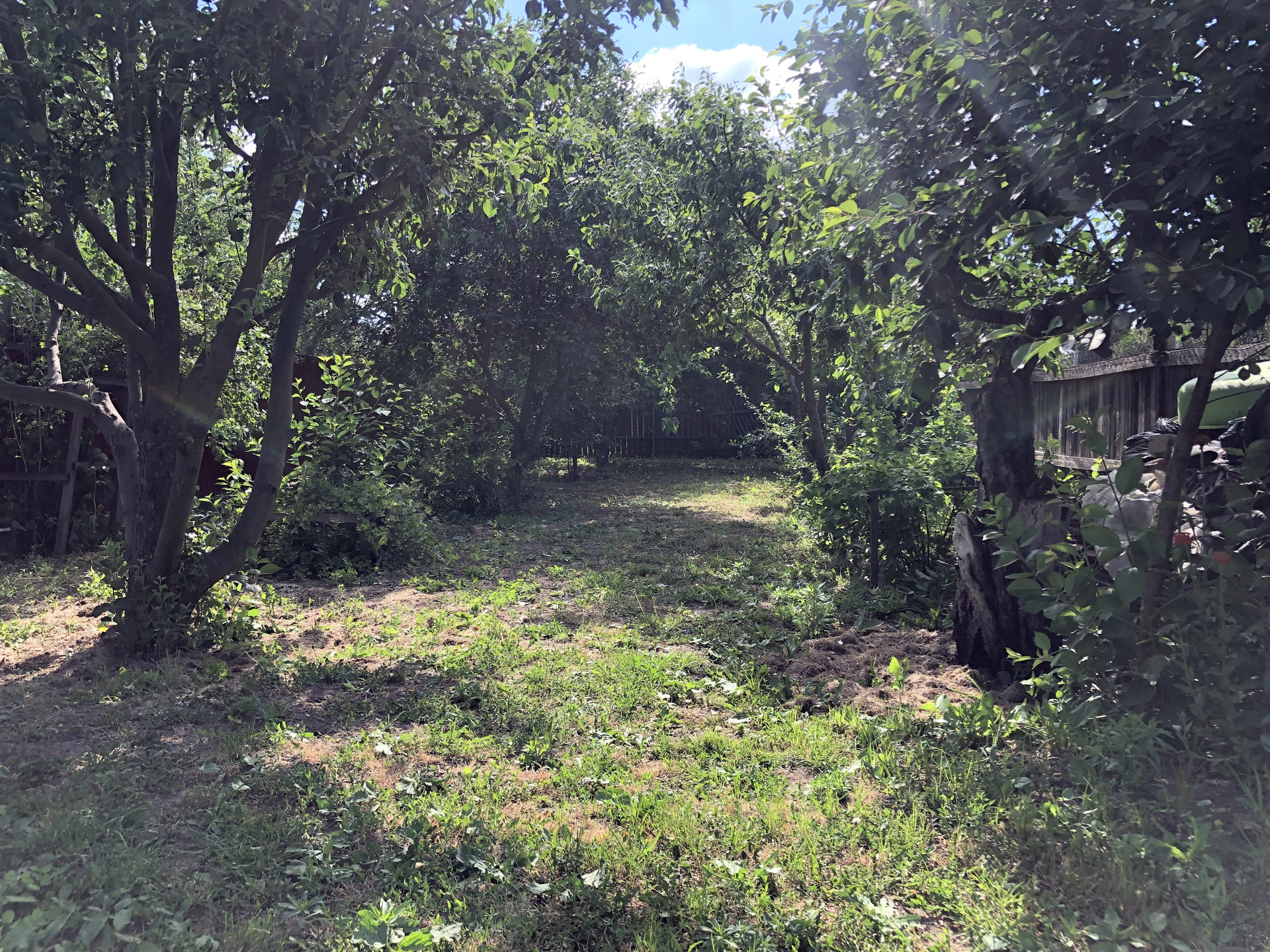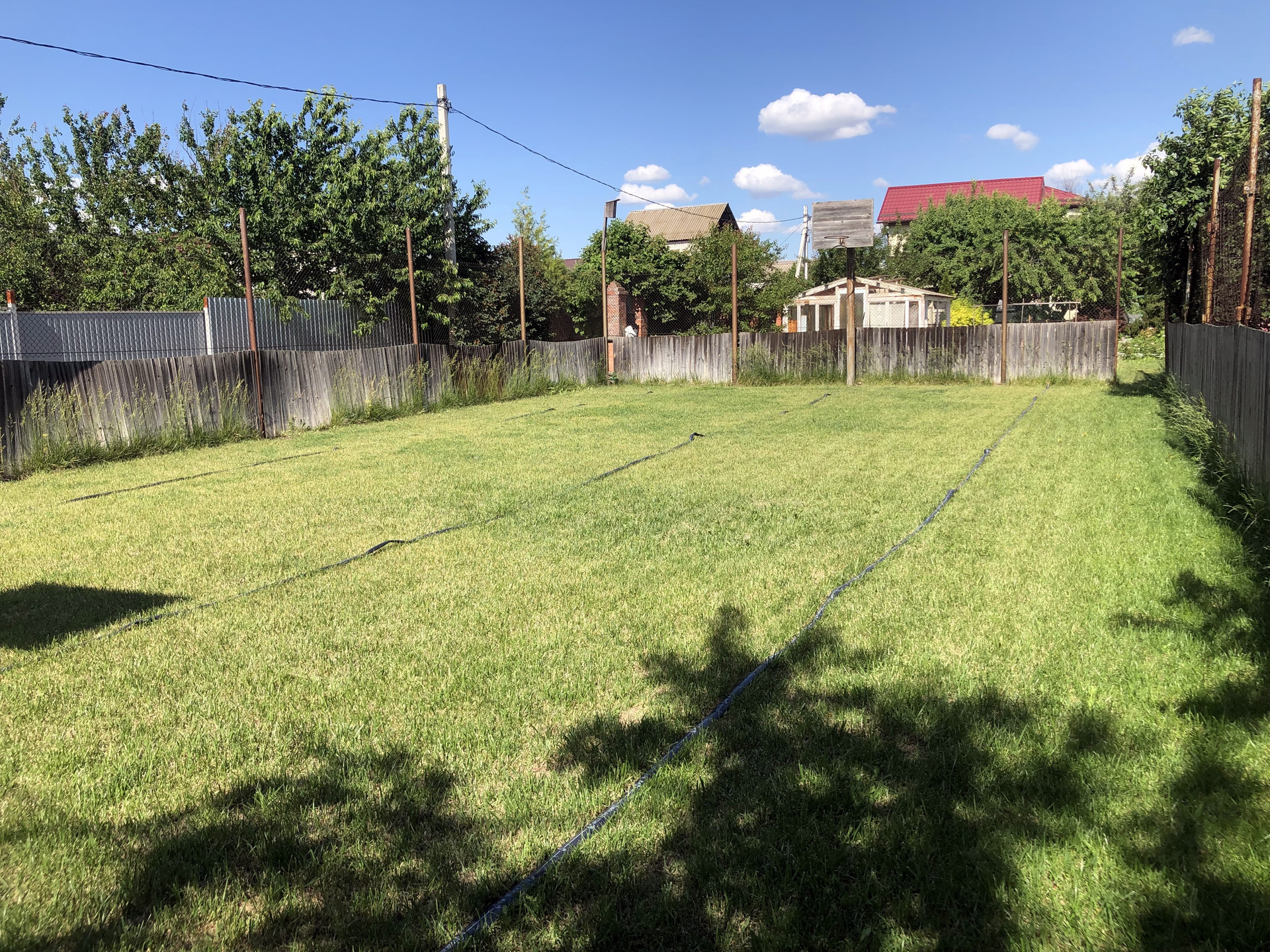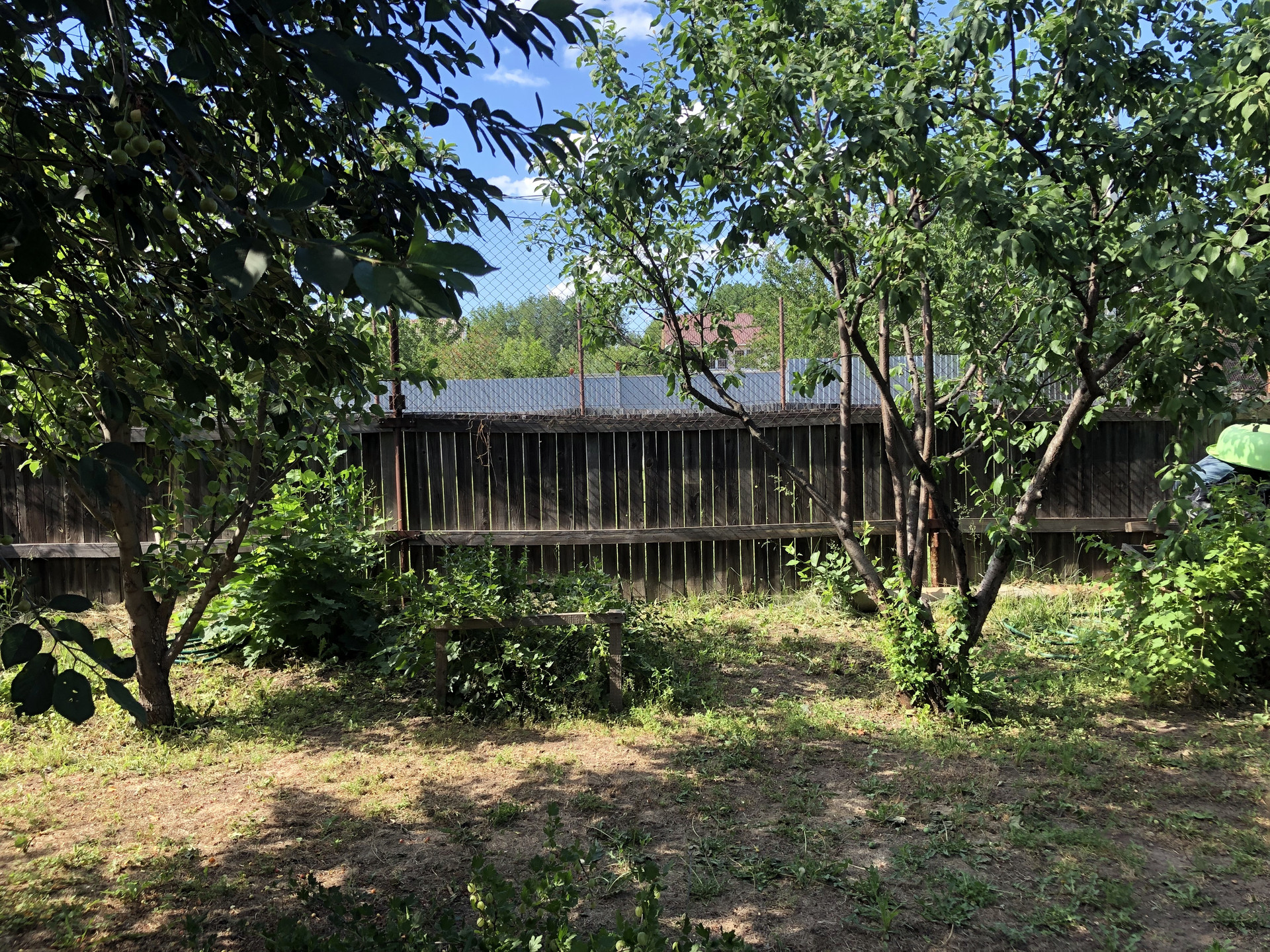 Участок разделен на две "зоны". На одном участке ухоженный газон. Использовался как спортивная площадка (есть два баскетбольных щита). Площадь данного участка 3,5 сотки. На втором прилегающем участке разбит сад, на котором растут плодоносящие деревья: яблоня, груша, ранняя вишня, черешня. Есть смородина, ежевика, крыжовник.