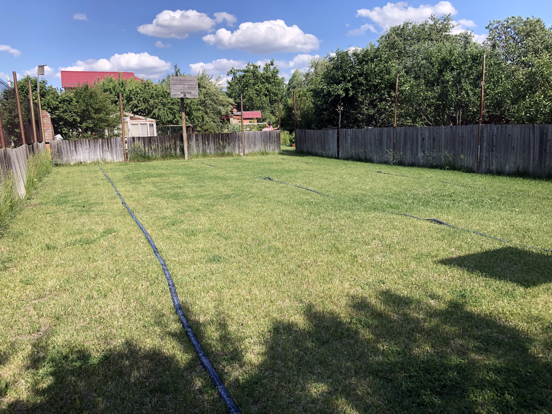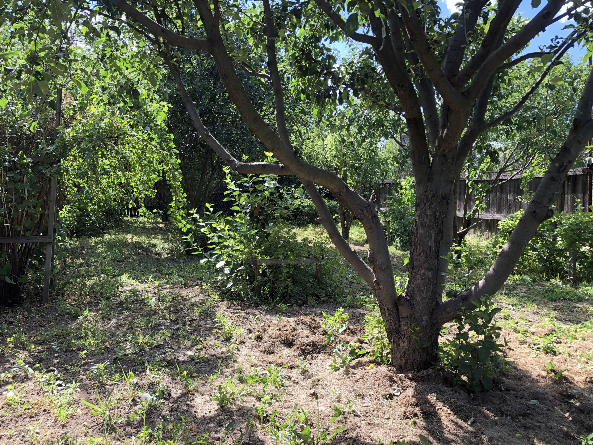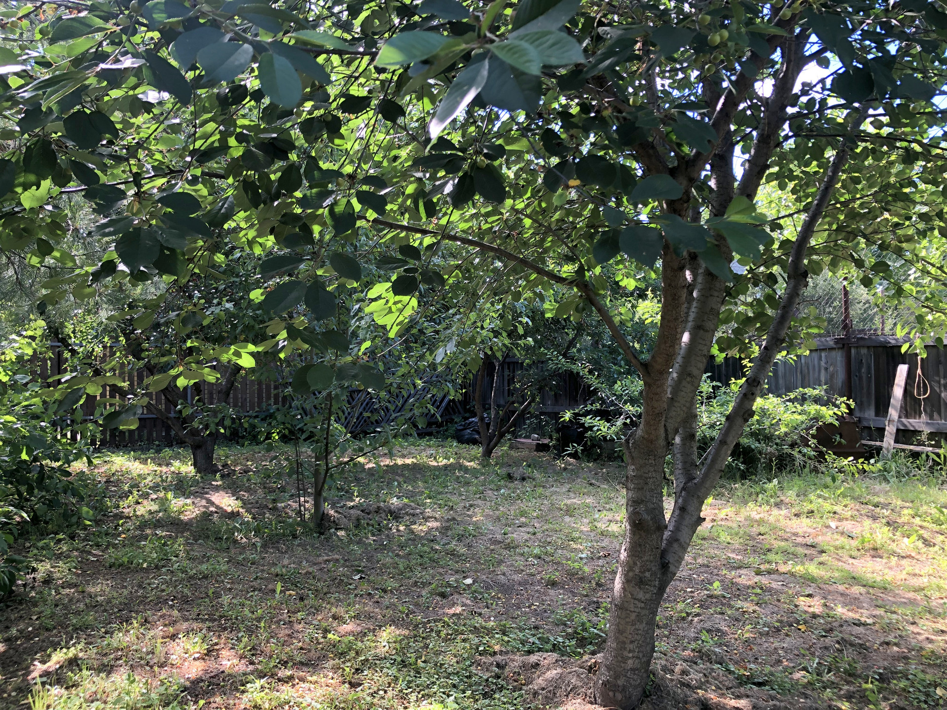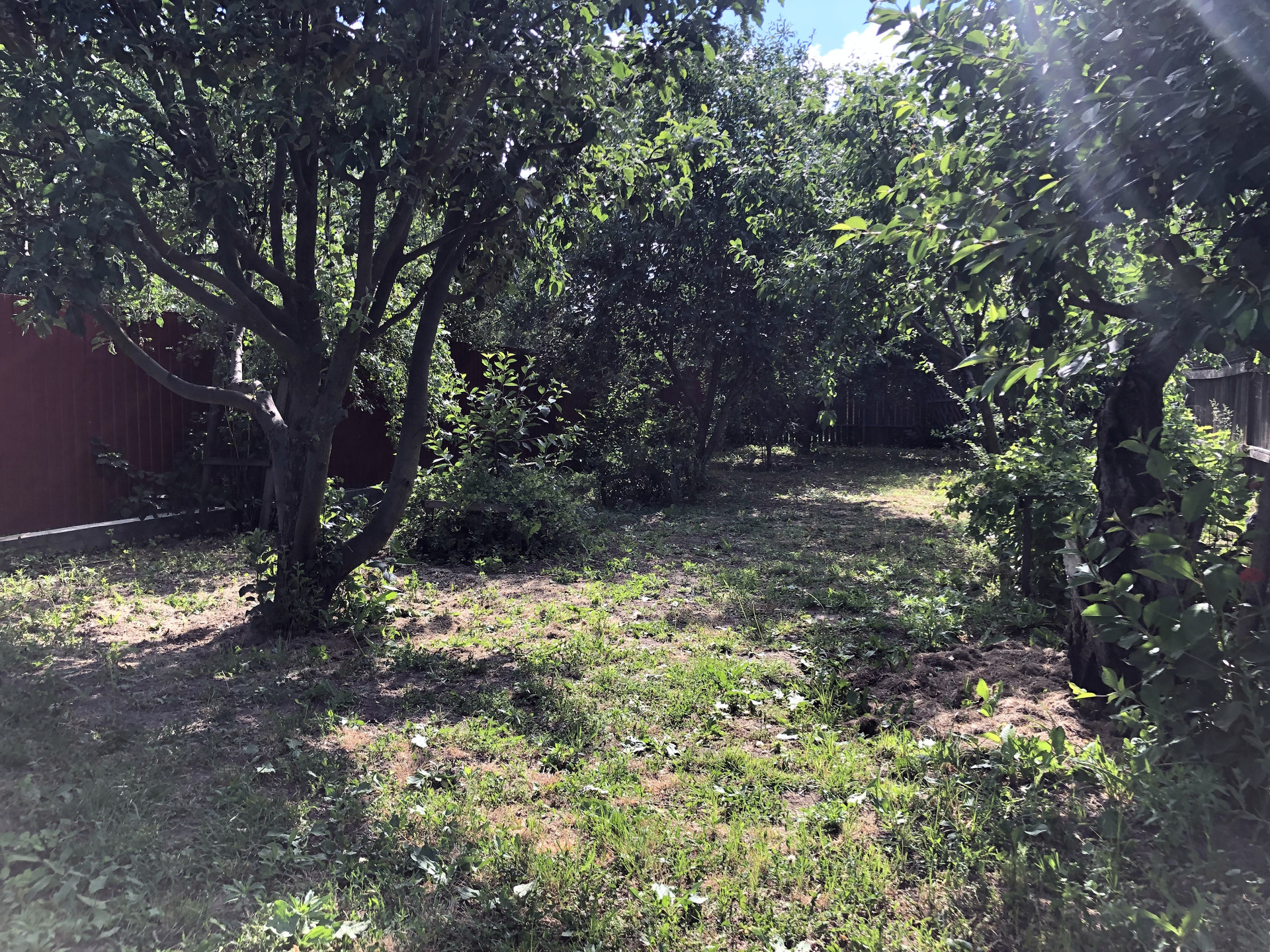 Участок разделен на две "зоны". На одном участке ухоженный газон. Использовался как спортивная площадка (есть два баскетбольных щита). Площадь данного участка 3,5 сотки. На втором прилегающем участке разбит сад, на котором растут плодоносящие деревья: яблоня, груша, ранняя вишня, черешня. Есть смородина, ежевика, крыжовник.