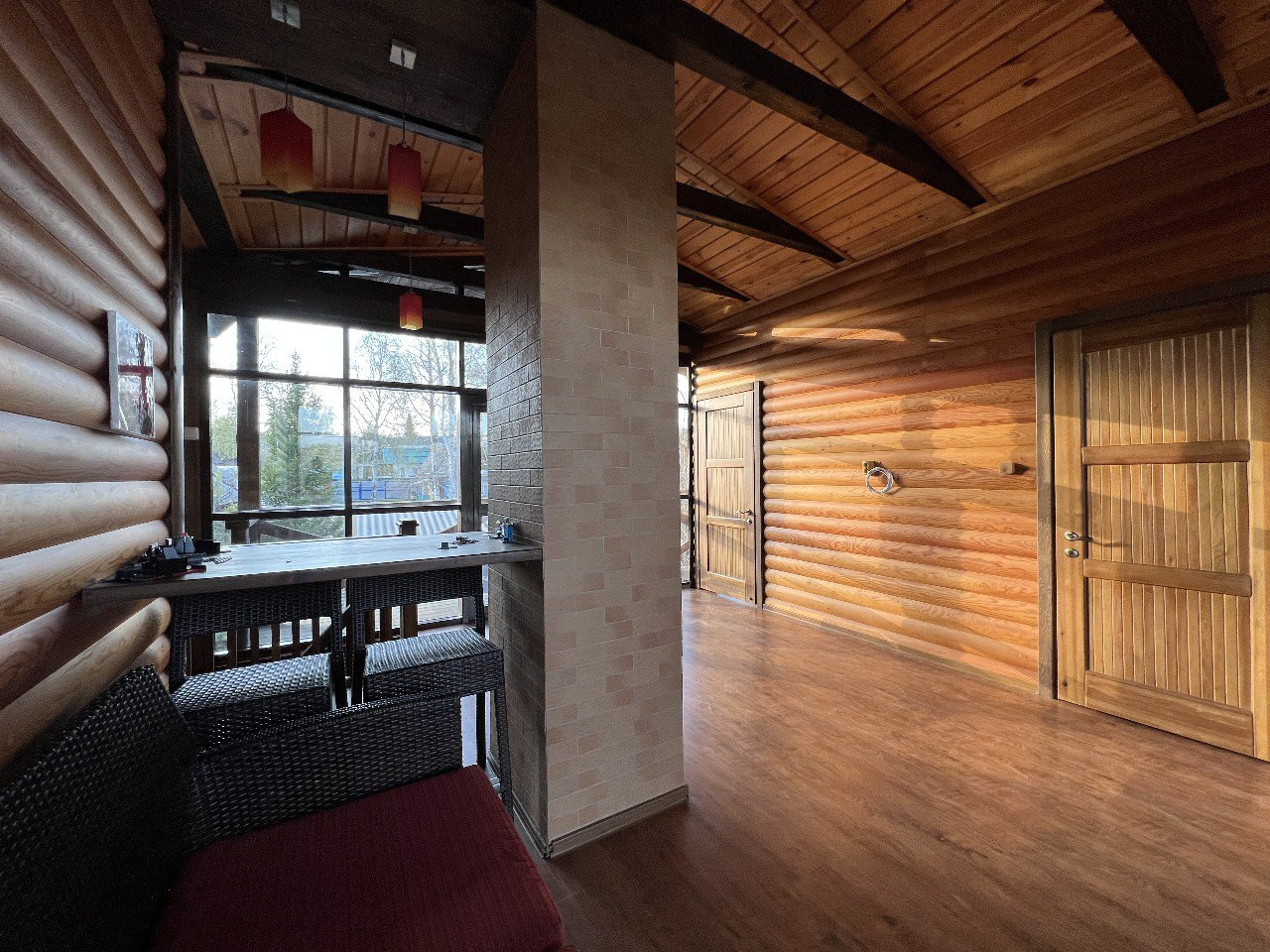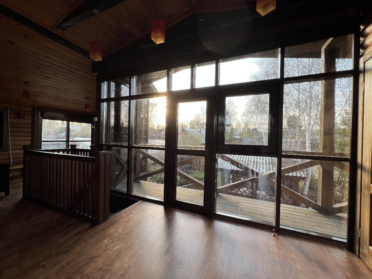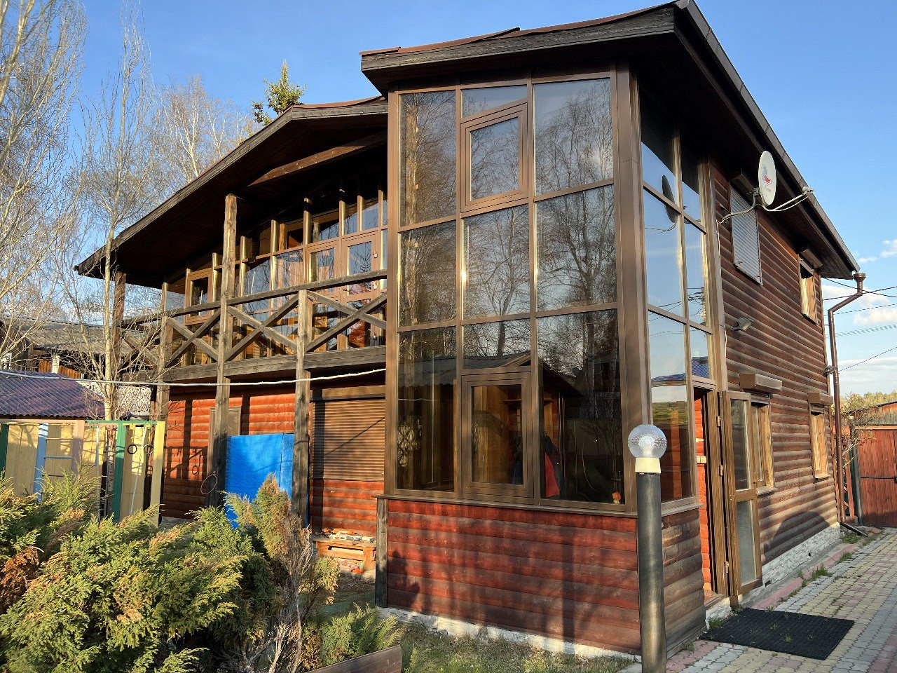 - благоустроенный дом 140м для круглогодичного проживания, выполнен из бруса с облицовкой лиственничным блокхаусом, стеклофасады из немецкого алюминиевого профиля, с двумя смотровыми балконами на обе стороны дома.