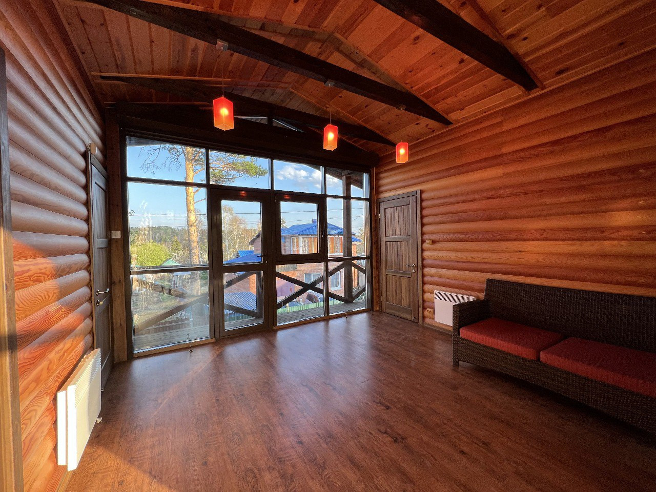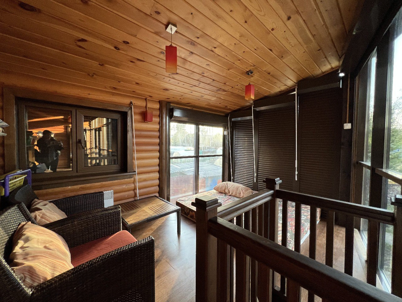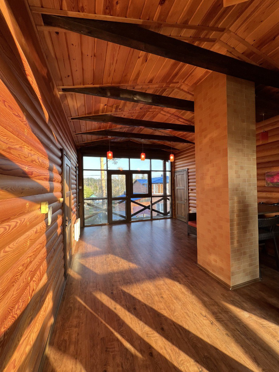 - благоустроенный дом 140м для круглогодичного проживания, выполнен из бруса с облицовкой лиственничным блокхаусом, стеклофасады из немецкого алюминиевого профиля, с двумя смотровыми балконами на обе стороны дома.