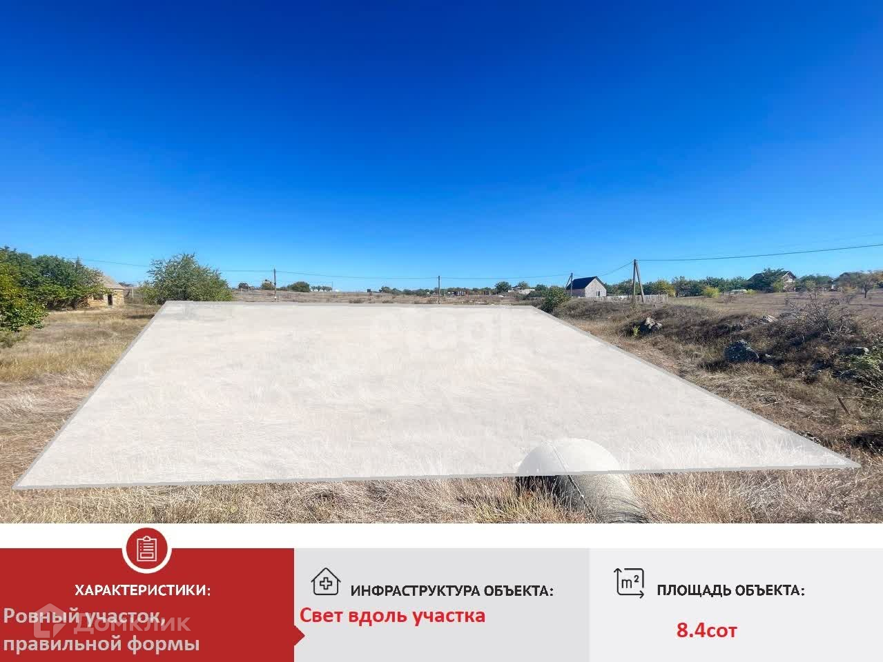 Площадь участка — 8,43 сотки. Все документы в порядке: межевание выполнено, электричество на границе!
