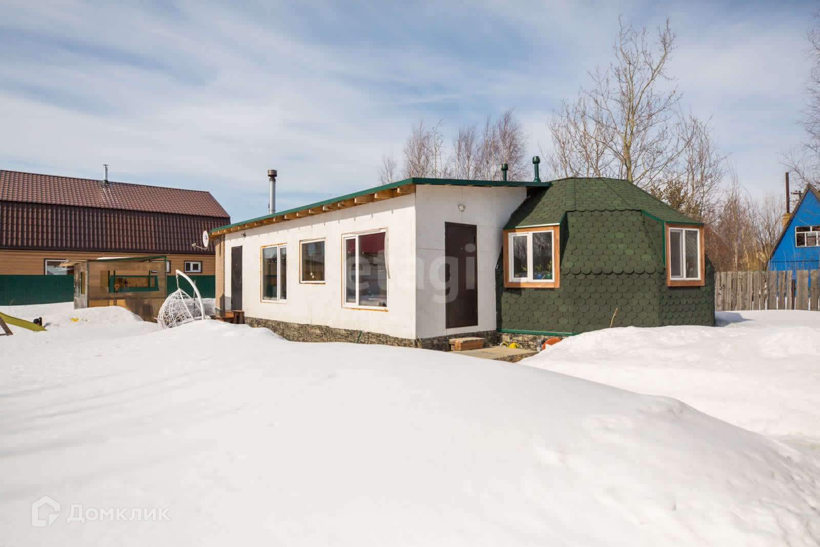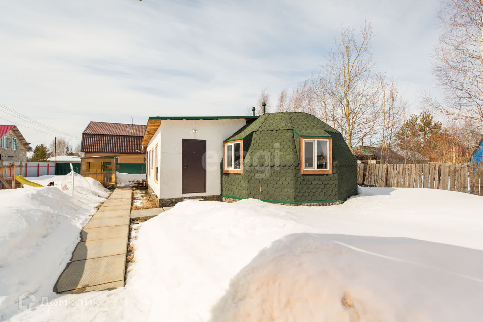 Дом построен по каркасной технологии Добросфера, каркас купольного типа заказывался на заводе. Каркас утеплен с снаружи пеноплексом, внутри минвата каменная жесткая, общая толщина утепления 20 см. Каркас обшит с обеих сторон материалом ОСБ толщиной 15 мм, снаружи проклеена гидроизоляция и уложен стеновой шинглас, внутри дома панели ОСБ окрашены. Фундамент: винтовые сваи, вокруг свай по бокам и у основания на земле пропенен пеноплексом, вовнутрь уложена минвата толщиной 50 см. Полы застелены половой доской и покрыты маслом. В доме установлены оригинальные окна REHAU. Отопление: в доме производится посредством электрического котла с возможностью управления через телефон. Радиаторы в доме биметаллические, заполненные теплоносителем. Вода: Скважина расположена в доме вода чистая питьевая. Горячая вода также через бойлер. Септик установлен не обслуживаемый с самоочищением и сбросом воды в грунт. На веранде установлена печь-камин, в любой мороз через 40 минут вся площадь веранды прогревается до +25. Окна на веранде панорамные. Баня: пристроена к дому, вход из гостиной комнаты. Обшита липой, полки термо-абаш, печка с камнями трех видов, имеет свою моечную с душевным поддоном и свой бойлер. Сан узел: в доме, совмещённый. Выводы для раковины стиральной машины все проведены. Электричество: трех- фазное. Дорожки и площадка под навесом выложены тротуарной плиткой. Проведён Wi-Fi, имеется спутниковое ТV триколор.