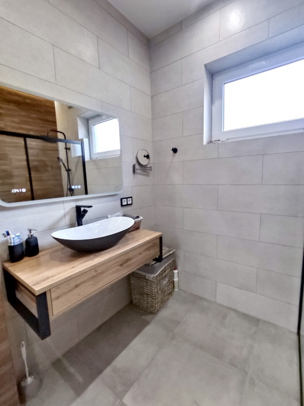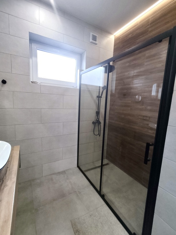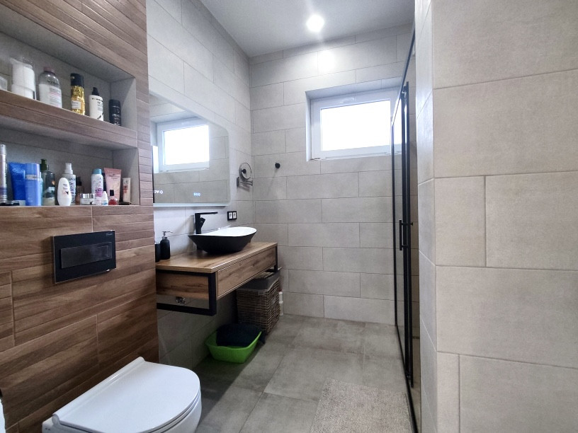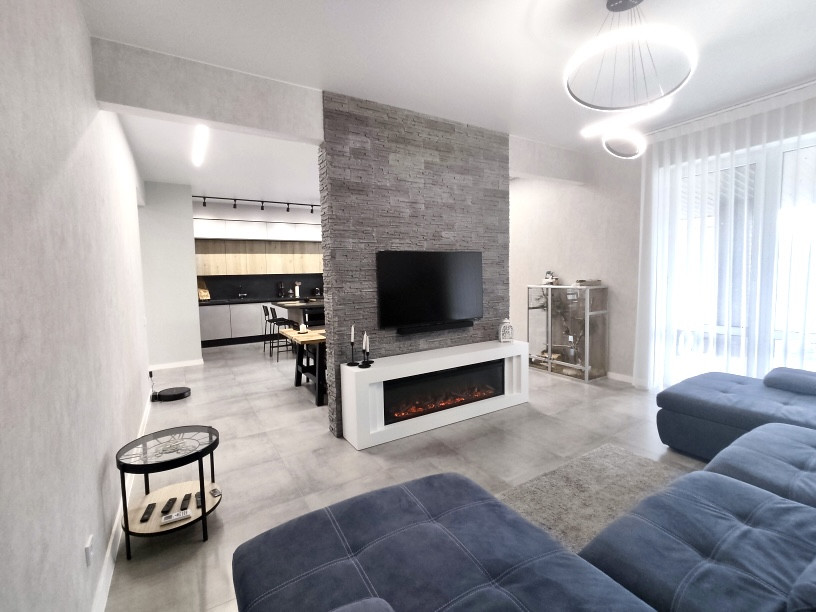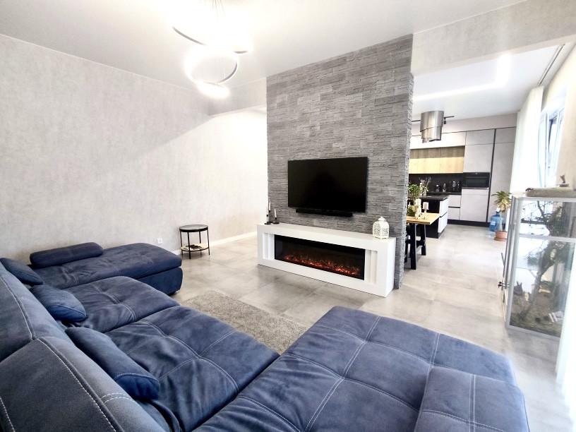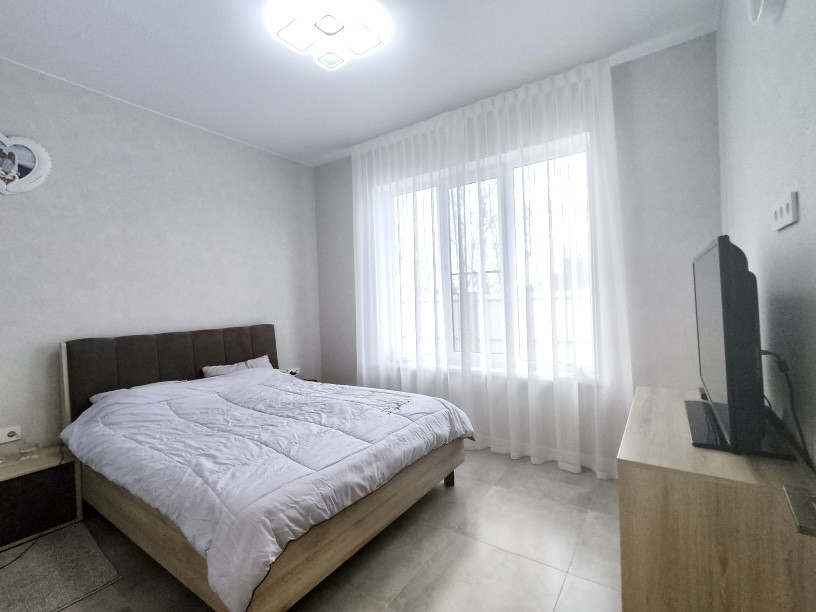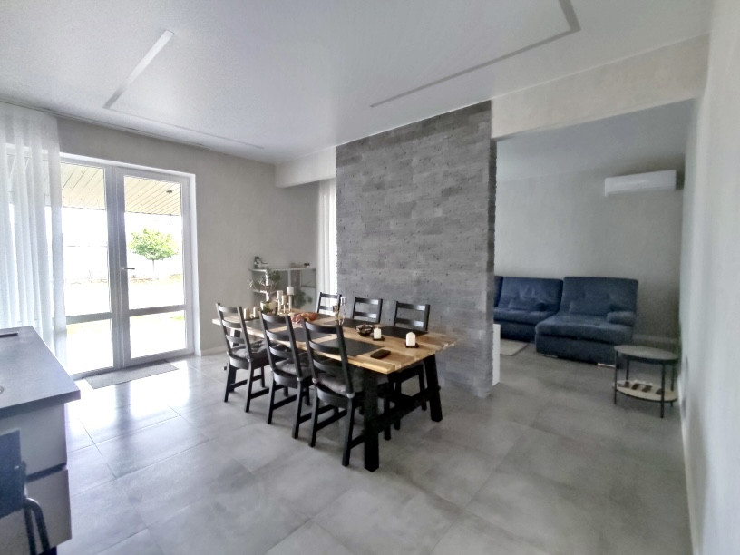 В доме выполнен современный дизайнерский ремонт с использованием качественных отделочных материалов: на полу — ламинат, в кухне-гостиной на полу керамическая плитка, натяжные потолки с дизайнерскими светильниками, стены под покраску, в санузле — керамогранит, установлены межкомнатные двери, розетки и выключатели, двухконтурный газовый котел, теплый пол, радиаторы отопления.