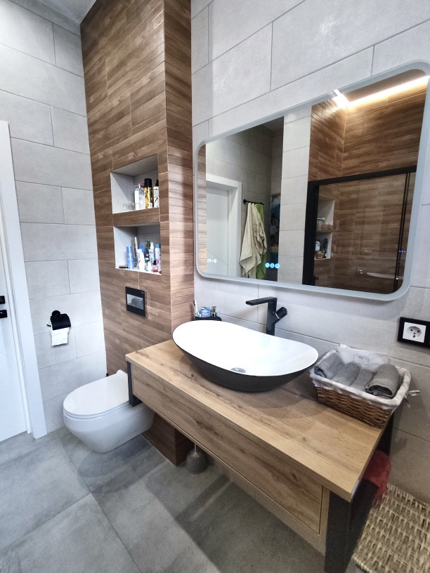 В ванной комнате установлена дорогая сантехника, инсталляция, ванна, мебель для ванной.