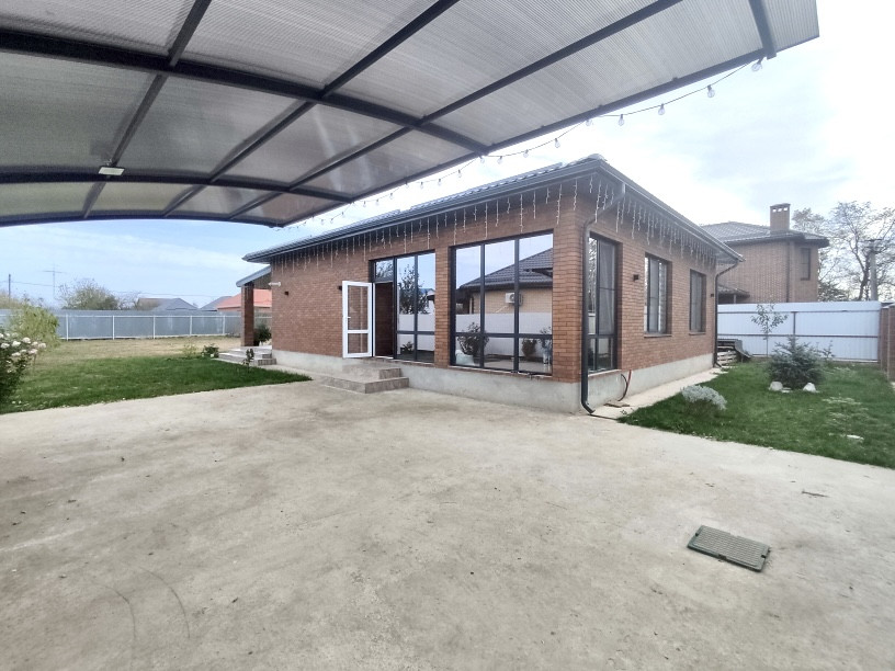 Одноэтажный коттедж возведен по индивидуальному проекту на ленточном фундаменте, материал стен газоблок +утеплитель, наружные — облицовочный кирпич, большие металлопластиковые окна с внешней ламинацией, в кухне-гостиной окна в пол, кровля — металлочерепица, входные двери.