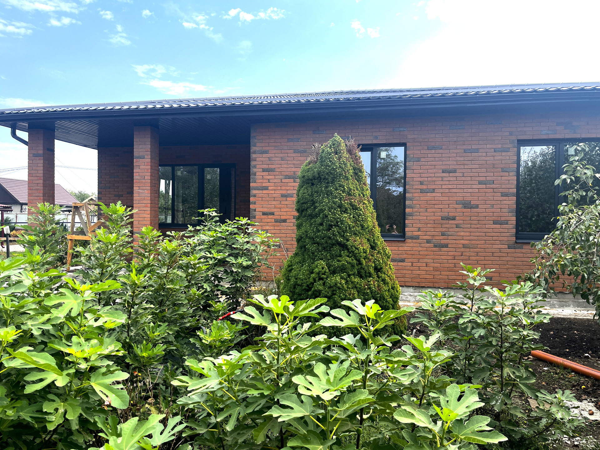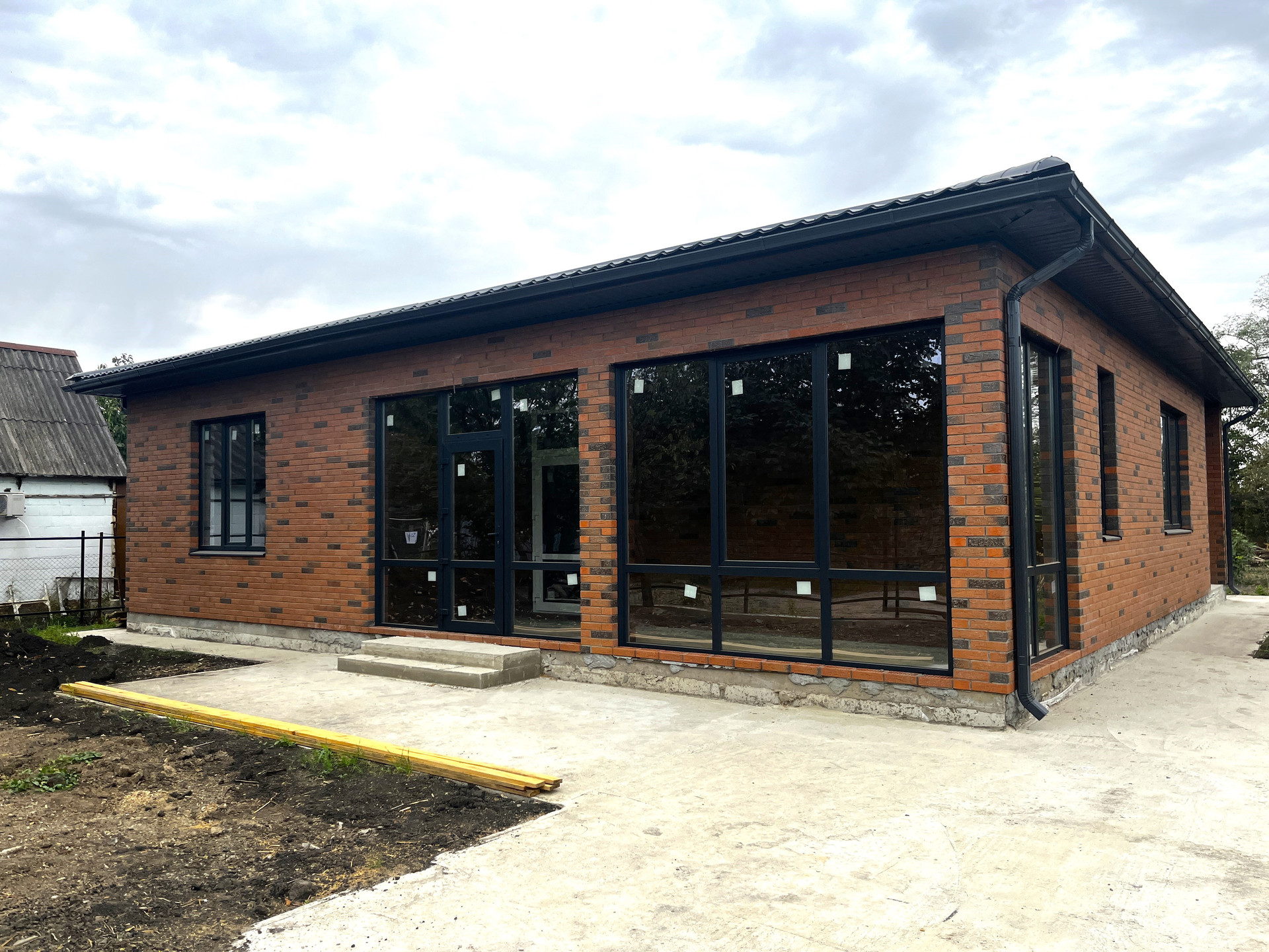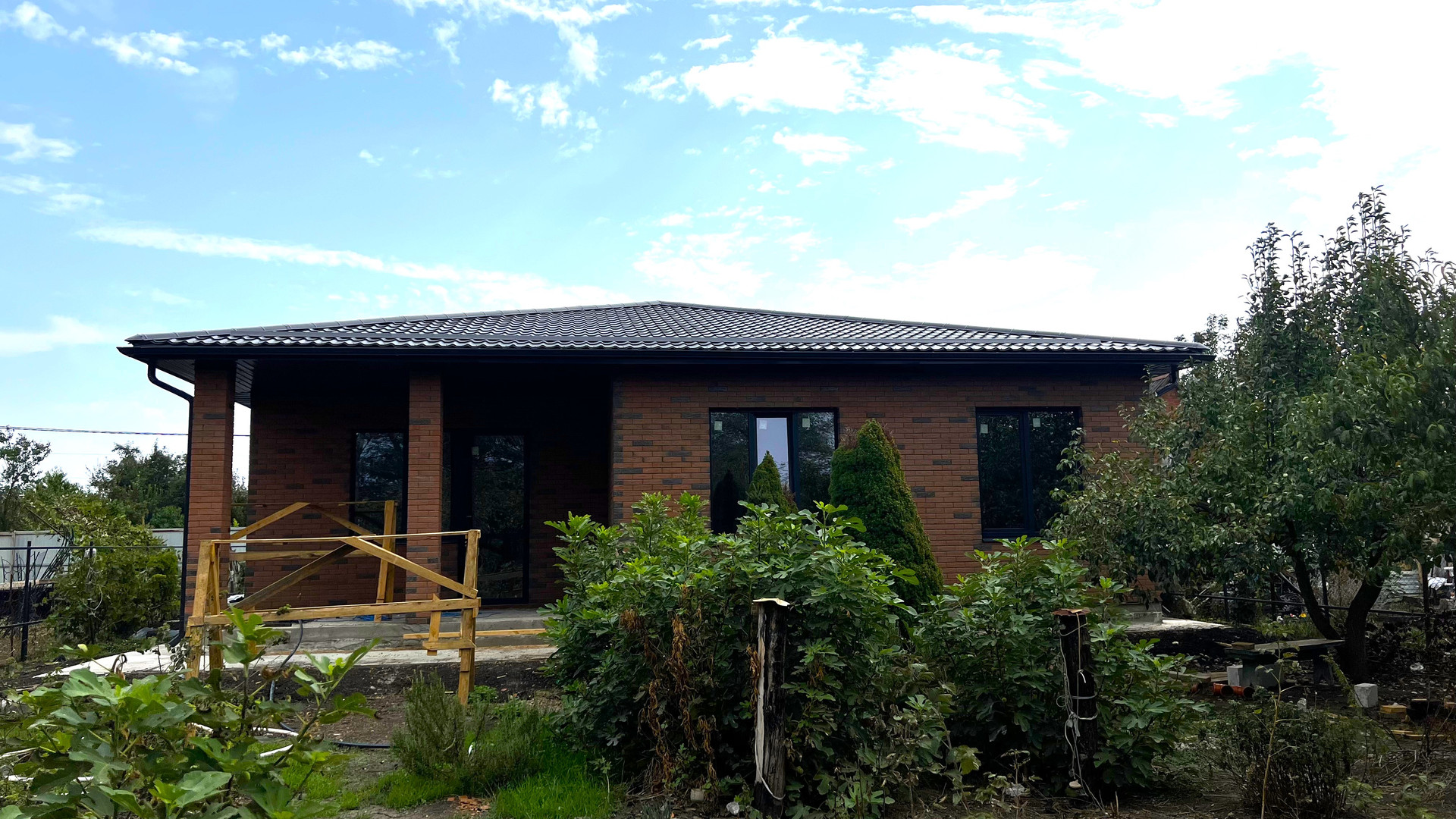 Одноэтажный коттедж возведен по индивидуальному проекту с использованием качественных строительных материалов: ленточный фундамент, материал стен — газоблок, наружные — облицовочный кирпич, большие панорамные металлопластиковые окна с внешней ламинацией, кровля — металлочерепица, входные двери.