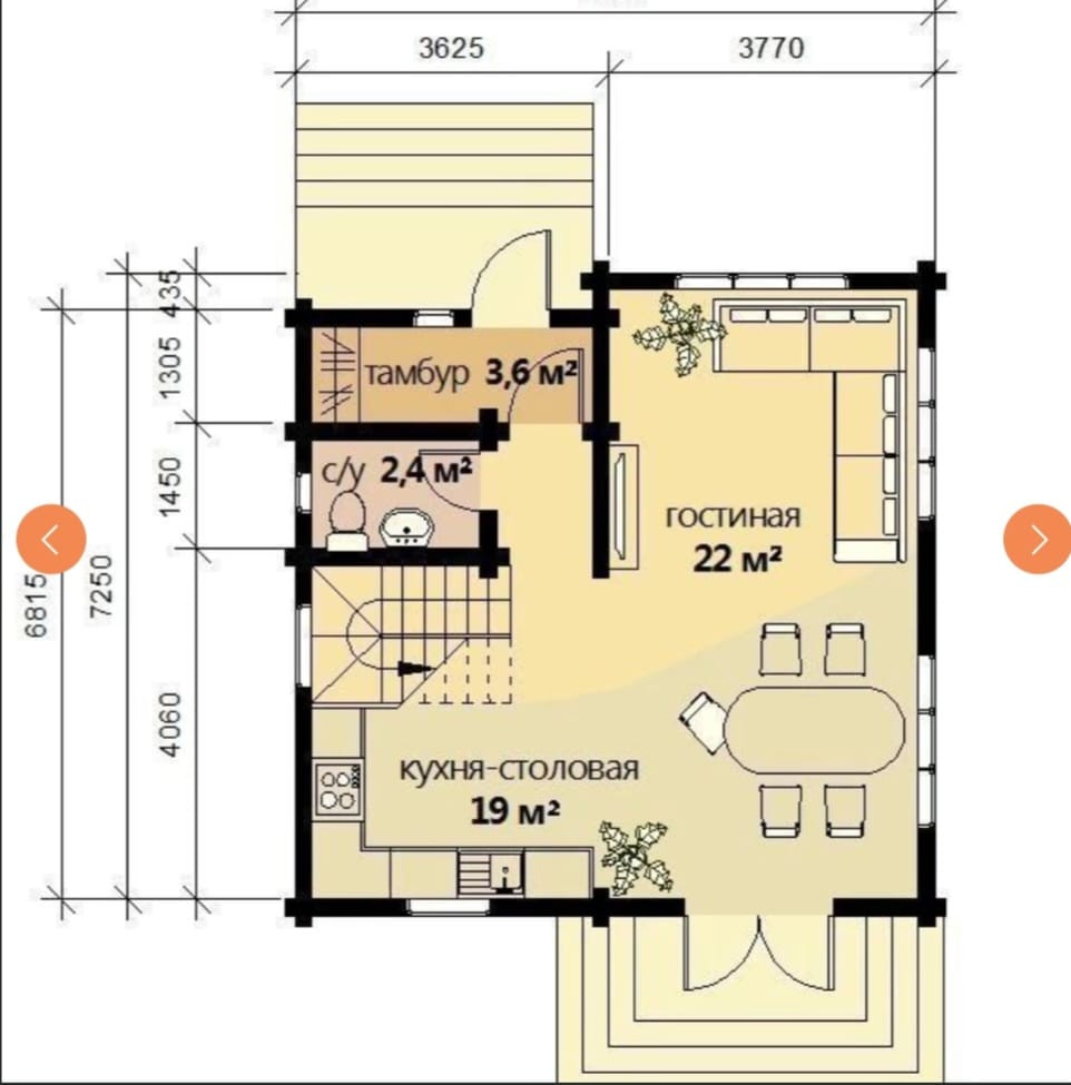 На первом этаже  большая кухня-гостиная.
