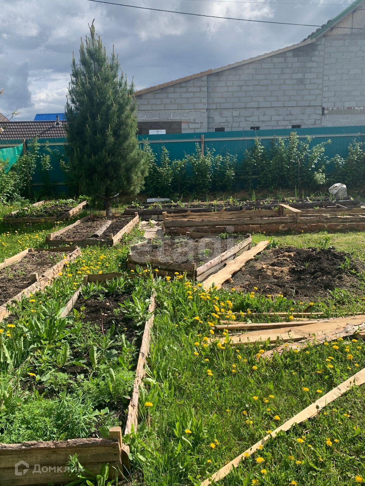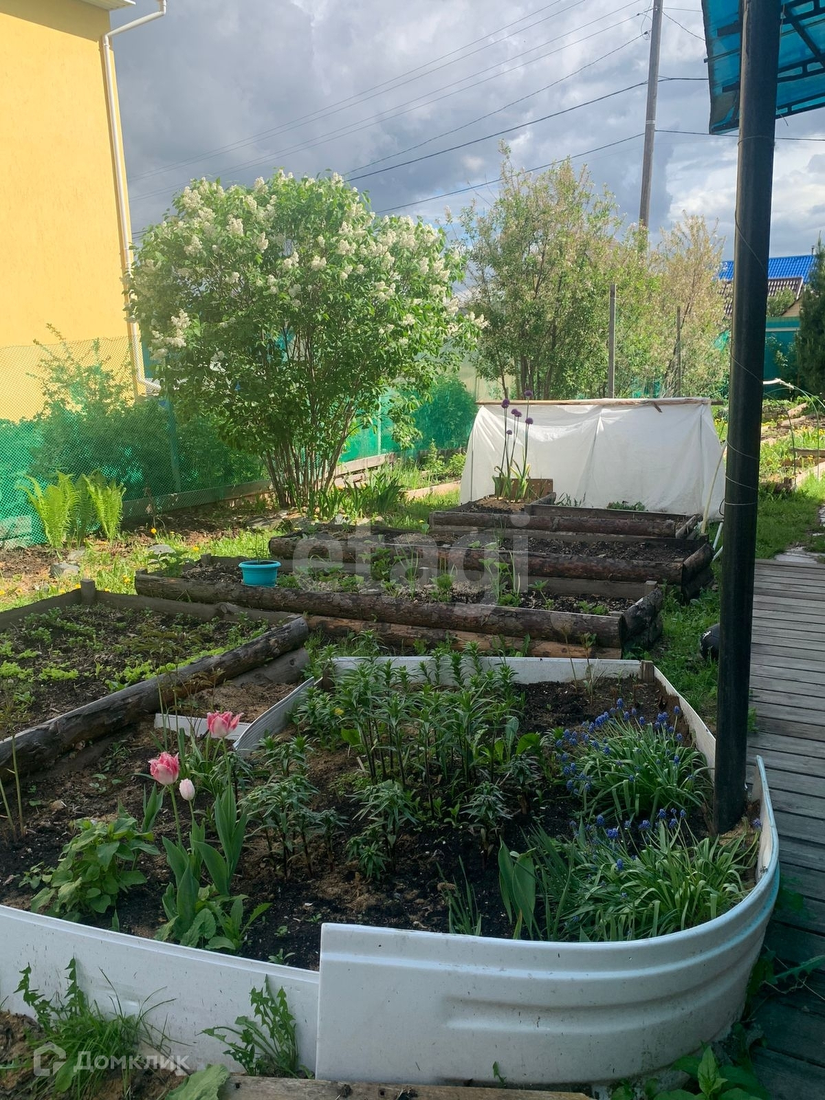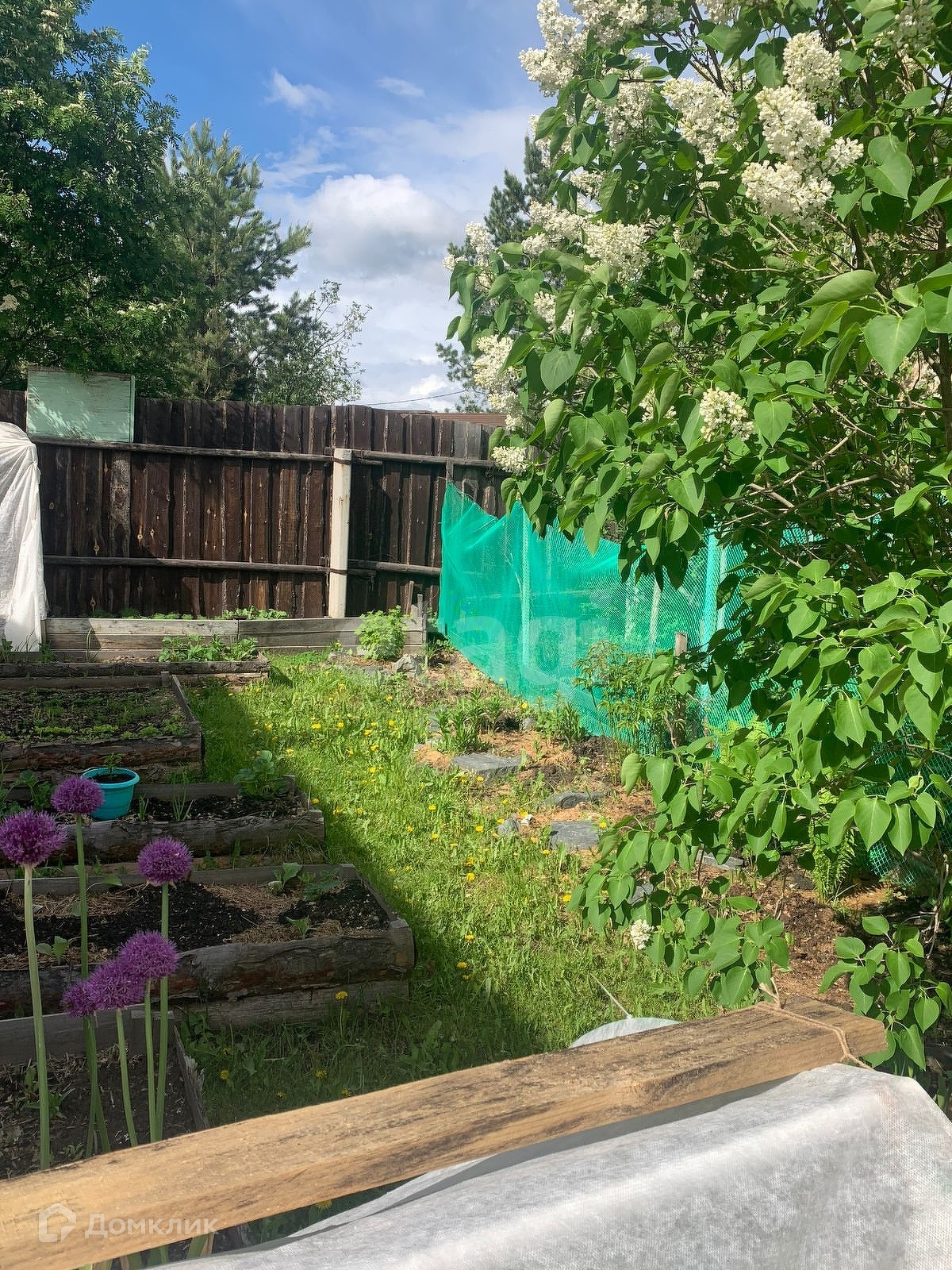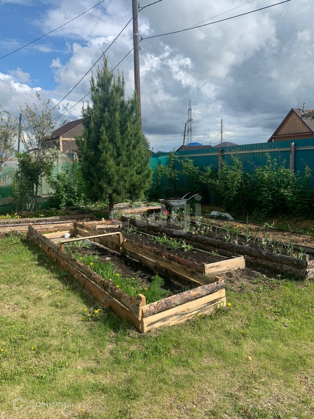 На участке растут плодовые деревья и кустарники, установлена теплица, грядки.