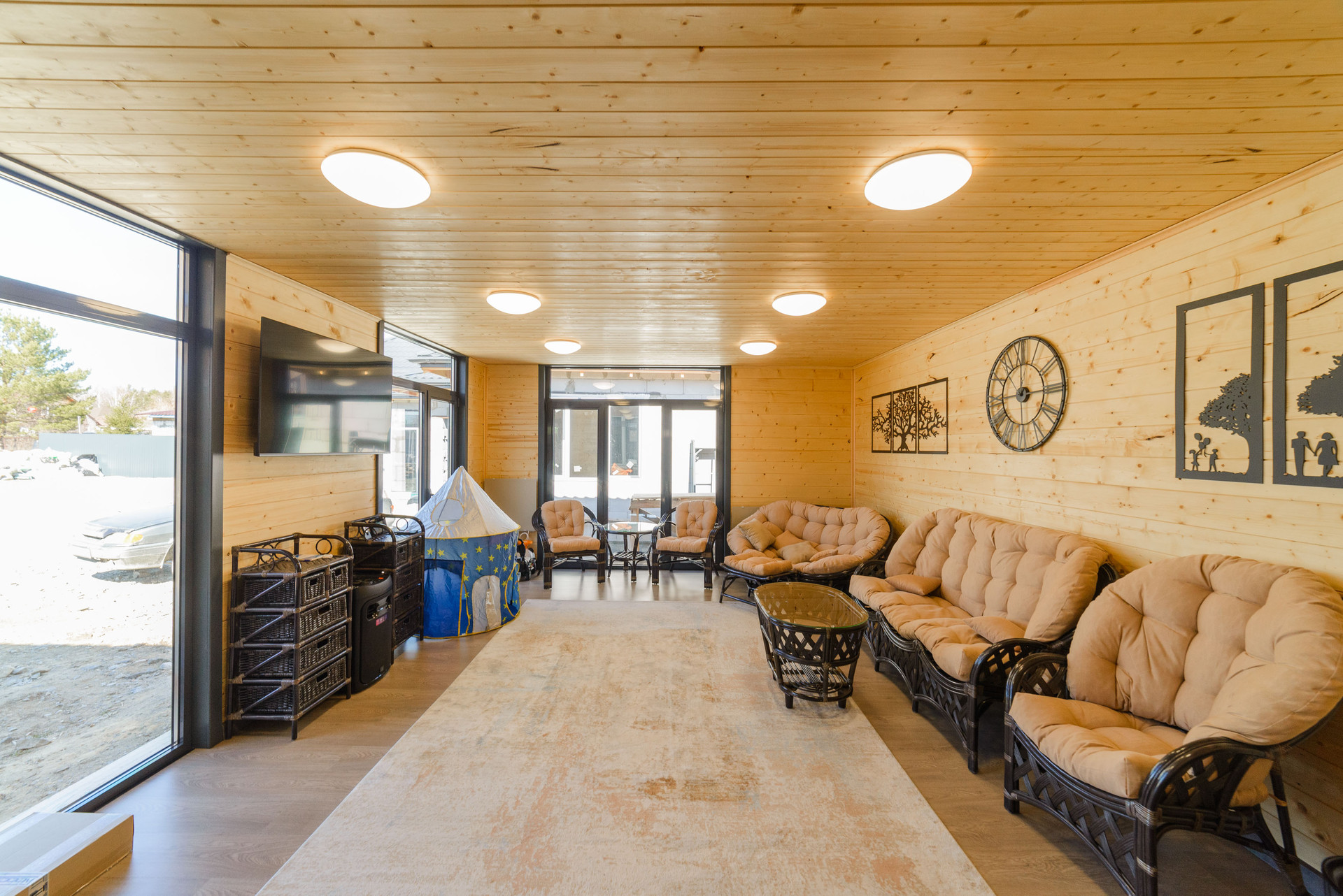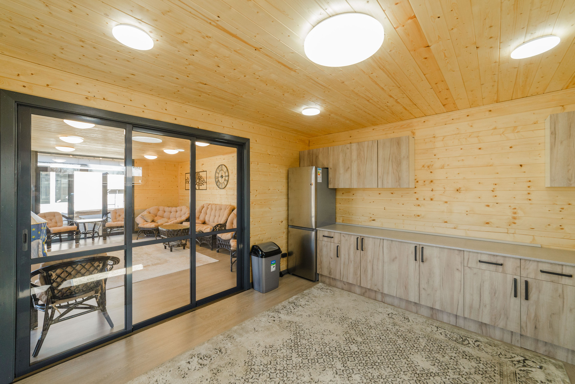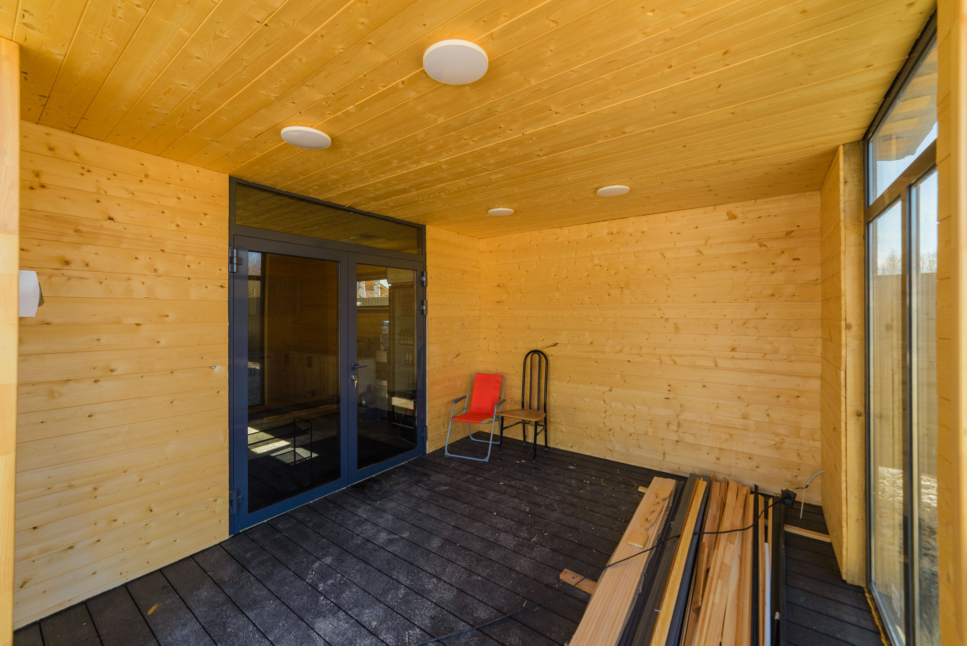 Беседка общая площадь 60 кв. м: кухня и комната-43 кв. м и терраса-16 кв.м. Обшита имитация бруса.  Фундамент:плита утепленная каркасная, пол утеплен мин.ватой 200мм, стены и потолок утеплены мин.ватой 100мм., в кухне и комнате на полу ламинат, на террасе доска ДКП, установлены алюминиевые панорамные окна, карбоно кварцевые обогреватели, крыша металлочерепица.