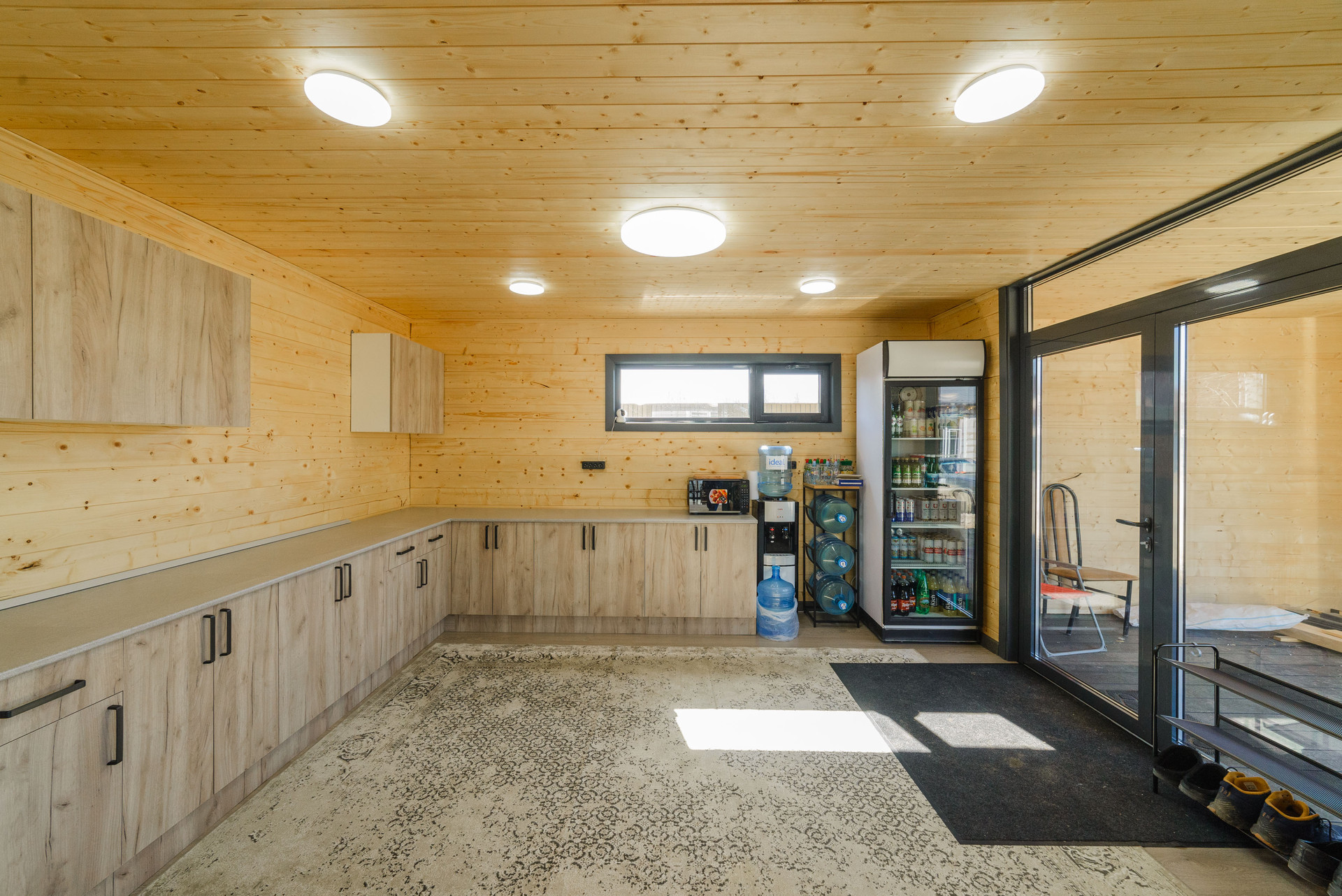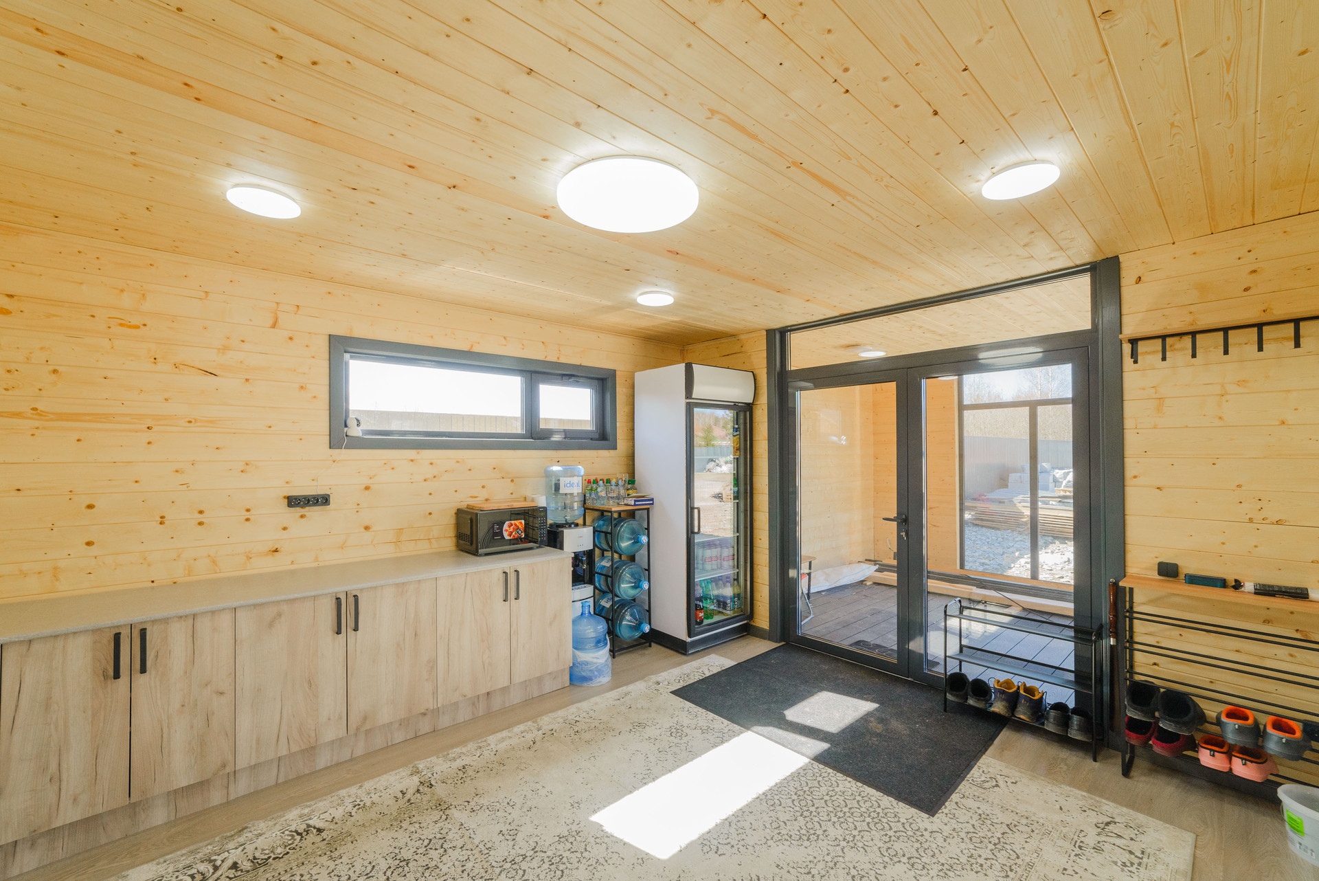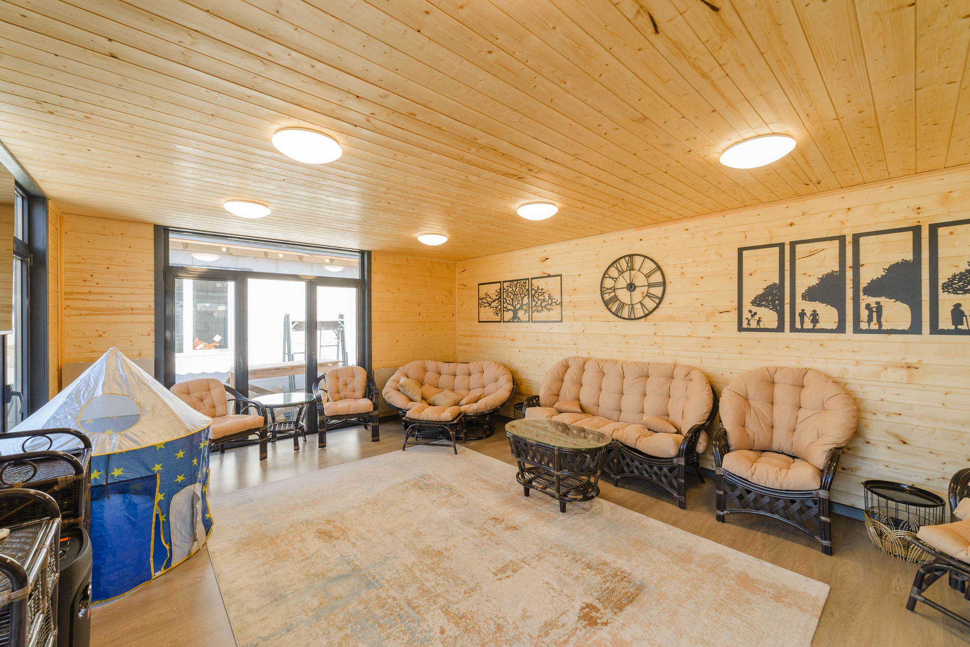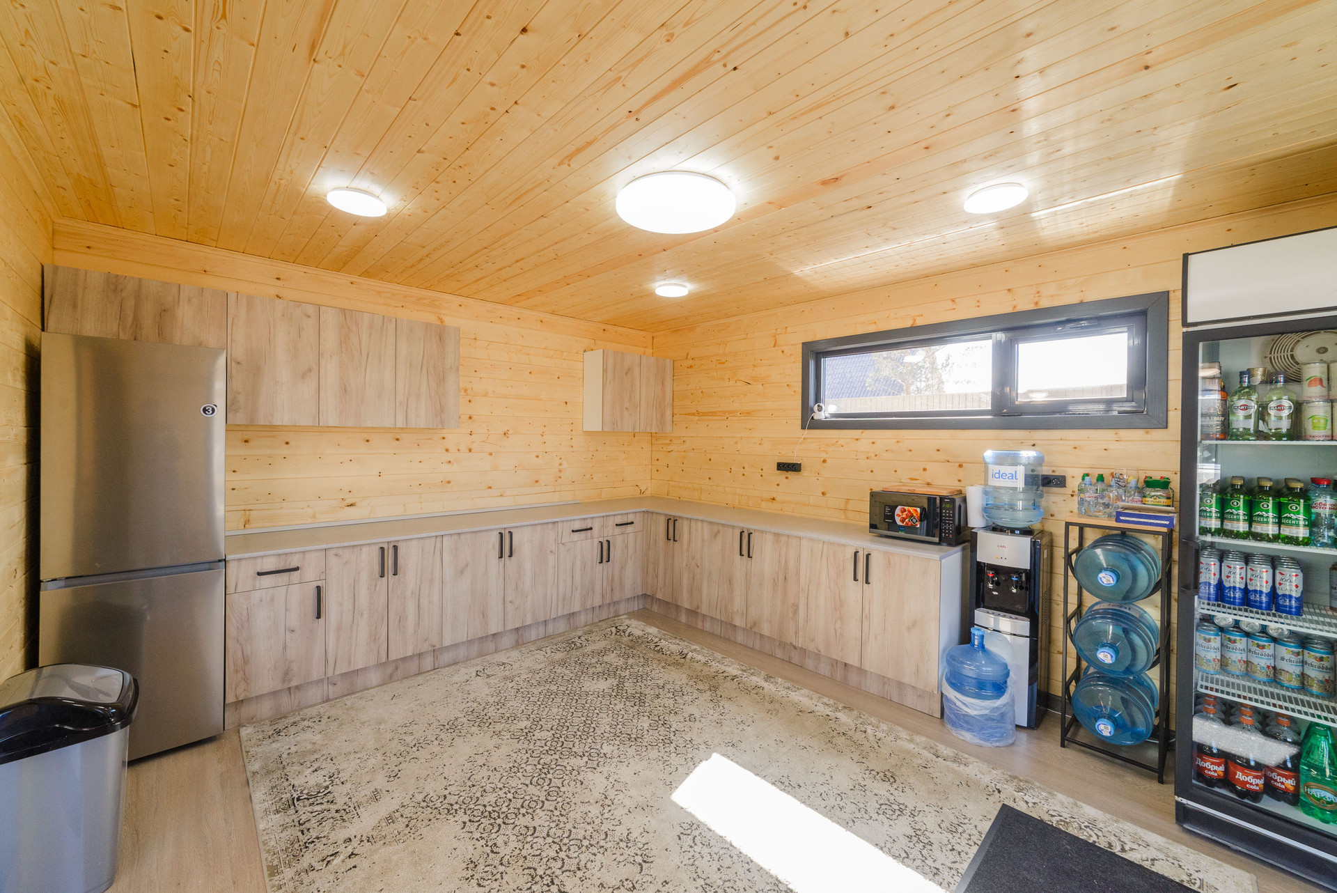 Беседка общая площадь 60 кв. м: кухня и комната-43 кв. м и терраса-16 кв.м. Обшита имитация бруса.  Фундамент:плита утепленная каркасная, пол утеплен мин.ватой 200мм, стены и потолок утеплены мин.ватой 100мм., в кухне и комнате на полу ламинат, на террасе доска ДКП, установлены алюминиевые панорамные окна, карбоно кварцевые обогреватели, крыша металлочерепица.