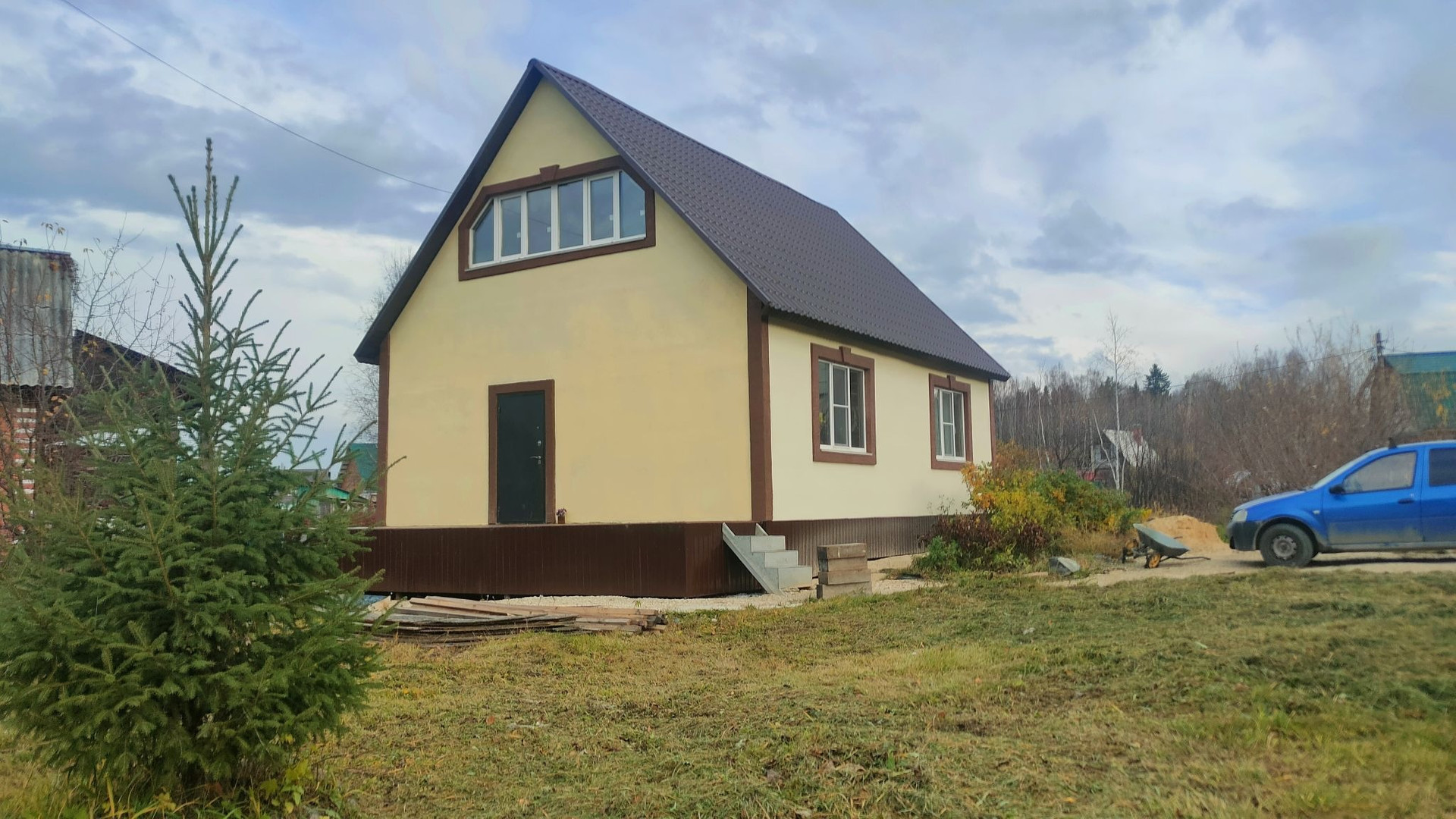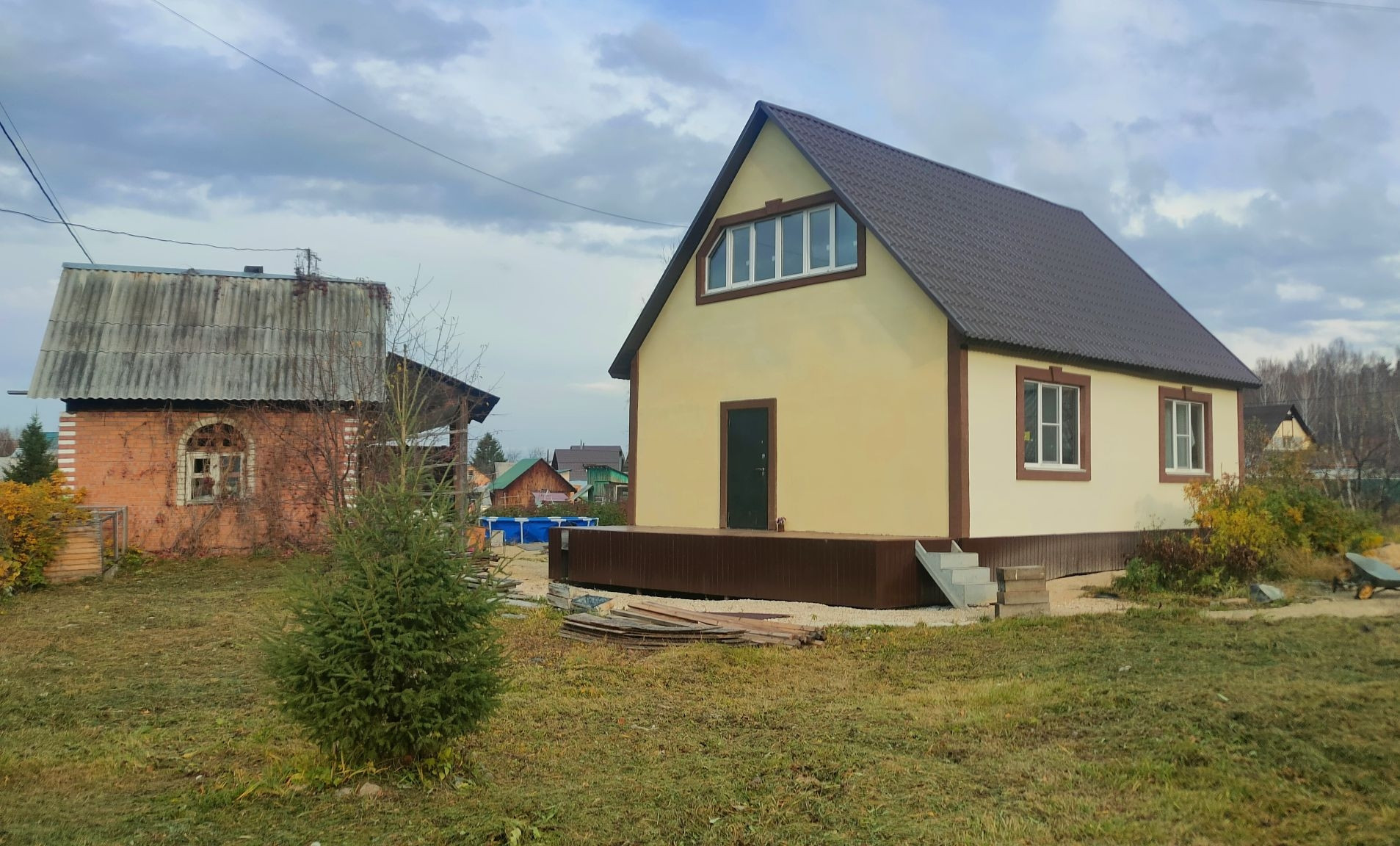 На участке имеется парковка на 2 машины, есть кирпичный домик площадью 20 кв. м., небольшой огород(смородина, вишня, слива, несколько грядок). Остаётся каркасный бассейн.