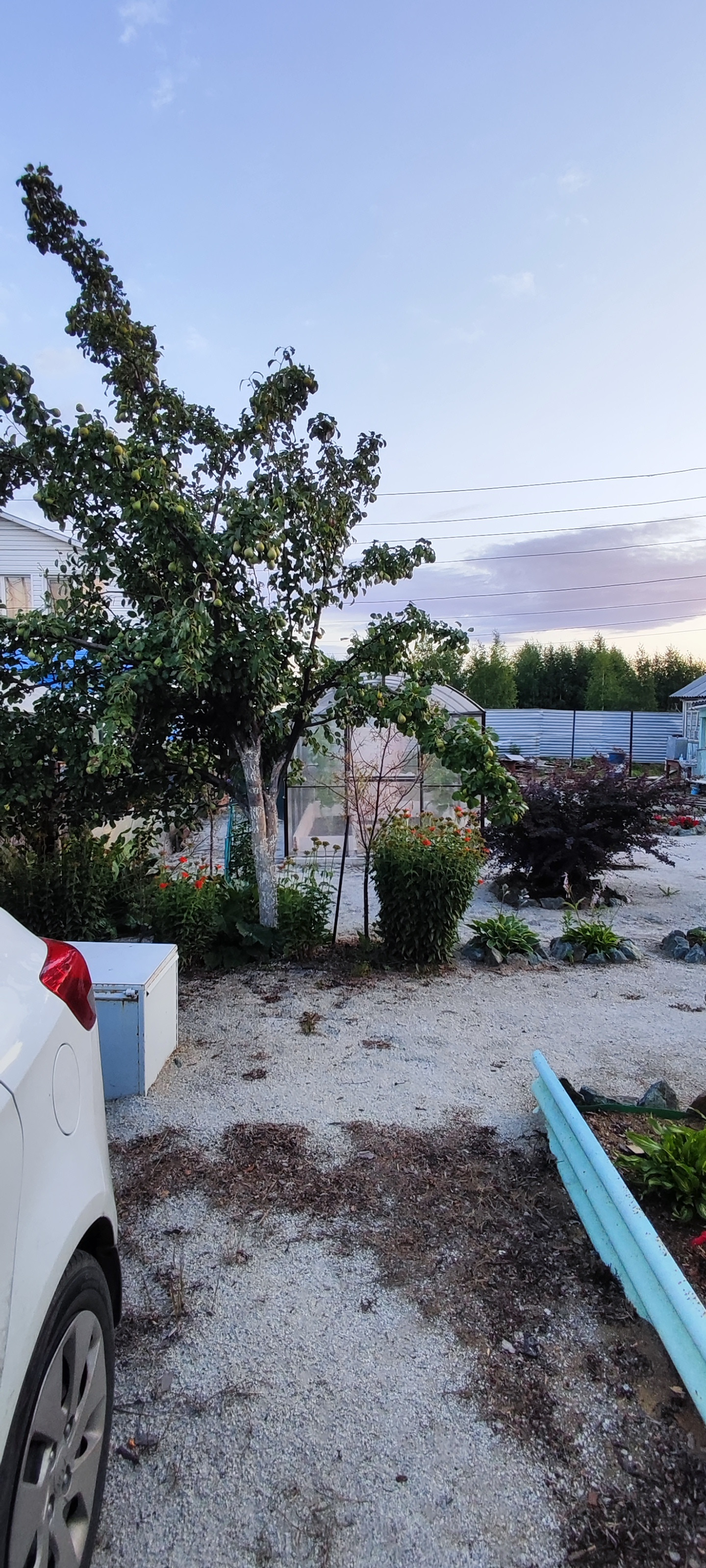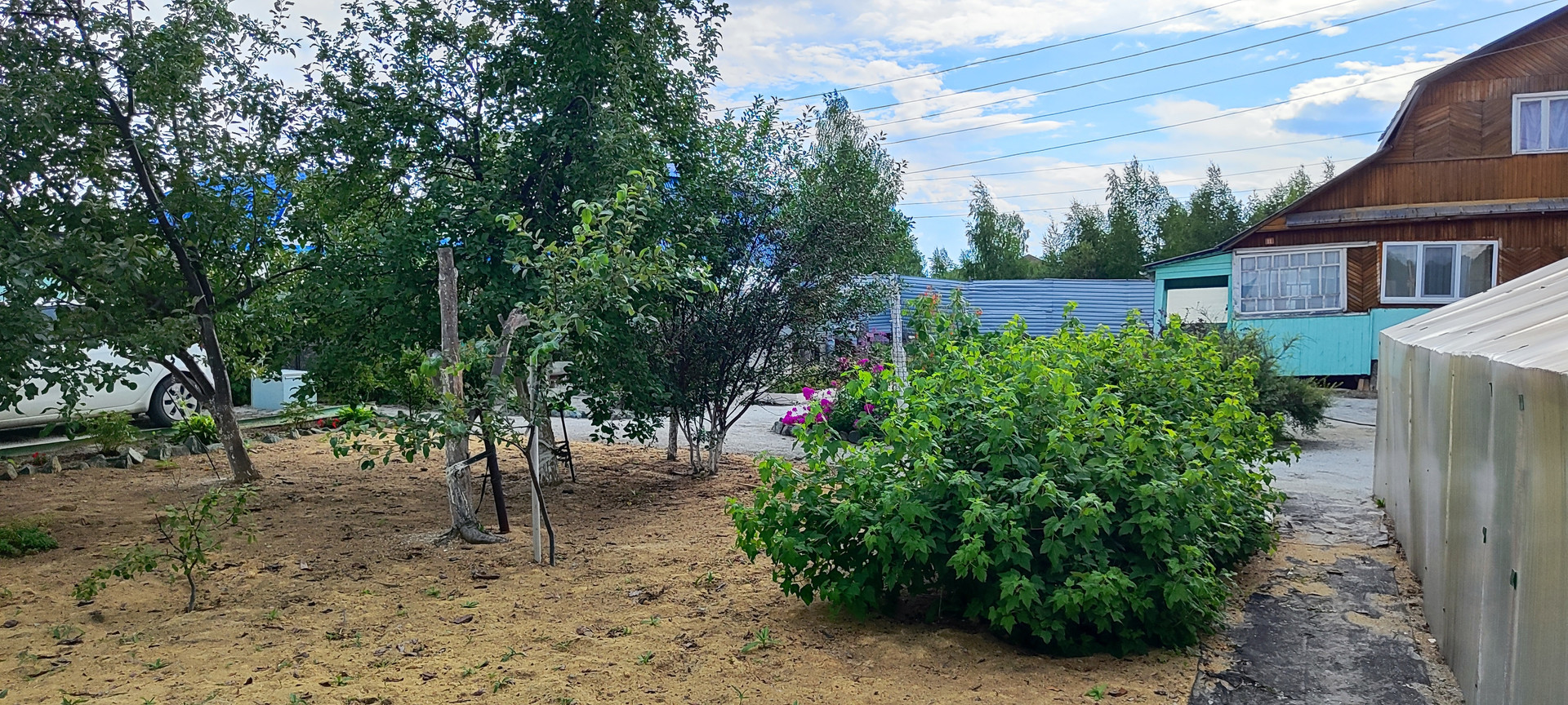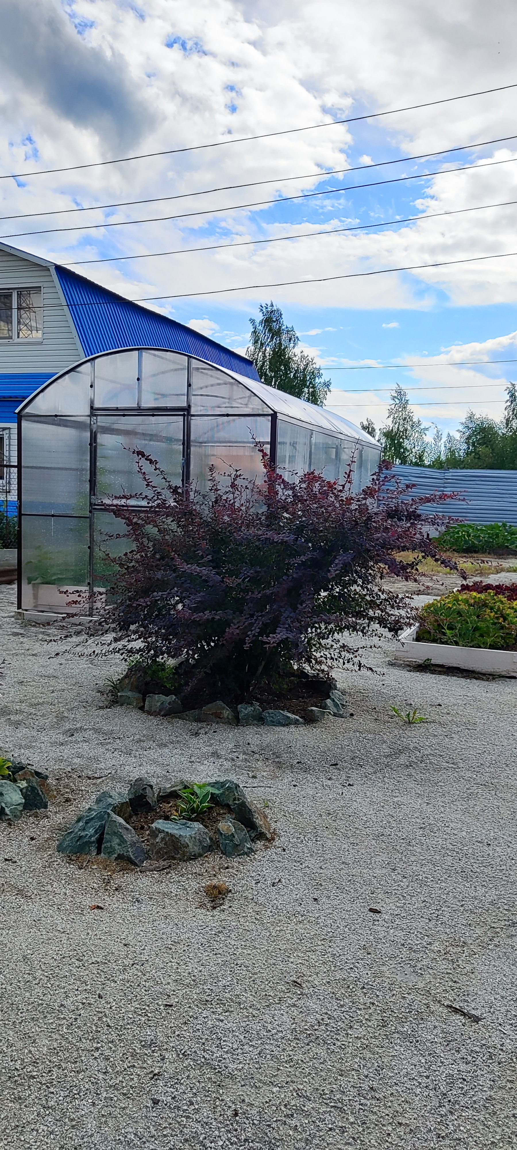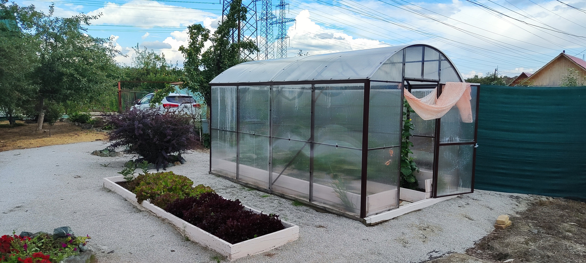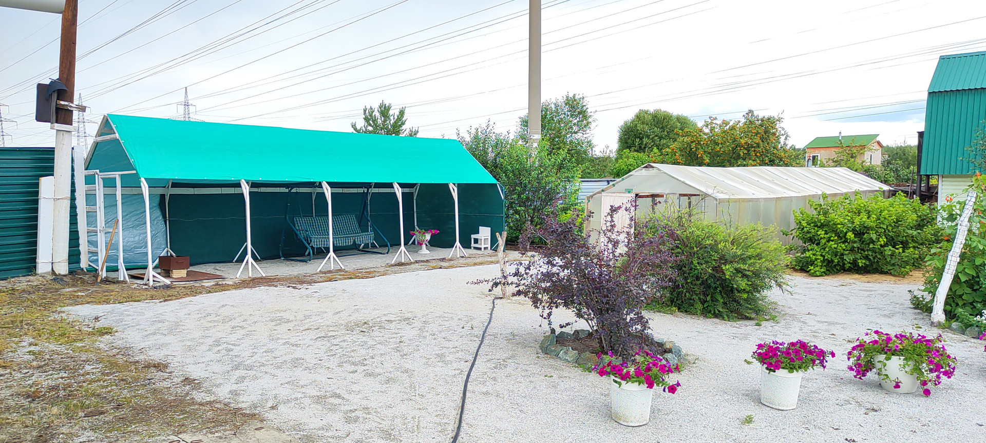 3) Две большие теплицы, большая каркасная беседка с качелями, парковка на две машины.