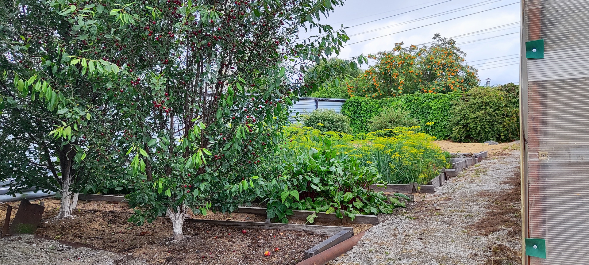 На участке растут: жимолость, виноград, черноплодная рябина, вишня, яблони (зимние и ранние) груши, облепиха, черная смородина, малина, клубника. Также растут сирень, пузыреплодник, барбарис.