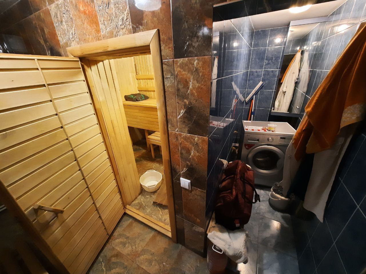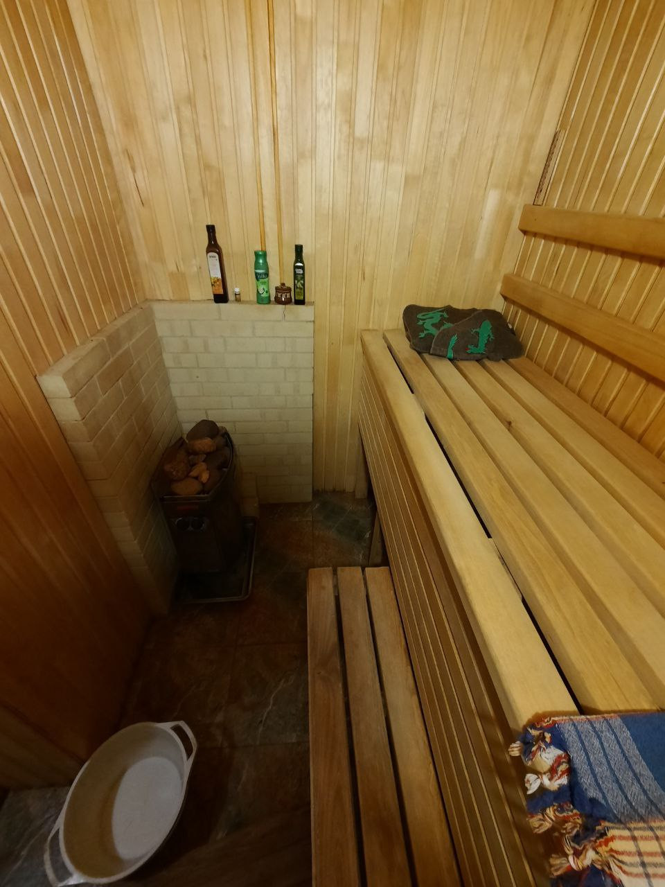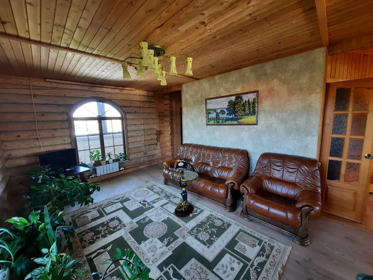 На 1 этаже кухня-гостиная, сауна, санузел.