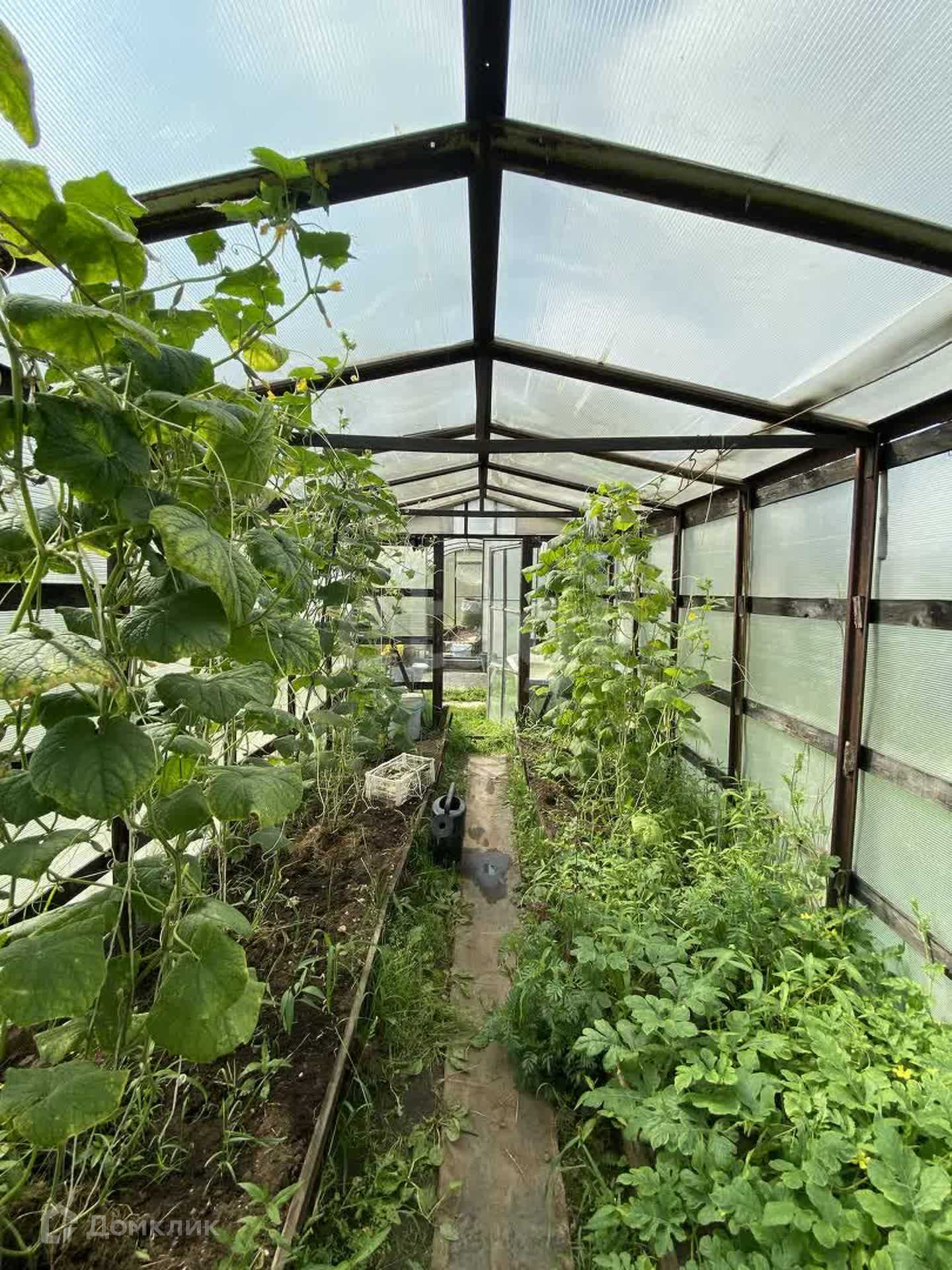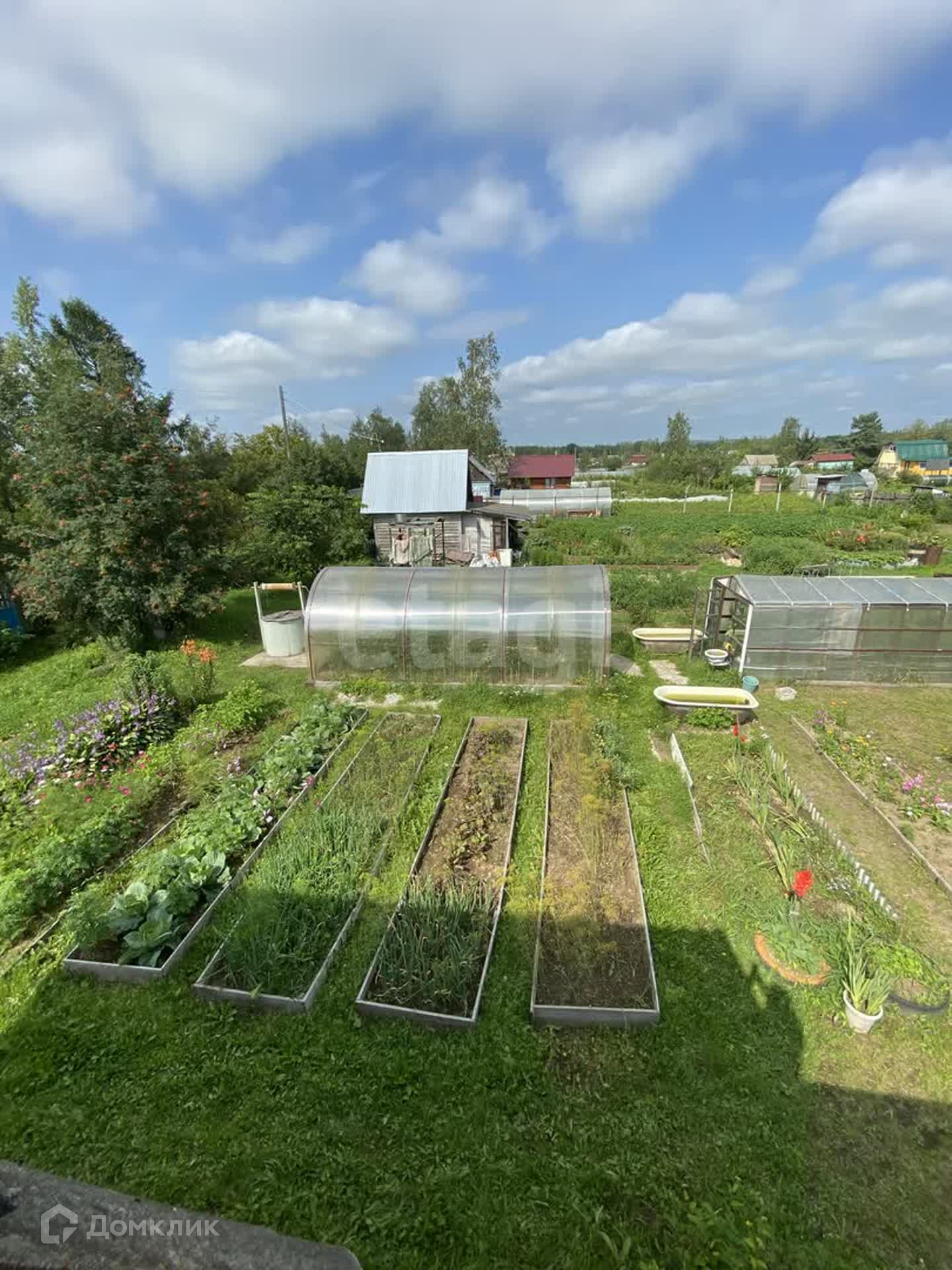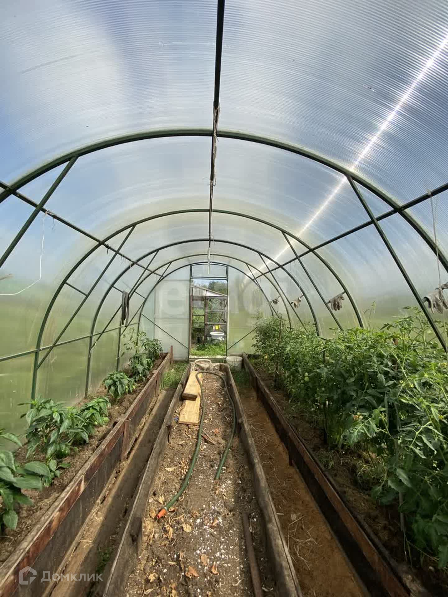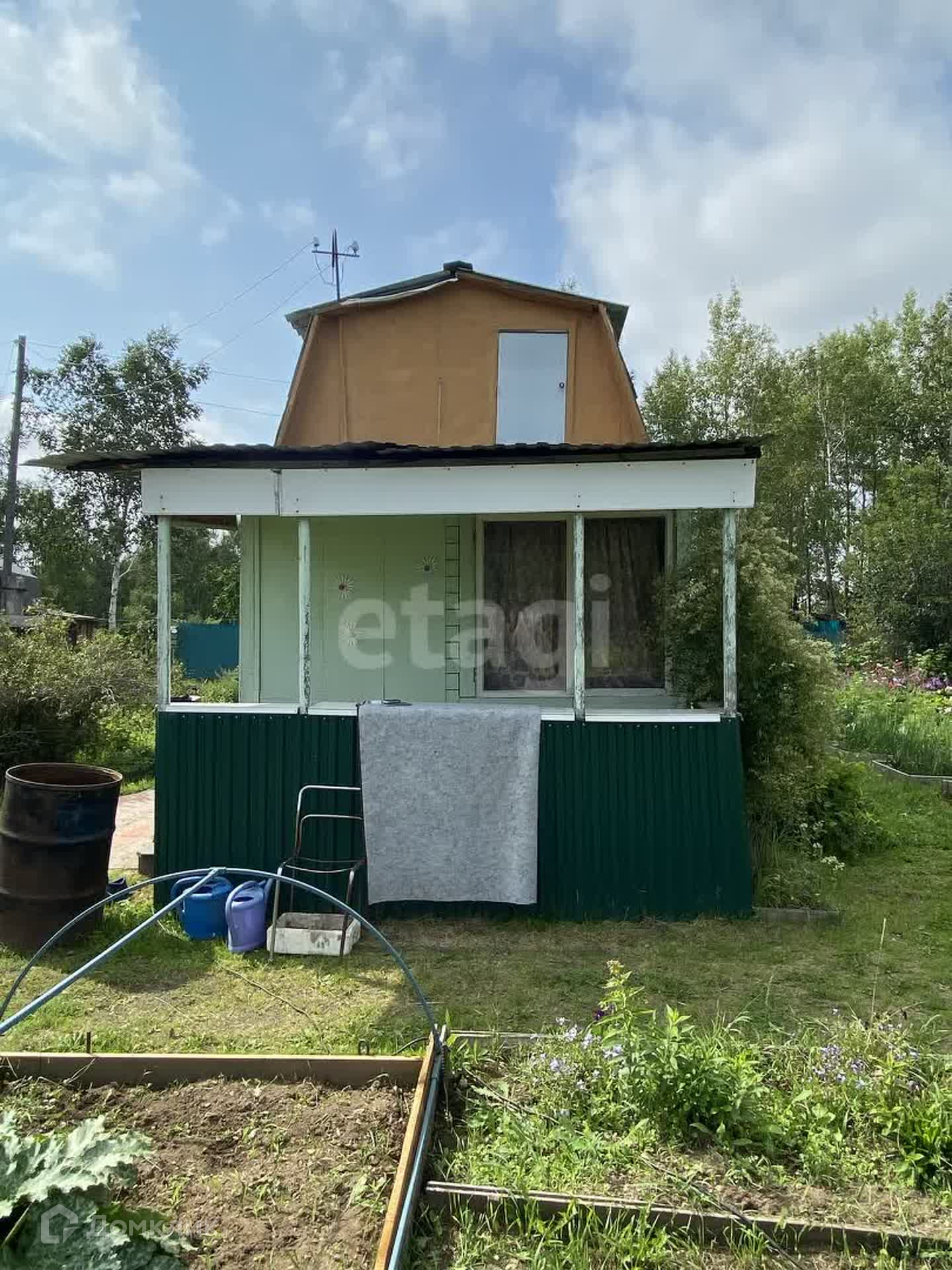 На участке построен двухэтажный дом с верандой, а так же сарай и две теплицы.