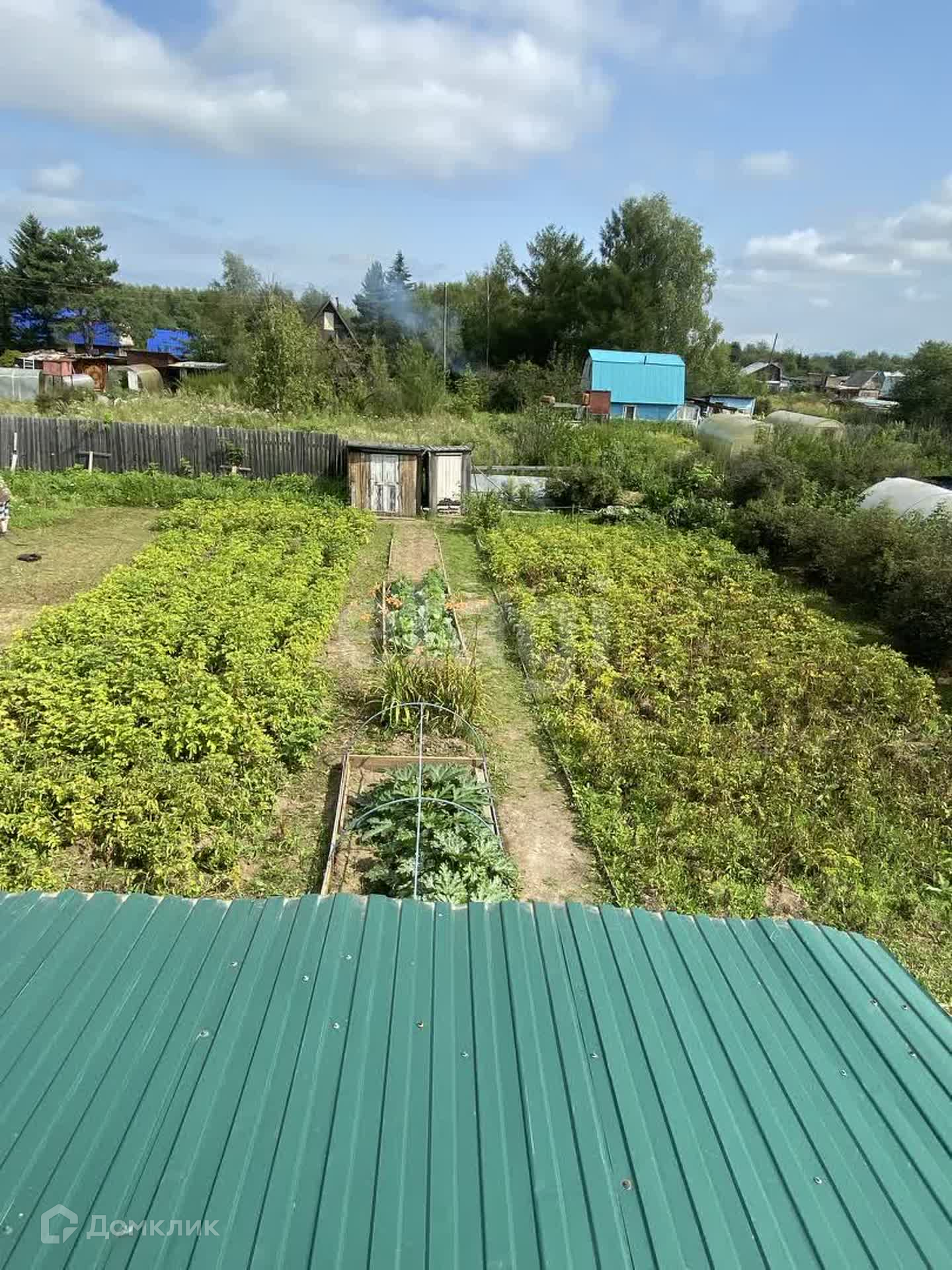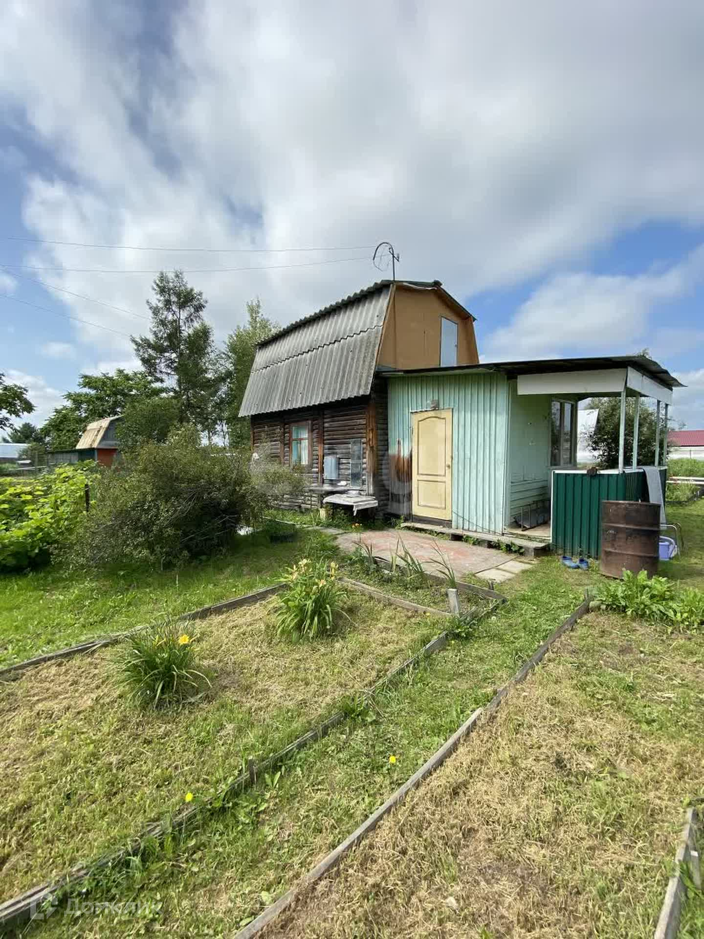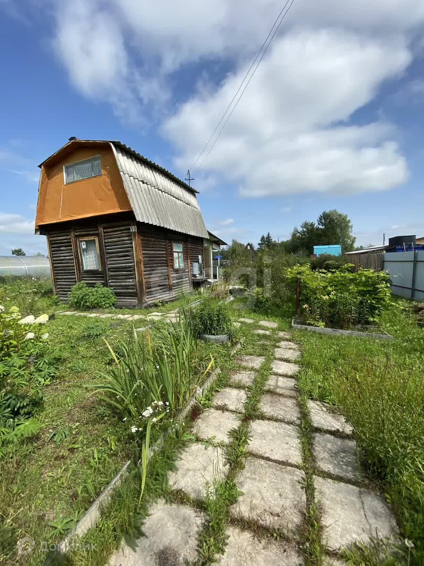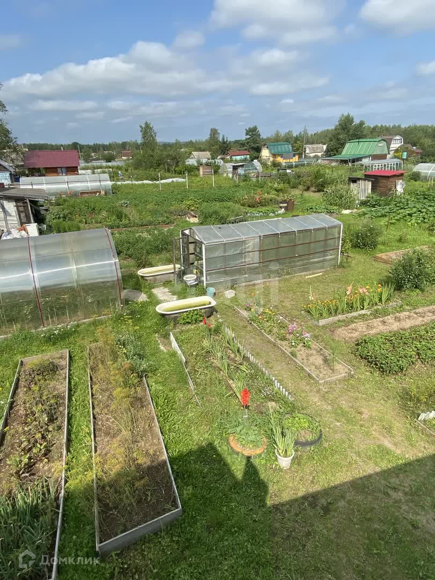 На участке построен двухэтажный дом с верандой, а так же сарай и две теплицы.