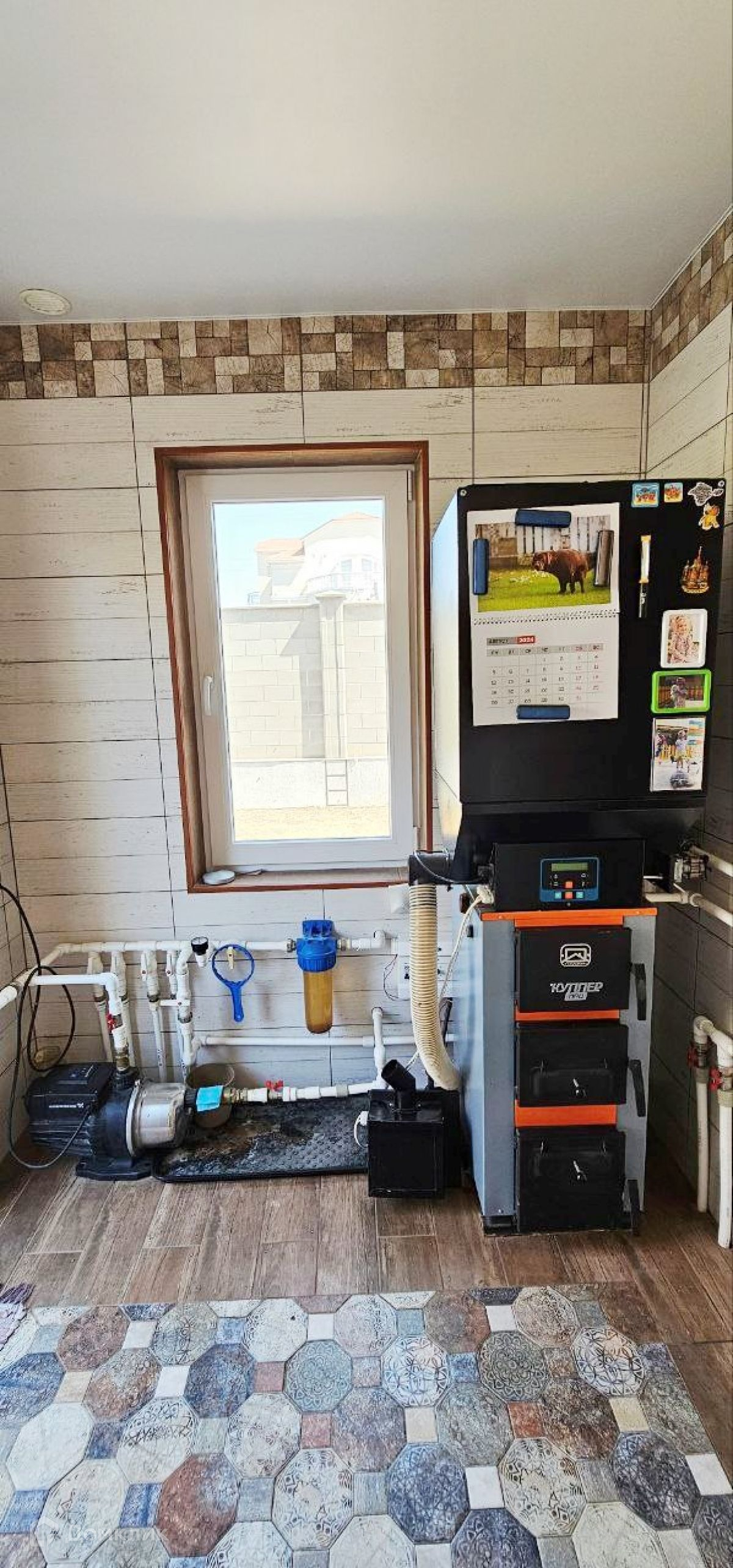 Отопление: Два котла, твердотоплевный и электро. (водяные тёплые полы по всему дому)