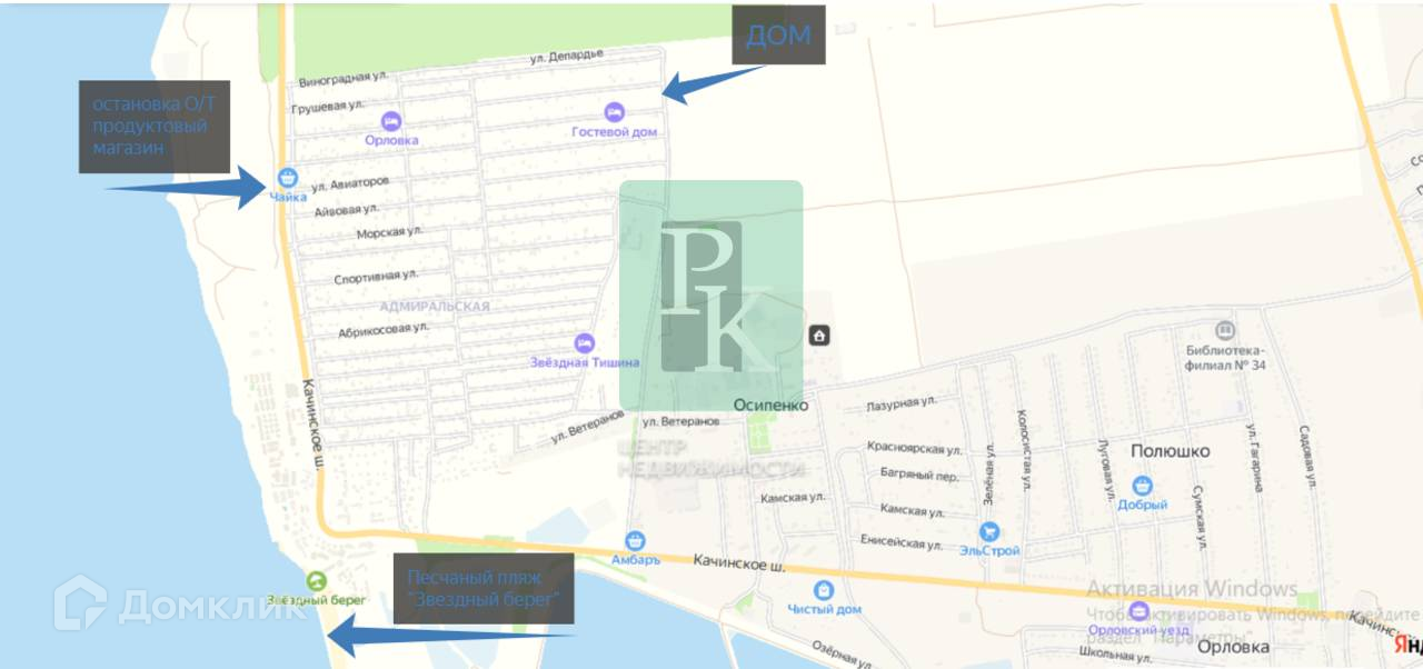 Дом находится вдали от городской суеты, но поблизости со всем необходимым для жизни. Рядом есть остановка общественного транспорта (800м) и море с пляжами (1500м). В соседнем поселке, Кача, до которого 4 км, расположены: рынок, большие продуктовые магазины, школа, банк, МФЦ, автостанция, церковь, спорт площадки. До Севастополя - 25 км, а до пл. Захарова, откуда ходят катера до центра города – 12 км, или 20 минут на автомобиле.