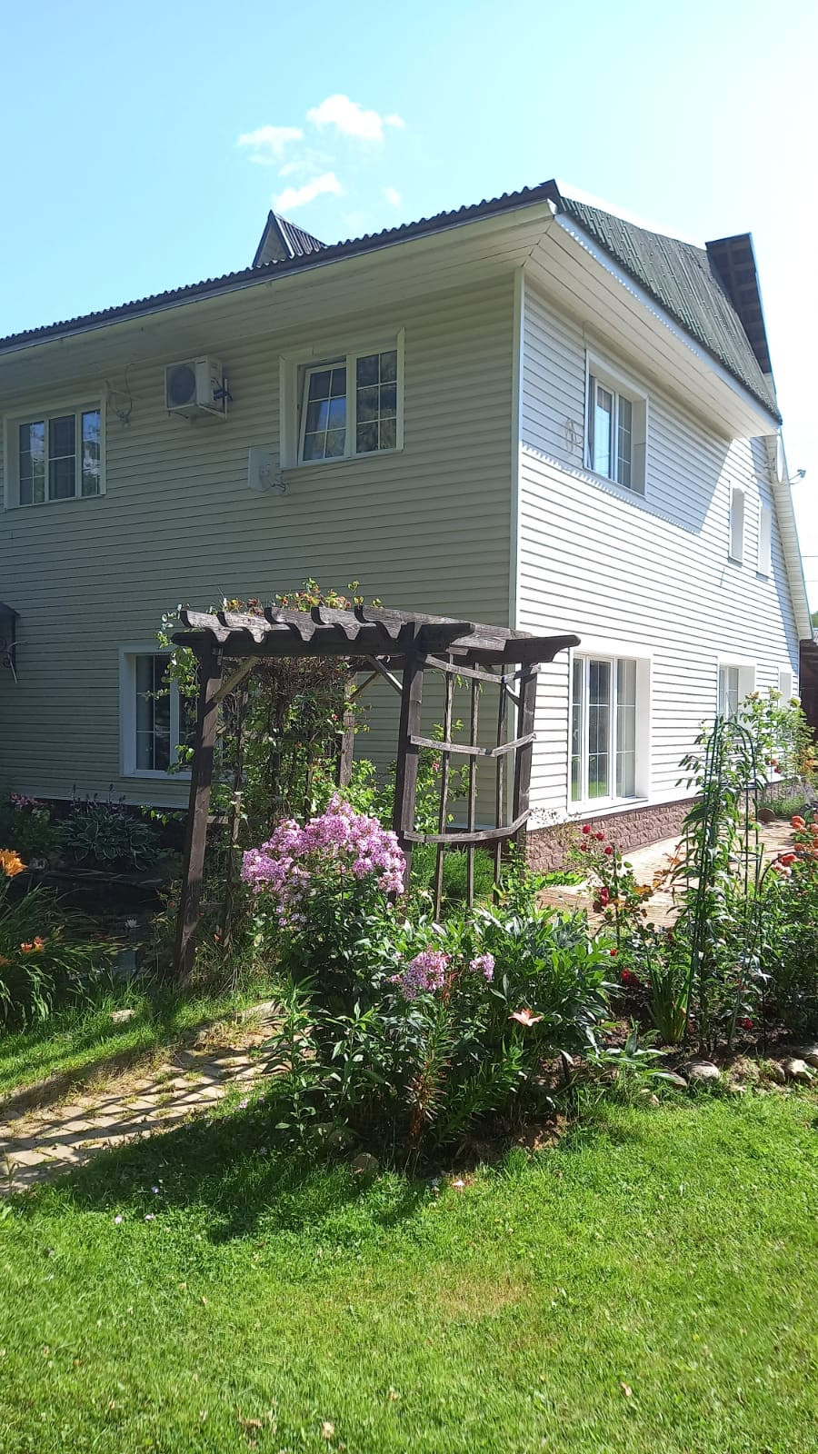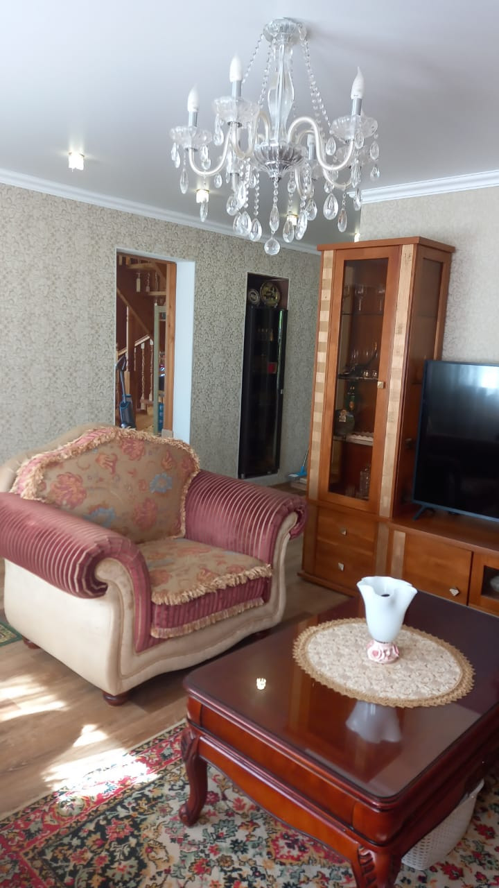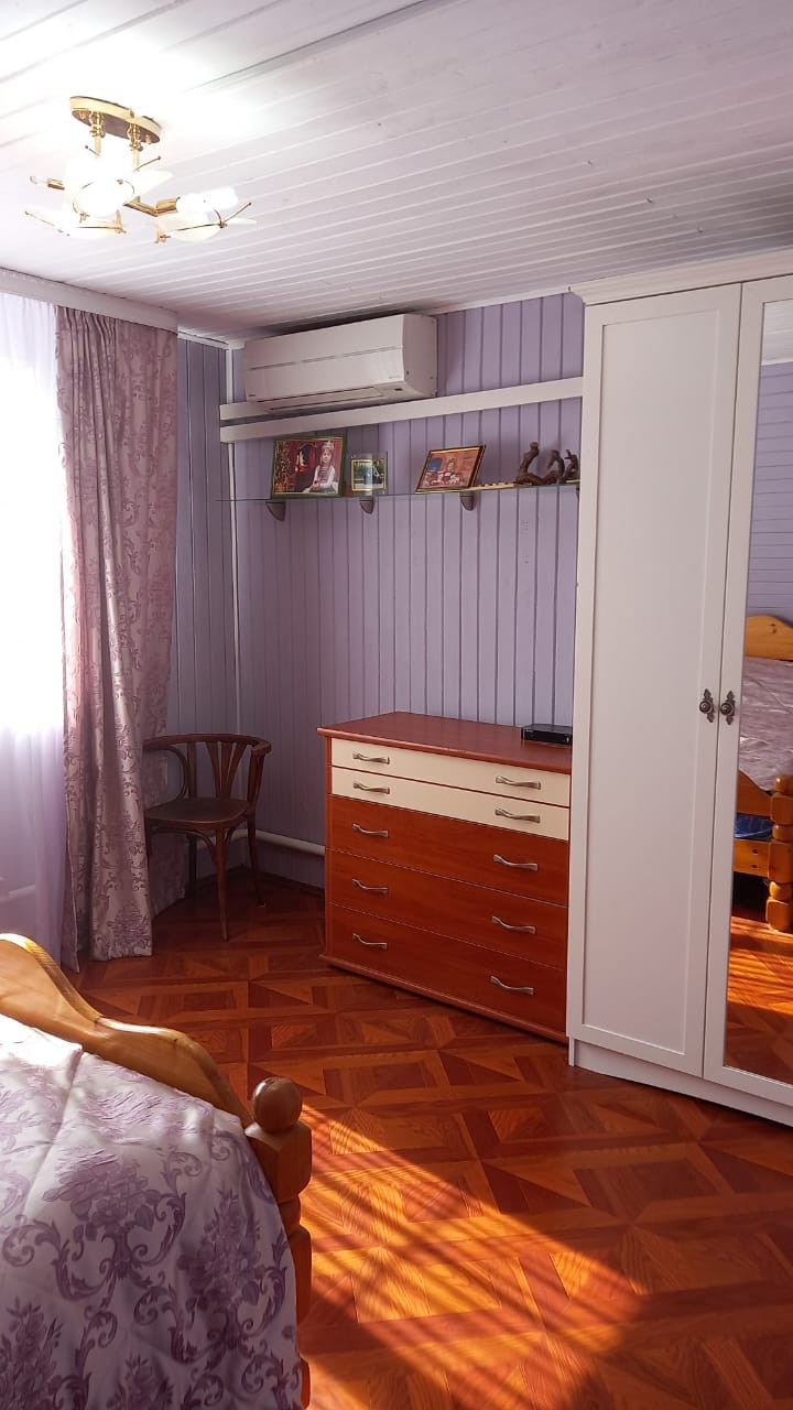Площадь дома примерно 170 кв из пеноблоков. Количество этажей 2. Два санузла в доме (на первом этаже установлена душевая кабина, на втором только унитаз и раковина). Отопление газовое, во всех комнатах установлены батареи. Скважина на участке глубиной 14 метров. В доме горячая и холодная вода. Площадь участка по документам 10 соток, а по факту 13 точно. На участке есть точки летнего водопровода. Баня из сруба 6х9, вода и освещение внутрь заведены. Внутри бани есть купель. Есть подсобное помещение площадью 38 кв.м с погребом. Разделена на летнюю кухню и подсобное помещение. На участке установлена теплица на фундаменте с автоматическим поливом внутри. Две парковочные зоны со своими воротами (на одно машиноместо и на три машиноместа). Участок ровный и ухоженный. Зона отдыха с прудом. Установлены кондиционеры на втором этаже в двух спальнях и на первом этаже в кухне-столовой.