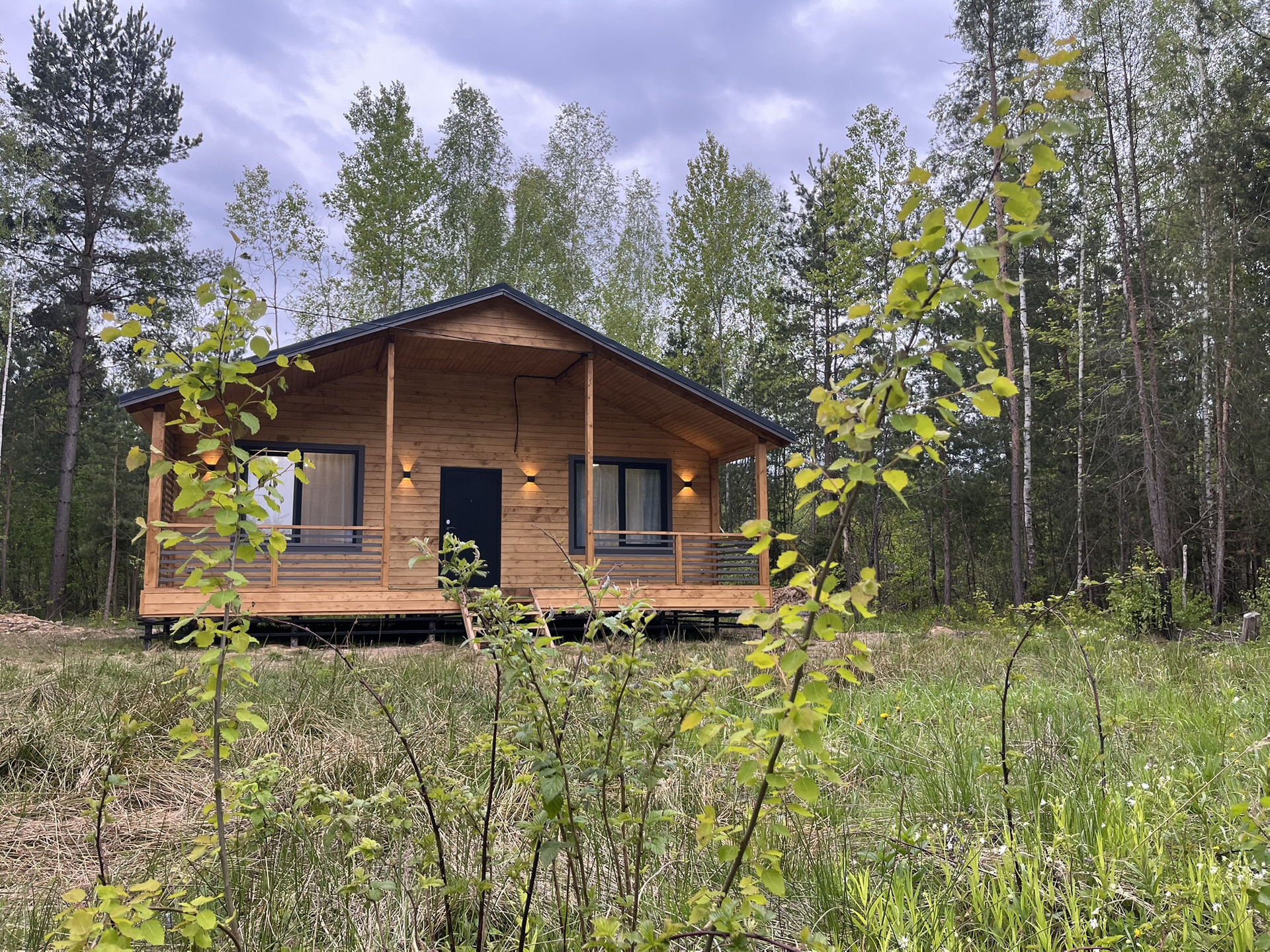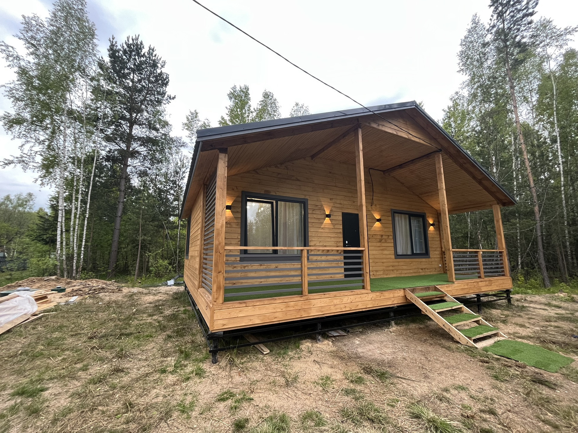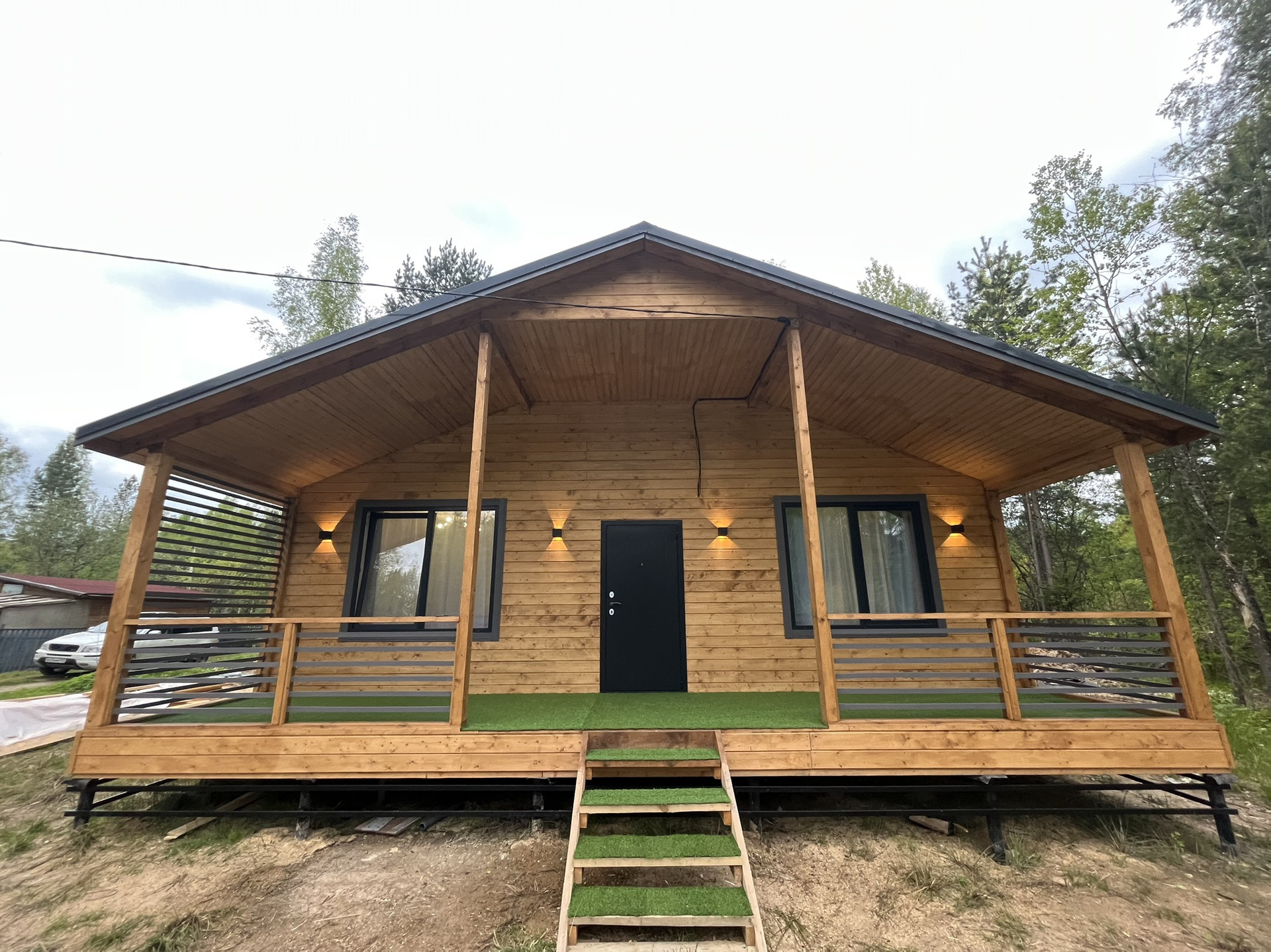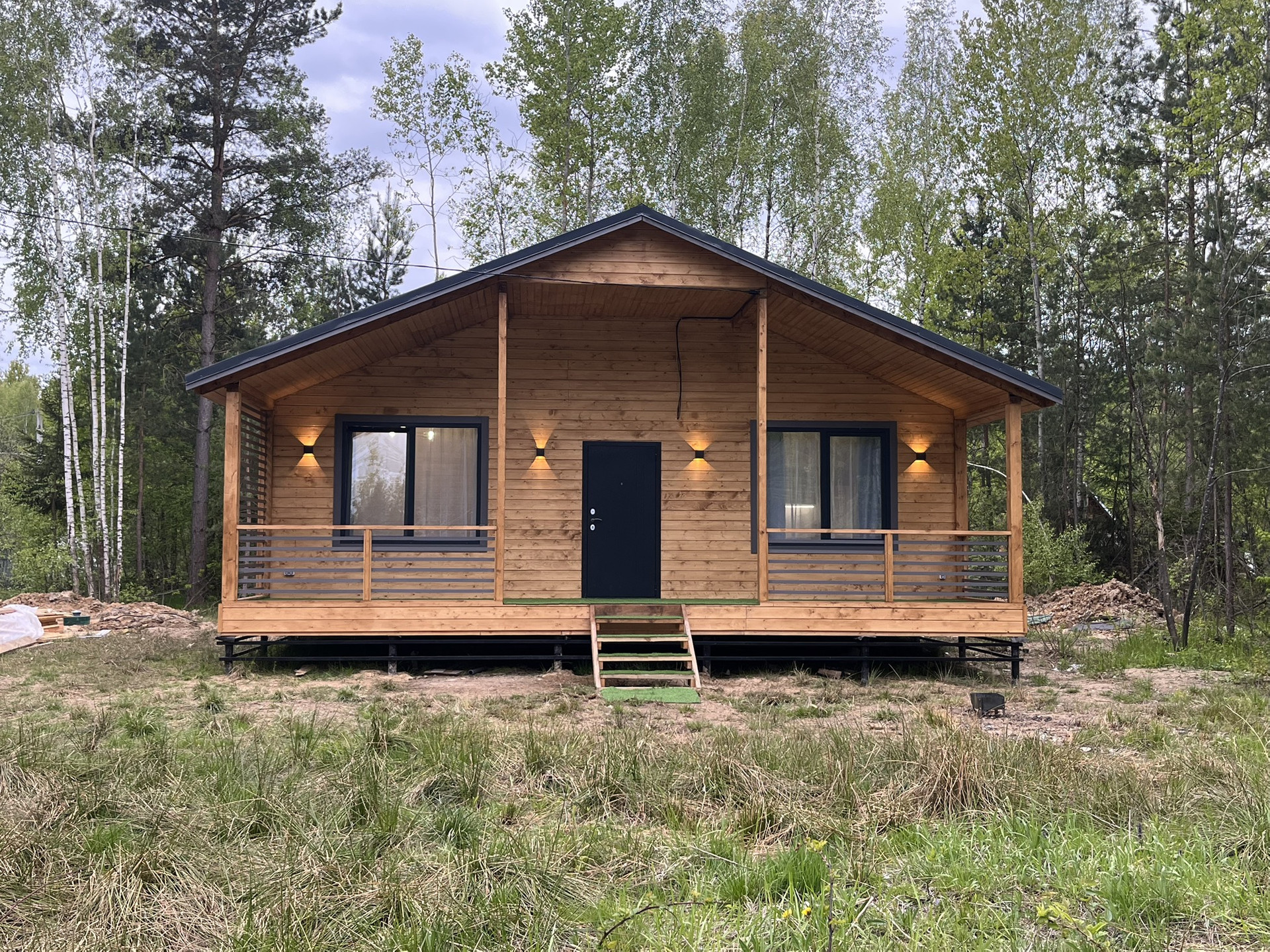 Дом 9,30 м. на 8,0 м. Ширина веранды 2 метра. Внешняя и внутренняя отделка -имитация бруса. Крыша металлочерепица, окна увеличены. Дом подходит для круглогодичного проживания. Утепление 150 мм. Вода в доме. Электричество 15 кВт. Отопление электрическое, конвекторное. В доме две спальни, кухня-гостиная, совмещенный санузел.