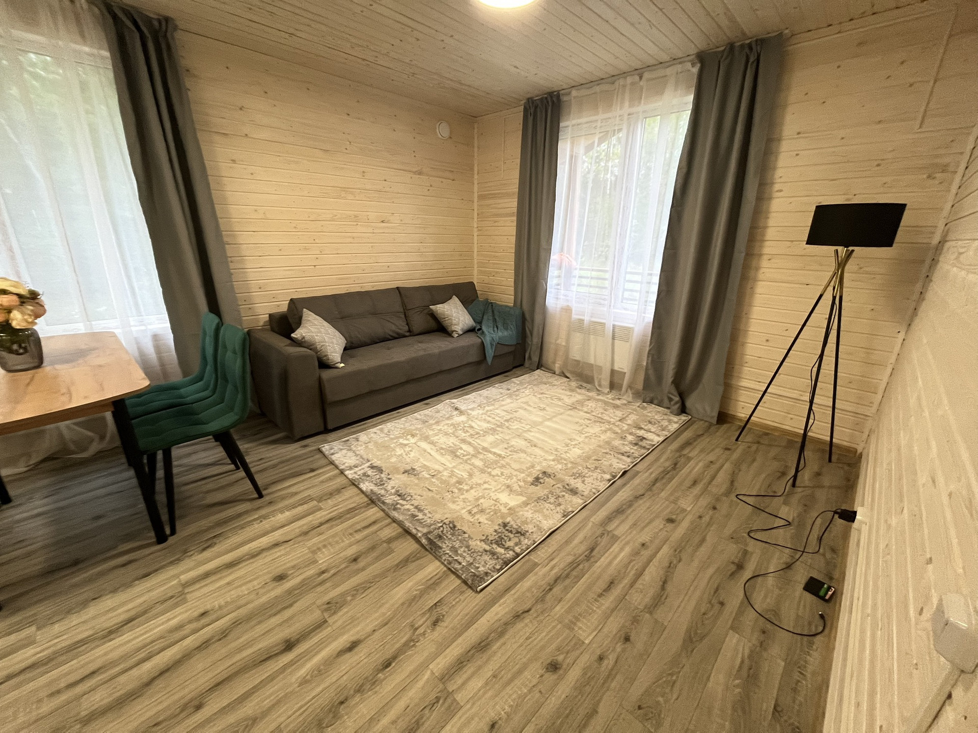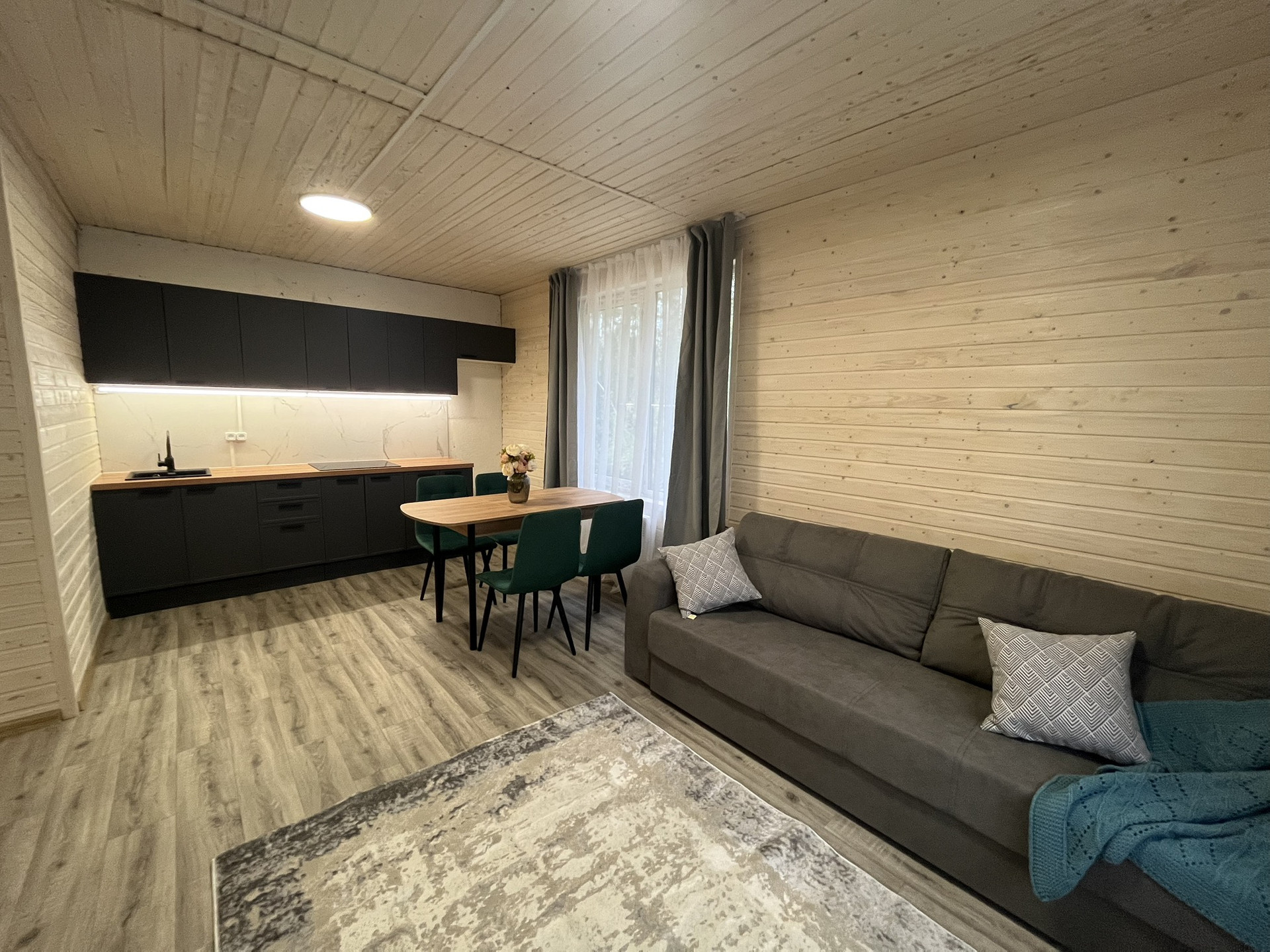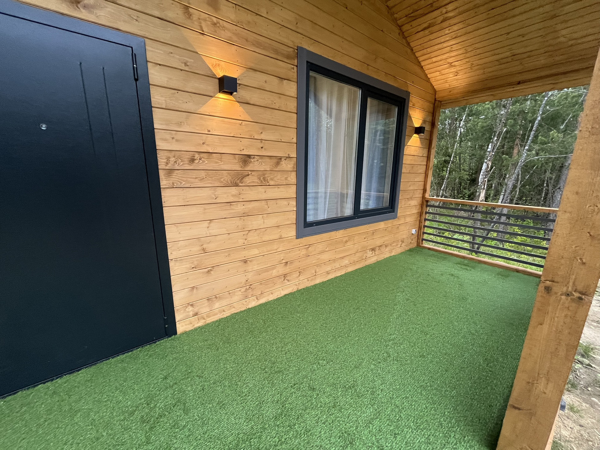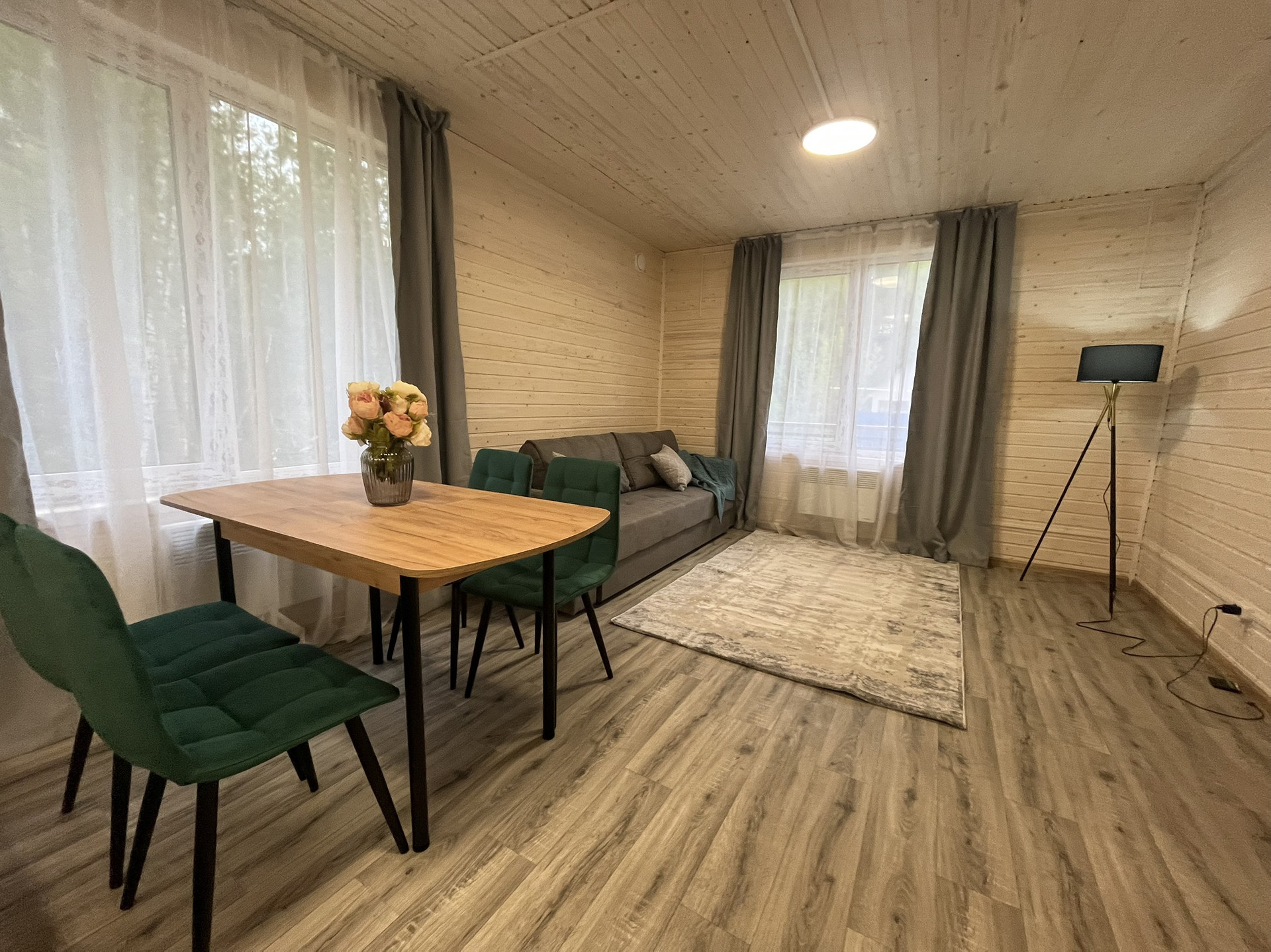 Дом 9,30 м. на 8,0 м. Ширина веранды 2 метра. Внешняя и внутренняя отделка -имитация бруса. Крыша металлочерепица, окна увеличены. Дом подходит для круглогодичного проживания. Утепление 150 мм. Вода в доме. Электричество 15 кВт. Отопление электрическое, конвекторное. В доме две спальни, кухня-гостиная, совмещенный санузел.
