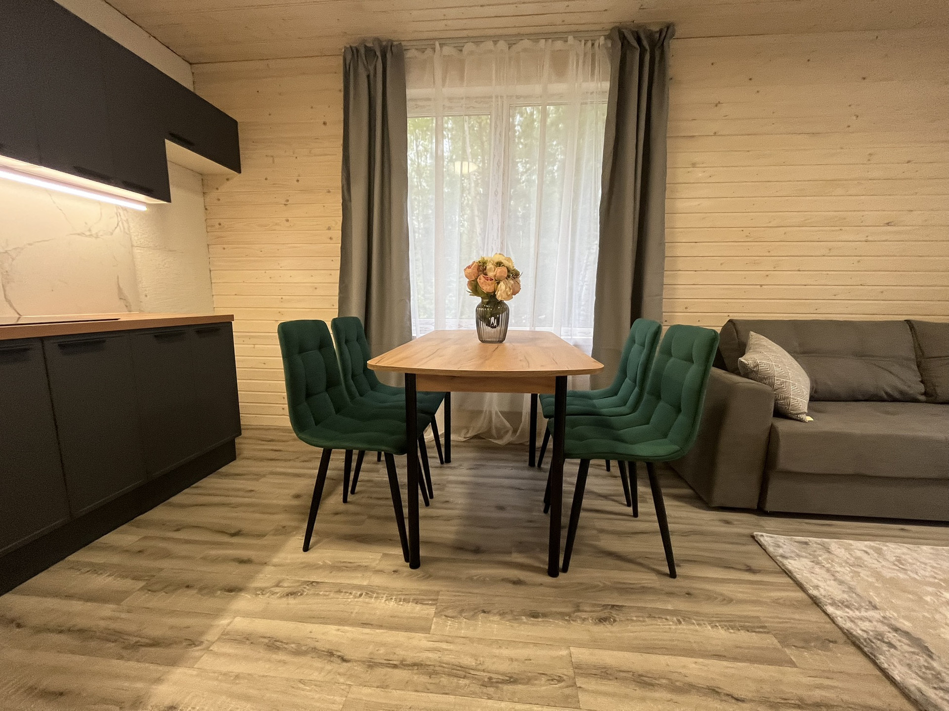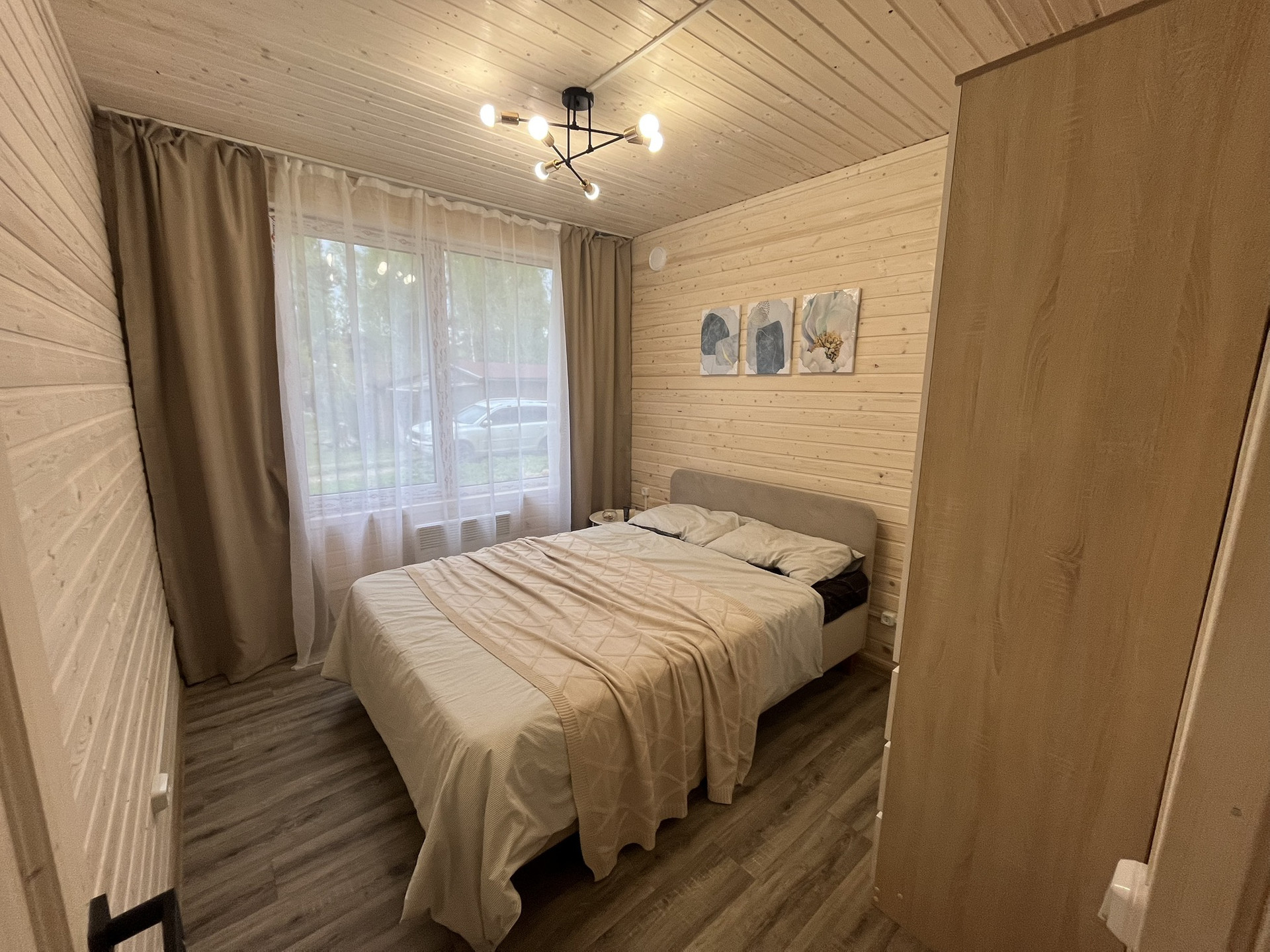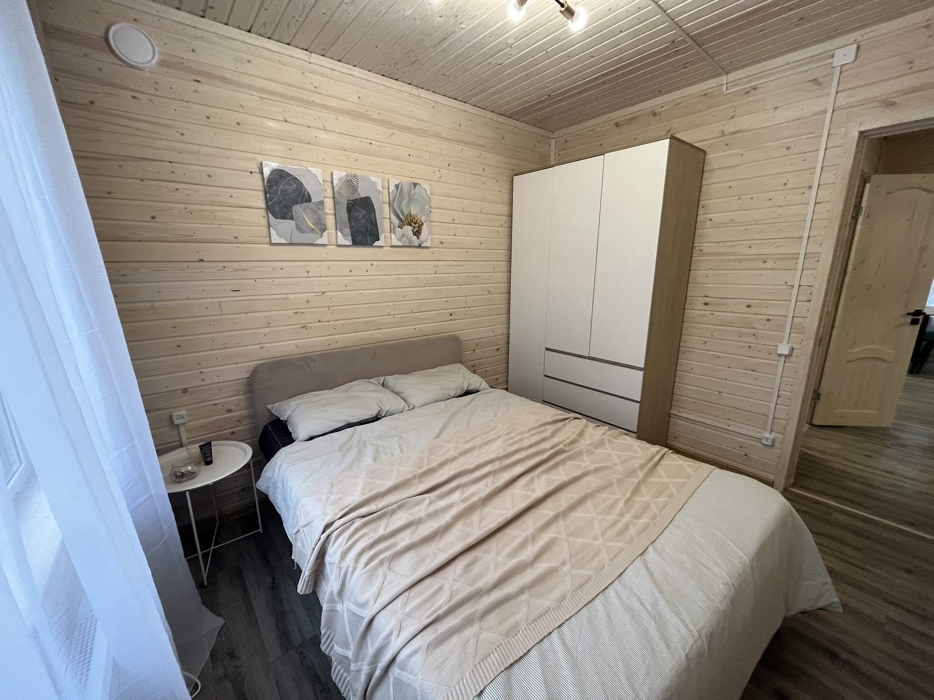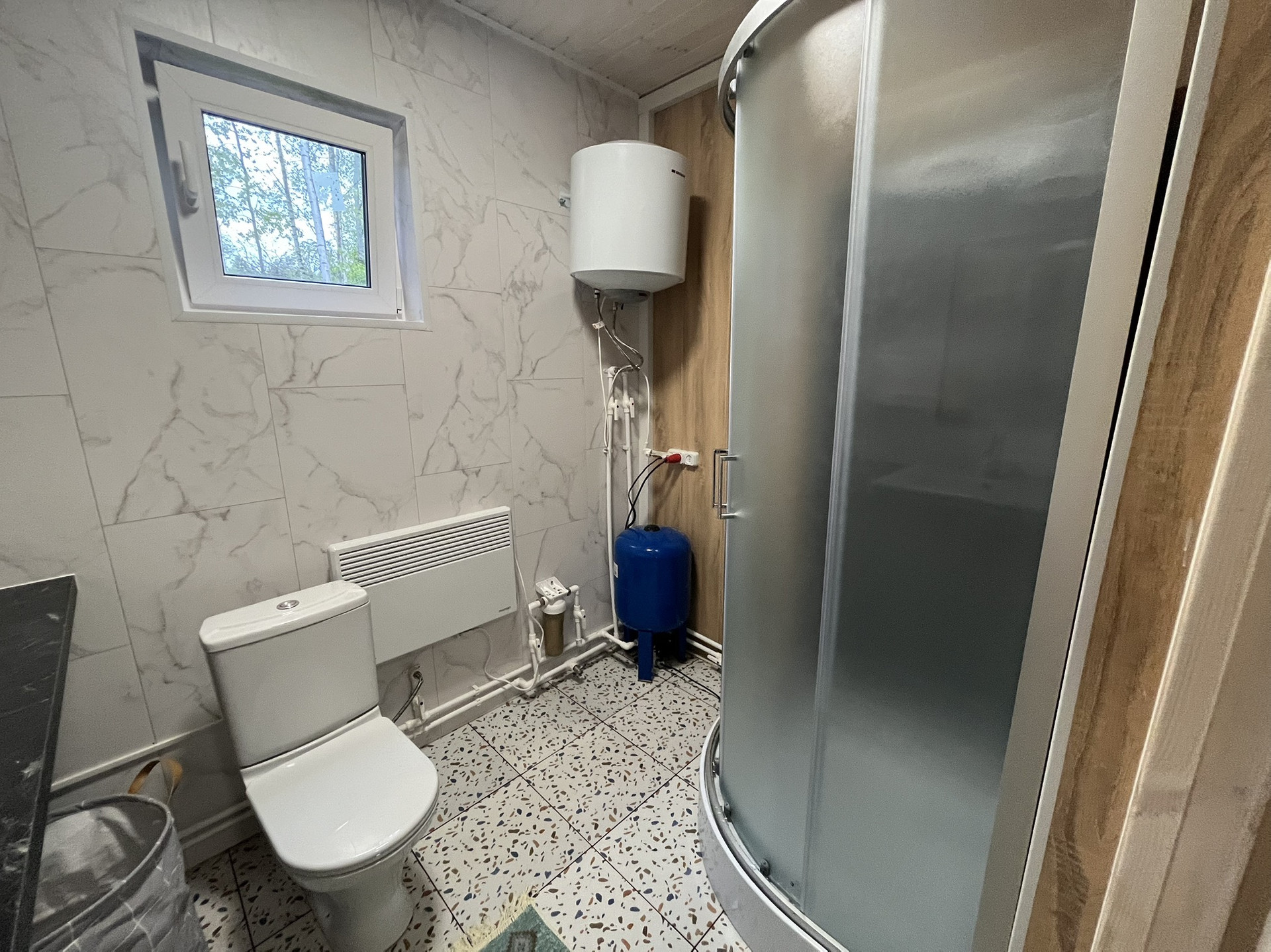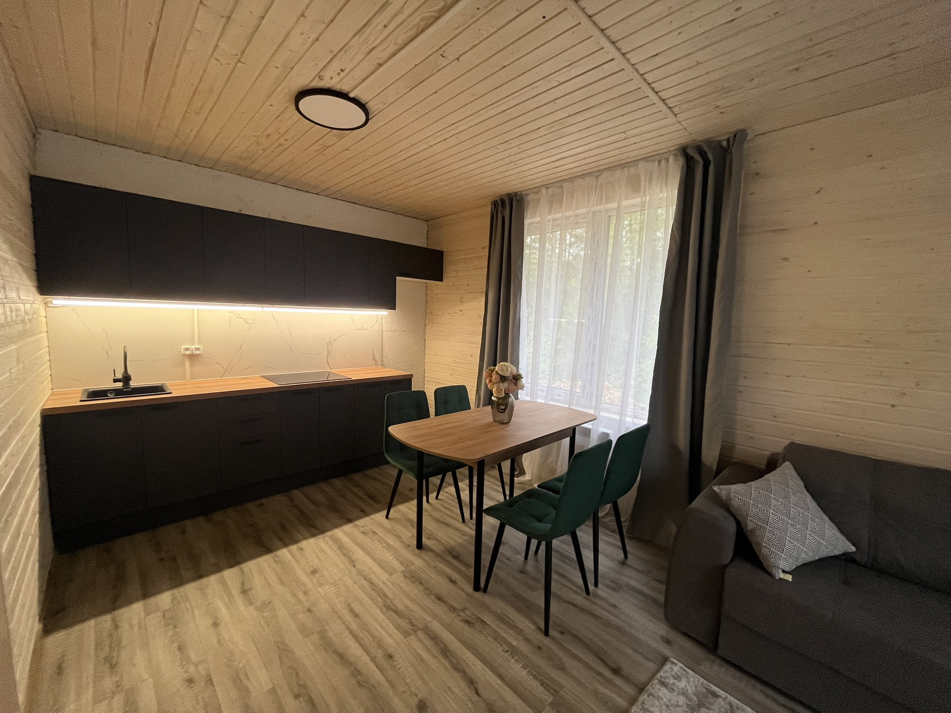 Дом 9,30 м. на 8,0 м. Ширина веранды 2 метра. Внешняя и внутренняя отделка -имитация бруса. Крыша металлочерепица, окна увеличены. Дом подходит для круглогодичного проживания. Утепление 150 мм. Вода в доме. Электричество 15 кВт. Отопление электрическое, конвекторное. В доме две спальни, кухня-гостиная, совмещенный санузел.