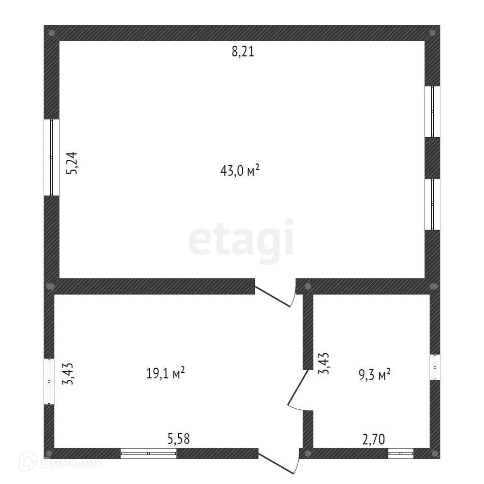 В доме большой зал 43 м2 и две спальни 9 и 19 м2, большая кухня и санузел со всеми удобствами.