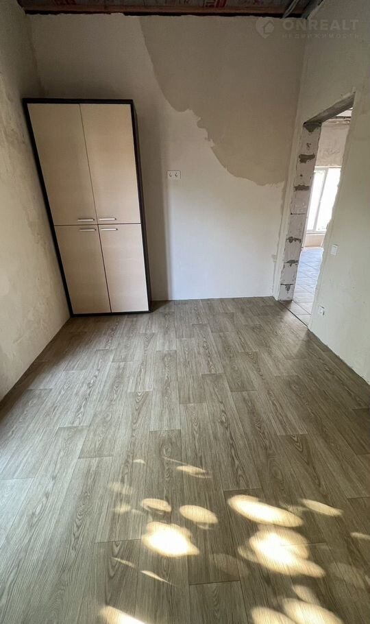 На полы кухни и ванной уложена плитка, в комнатах постелен утепленный линолеум, на стенах замыленная штукатурка, полностью готовая для поклейки обоев или же отделки декоративной штукатуркой.