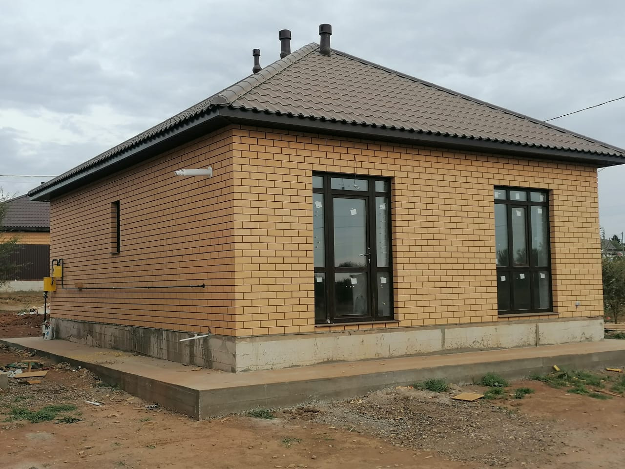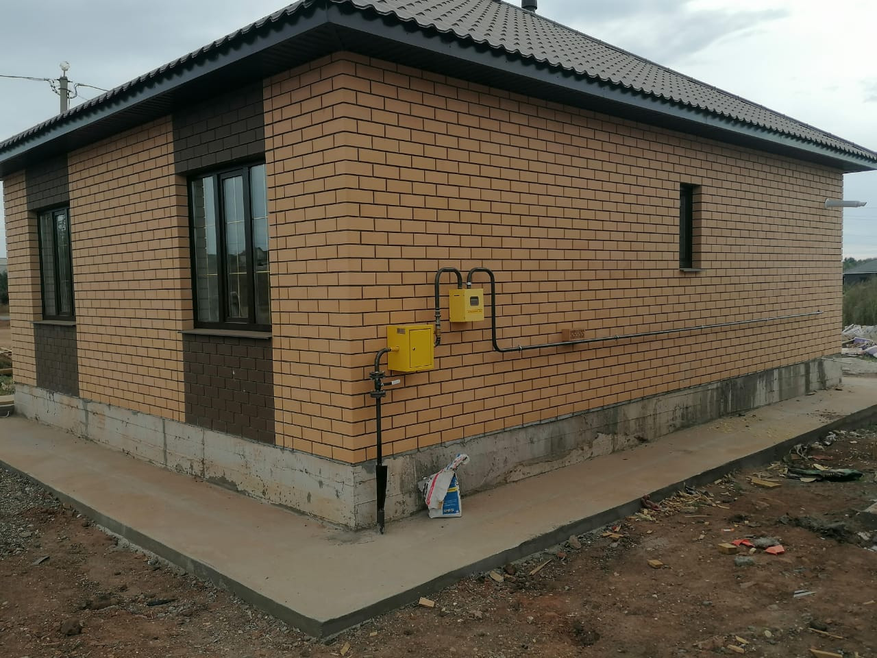- Стены: кирпич фасадный + утеплитель 50 мм. (полистирол) + блок Газоселикатный.- Кровля - металлочерепица