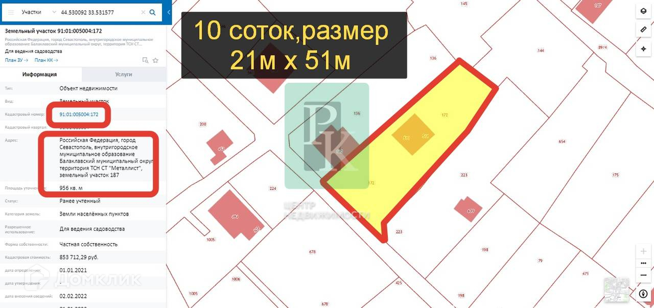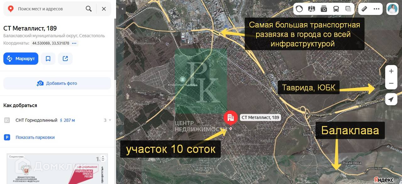 Участок 10 соток (СТ) расположен в г. Севастополь, Нахимовский район, ТСН СТ “Металлист”. Участок ровный, прямоугольной формы, без уклона. Подъезд асфальтированный.