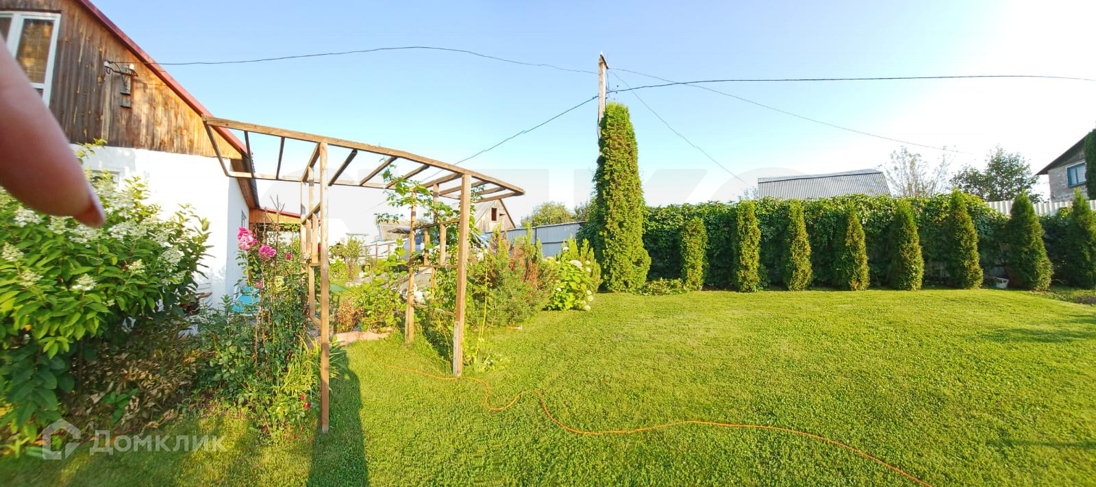 На участке плодовые деревья, различные цветы , туи, газон.