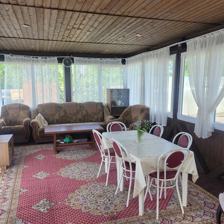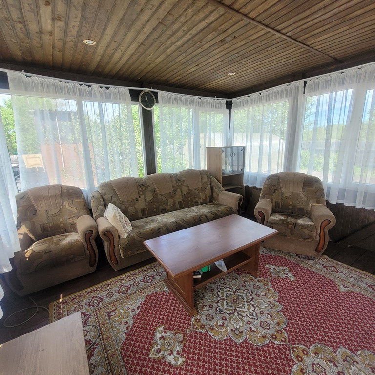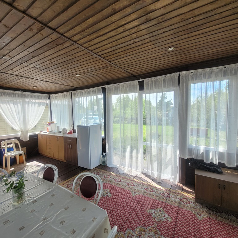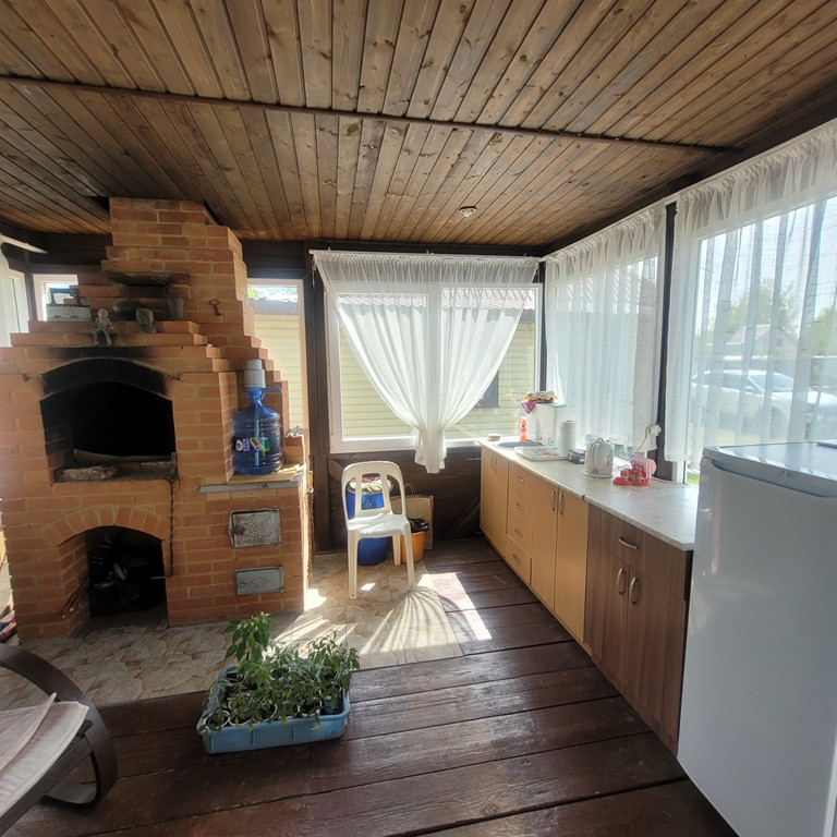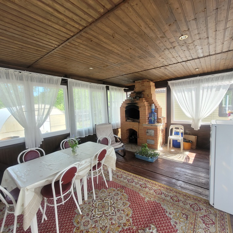 Большая летняя закрытая веранда, все четыре стороны которой представляют из себя пространство окон (стеклопакеты), часть которых можно открыть для проветривания и постоянного притока свежего вкусного летнего воздуха. Рабочая печь-барбекю. Обеденная зона и зона отдыха.