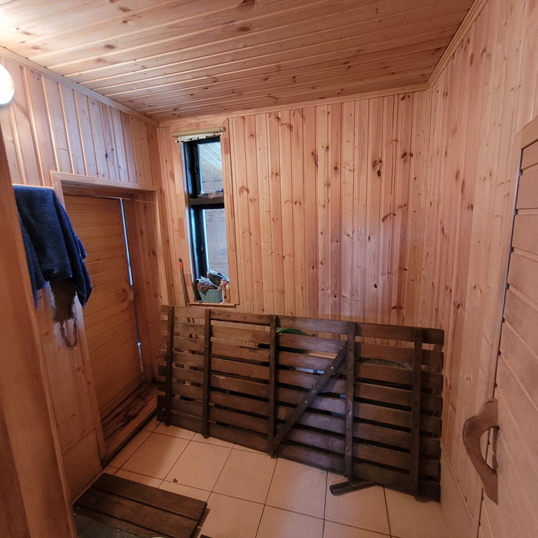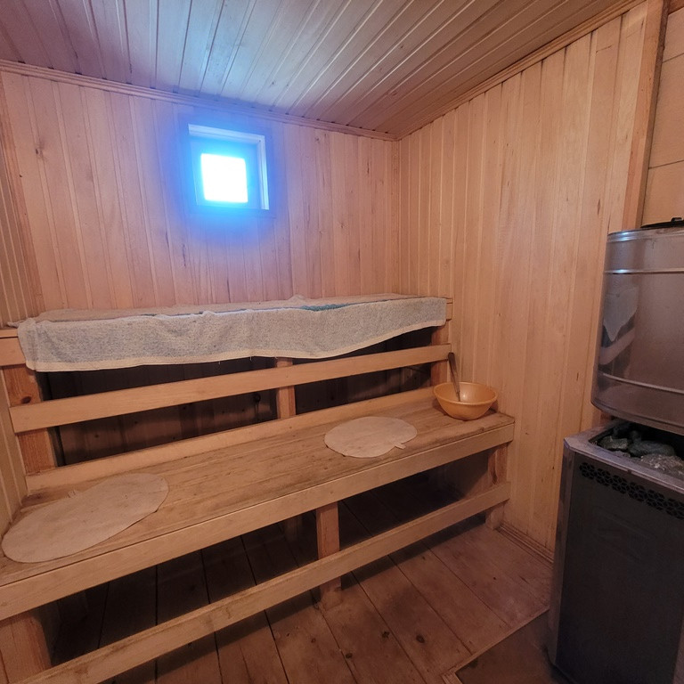 Баня начинается с прихожей, из которой один вход в комнату отдыха с предбанником и парилкой, второй вход в большую летнюю кухню-столовую, включающую в себя кухонную зону и зону отдыха. Стеклопакеты.