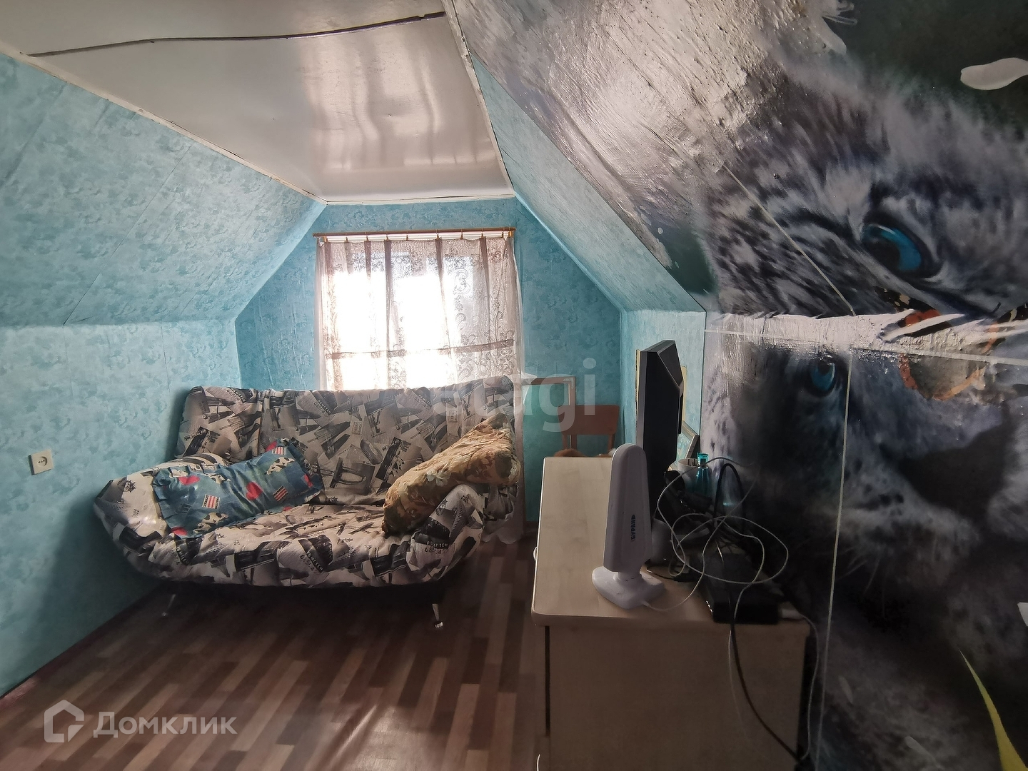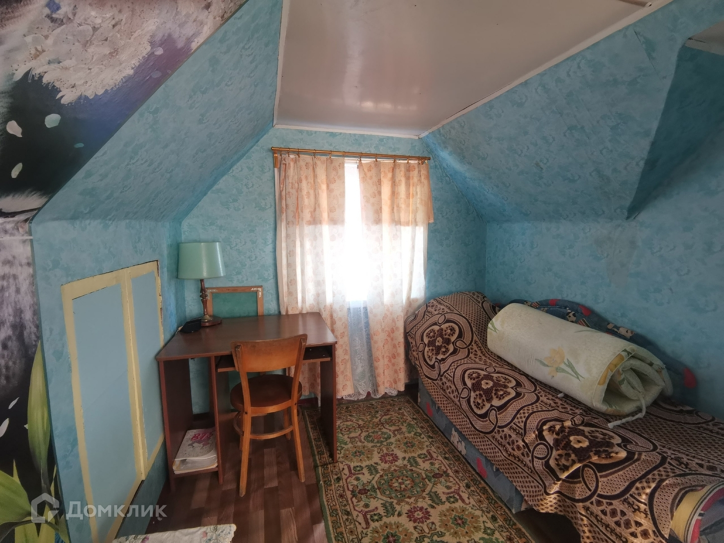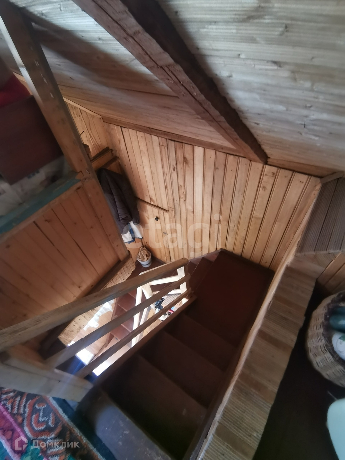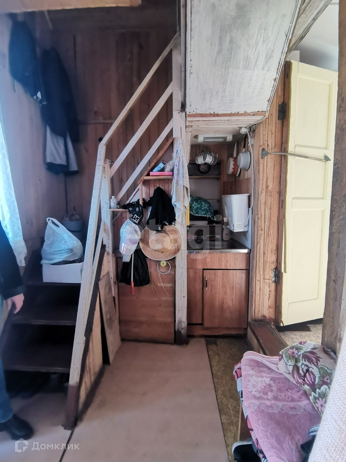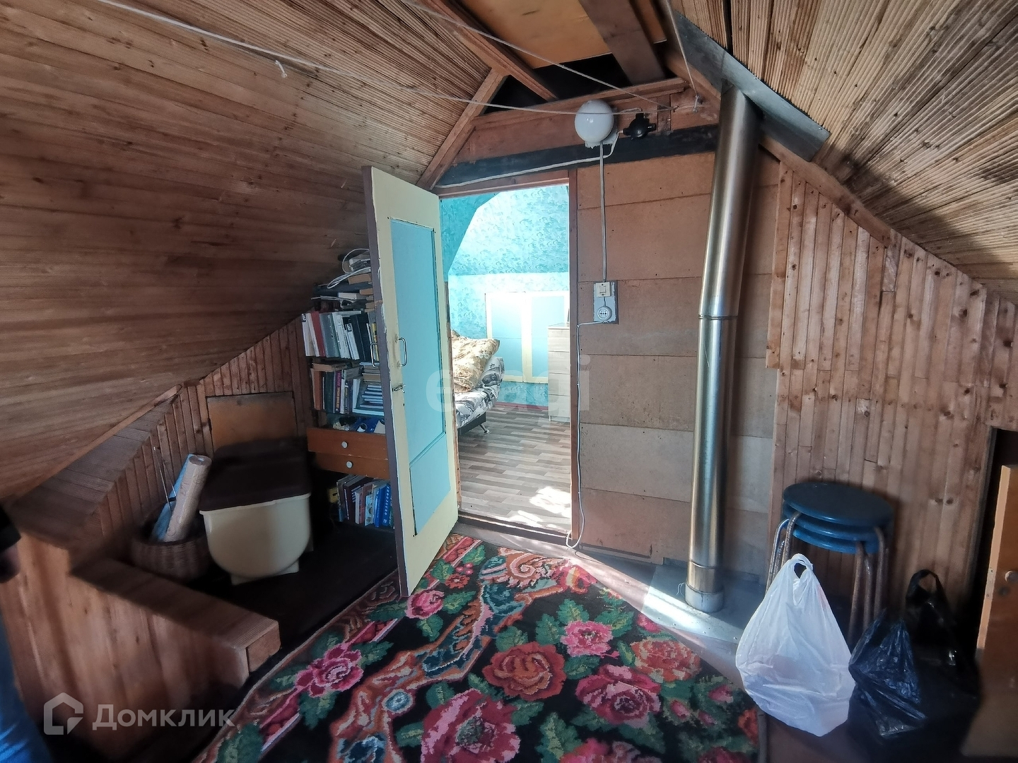 Дом 40 м2, фундамент ленточный, построен из бревна, отделка вагонкой. На первом этаже кухня и две комнаты, одна комната на втором этаже.