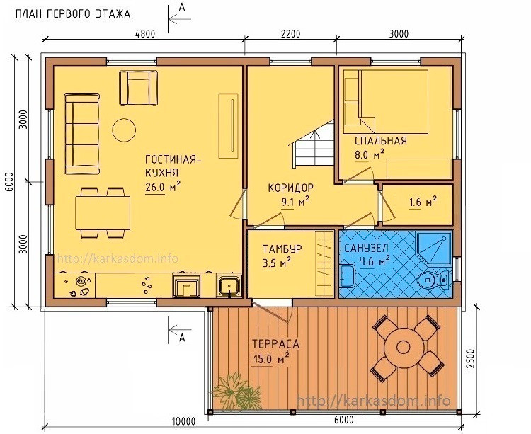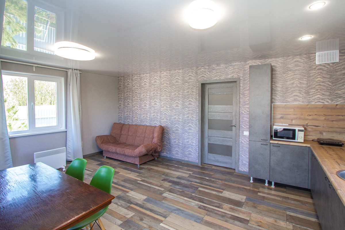 - 1 этаж – 67,8 кв.м. Перед входом просторная терраса 15 кв.м. (часть террасы занято под Хозблок), на входе в дом прихожая – тамбур 3,5 кв.м., слева огромный светлый зал и Большая кухня, которые образуют просторную светлую Студию с 3-мя окнами 26 кв.м., справа от входа совмещенный санузел 4,6 кв.м., туалет 1,6 кв.м. и кабинет 8 кв.м.