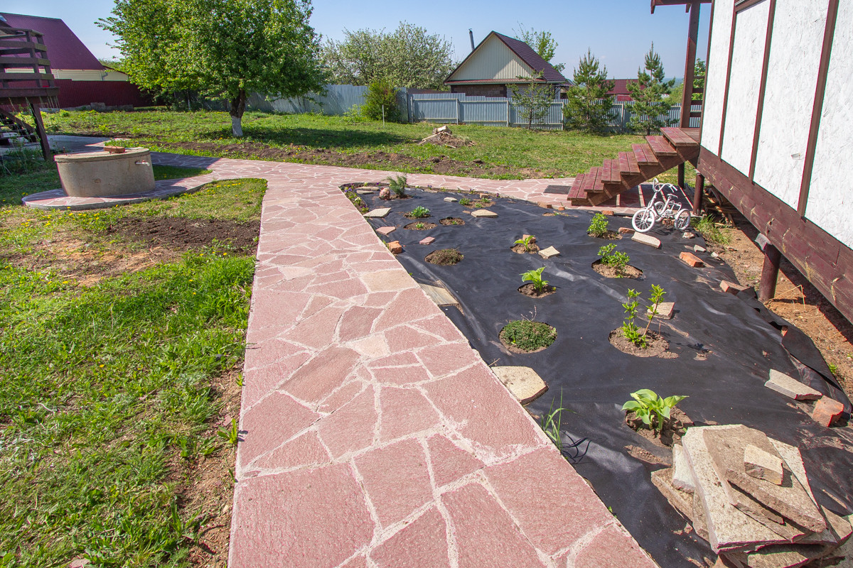 Дорожки на участке из плитняка красного. Перед участком сделаны парковочные места на 2-3 авто. За ворота на территорию еще 2 машины можно поставить.